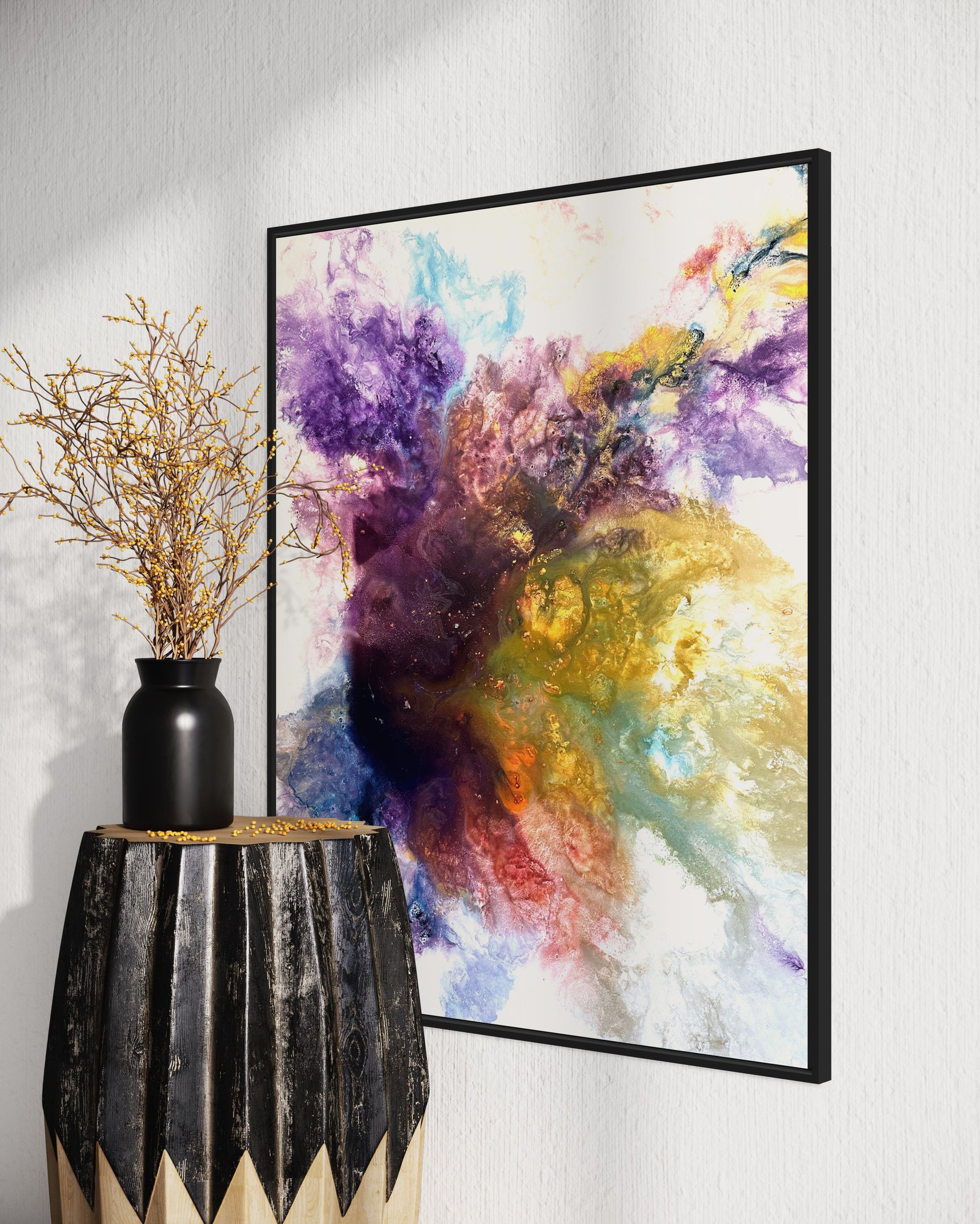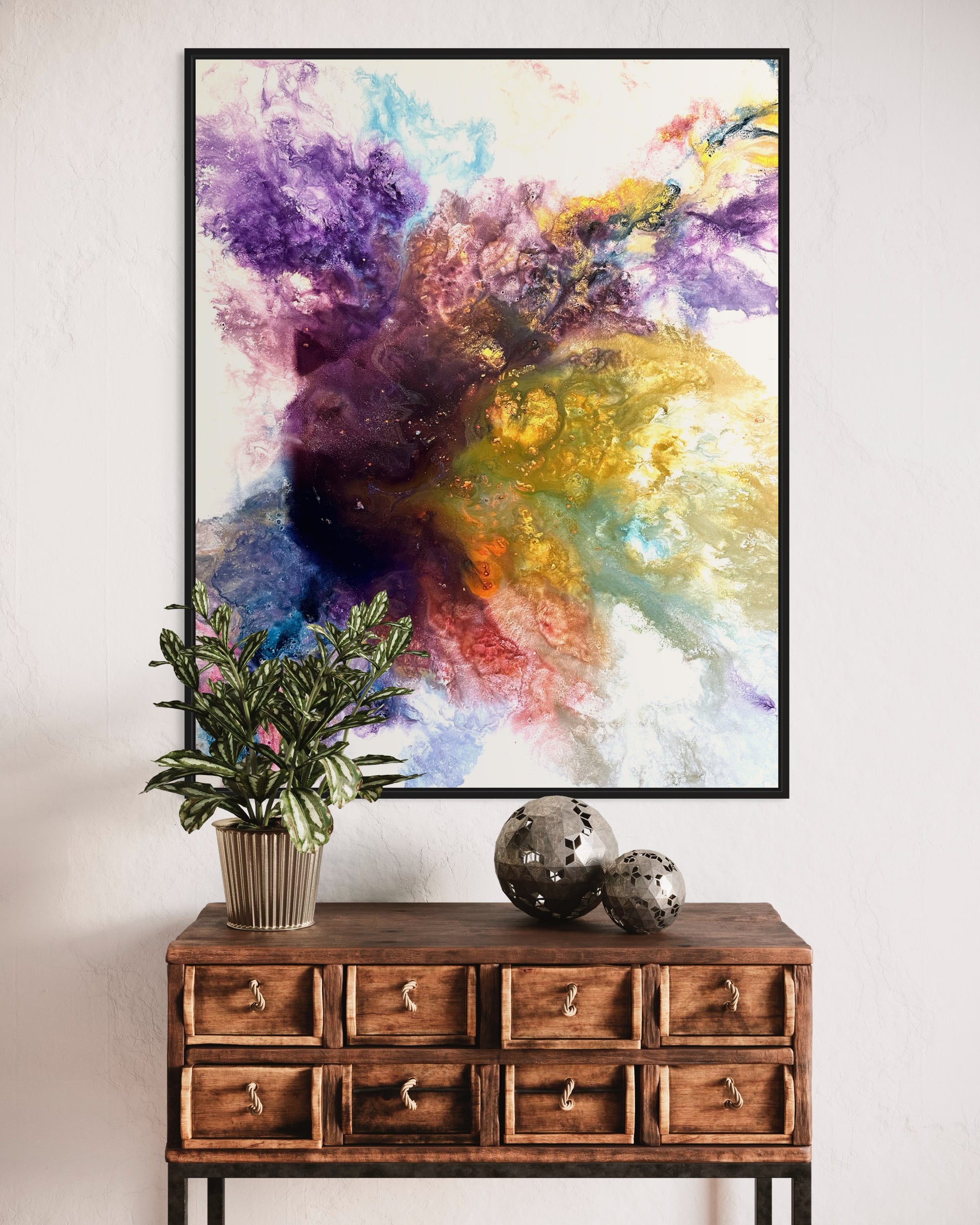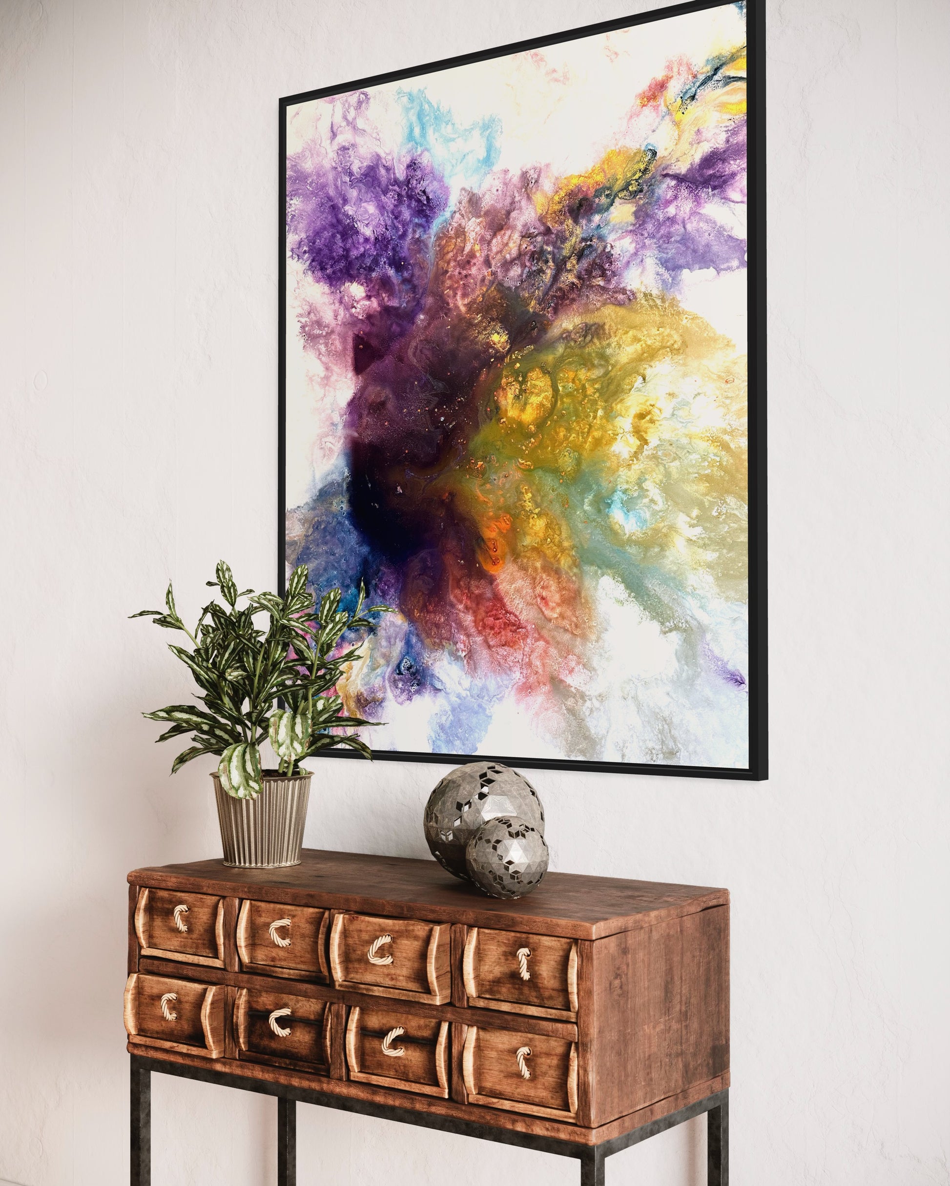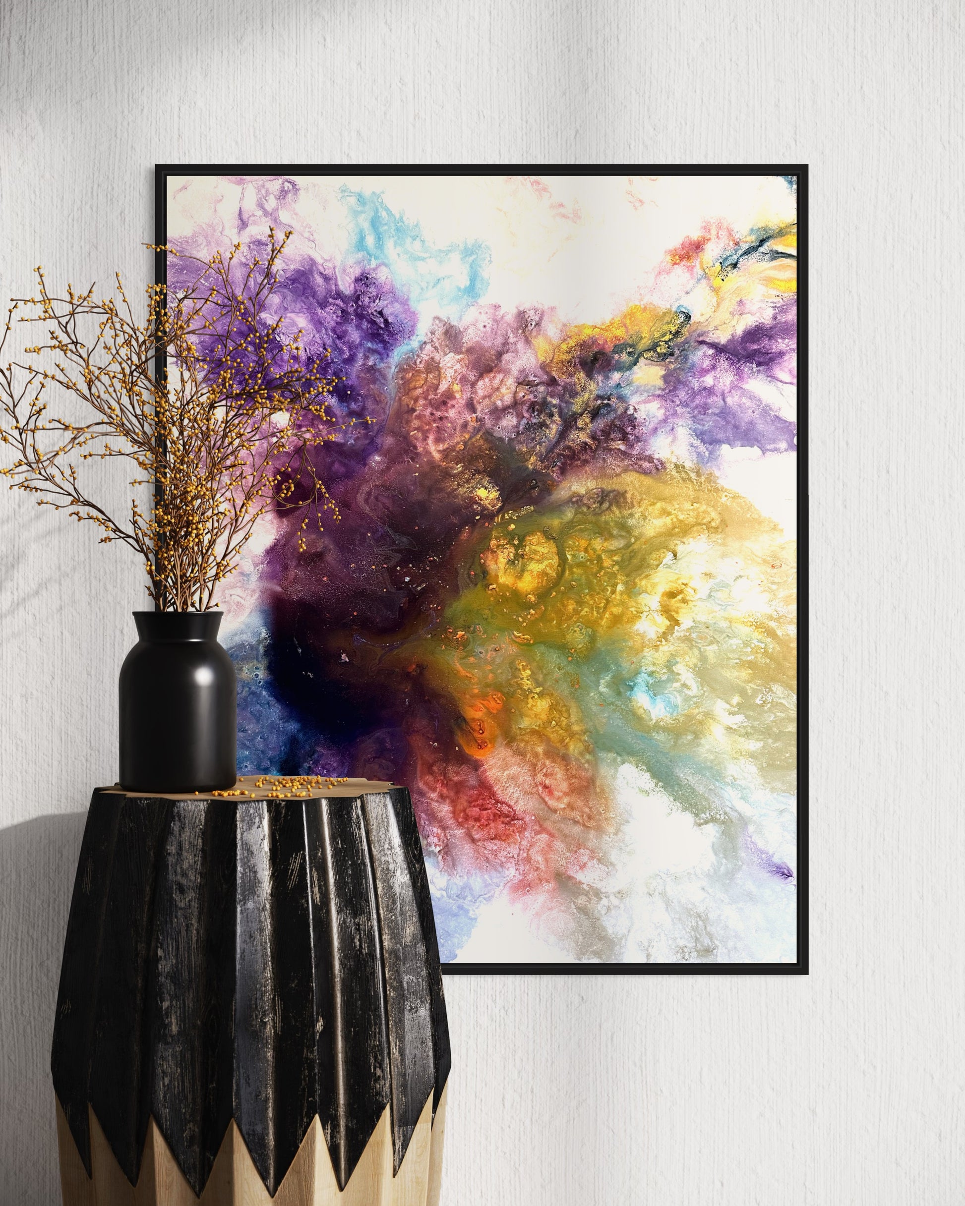Jedes Detail dieser abstrakten Meisterleistung wird durch den sorgfältig gewählten schwarzen Rahmen hervorgehoben, der dem Gemälde einen Hauch von Eleganz verleiht. "Butterfly's Embrace" ist nicht nur ein Kunstwerk, sondern eine visuelle Reise durch deine künstlerische Kreativität und Ausdruck.