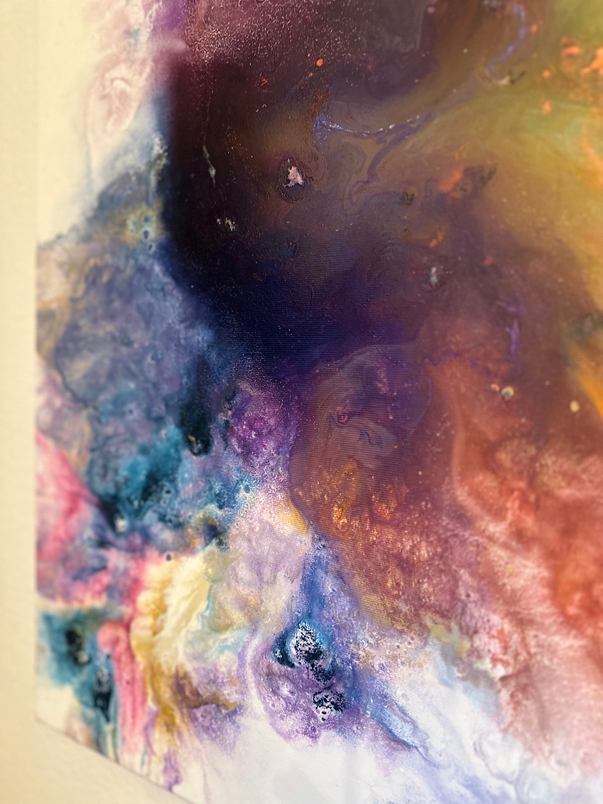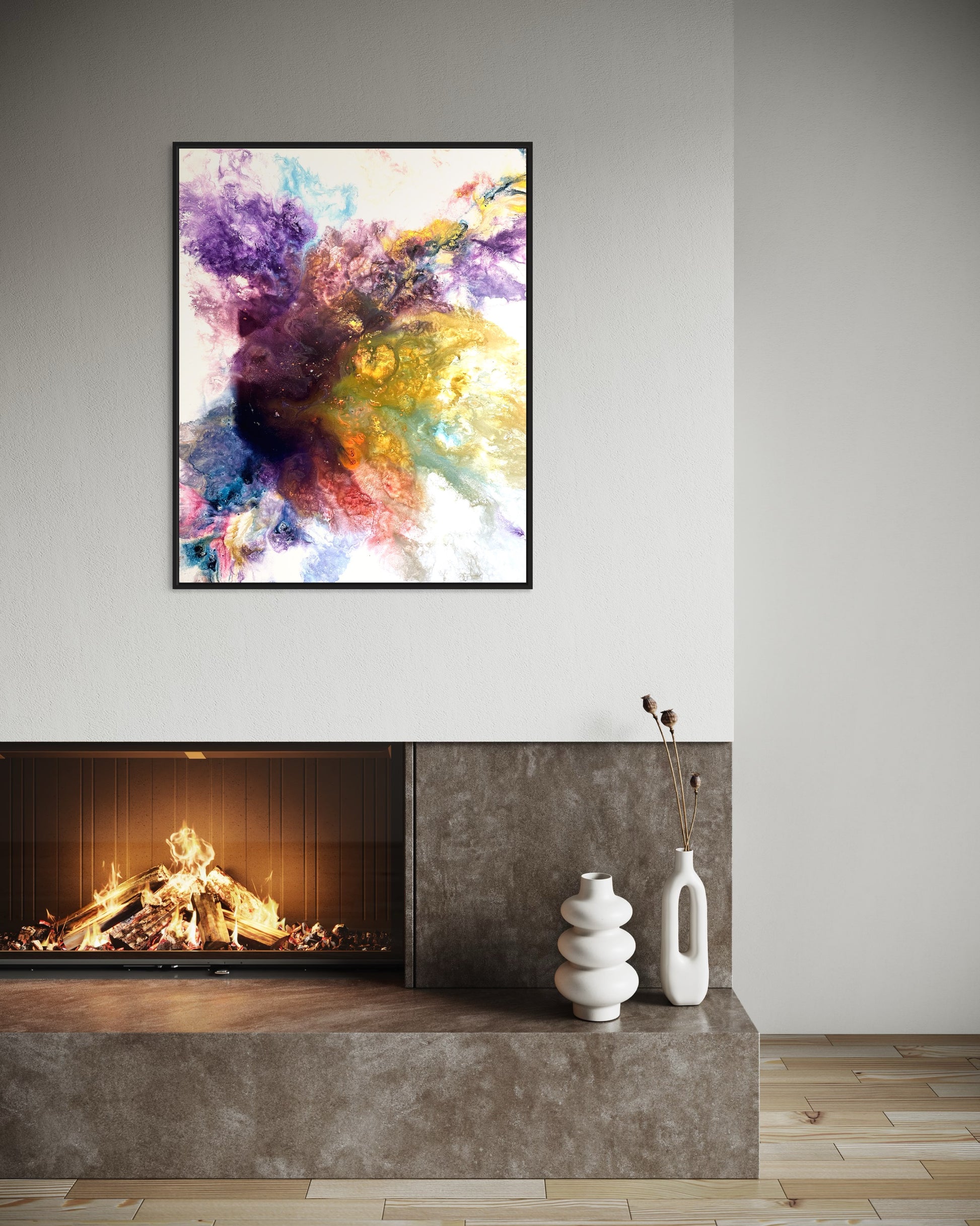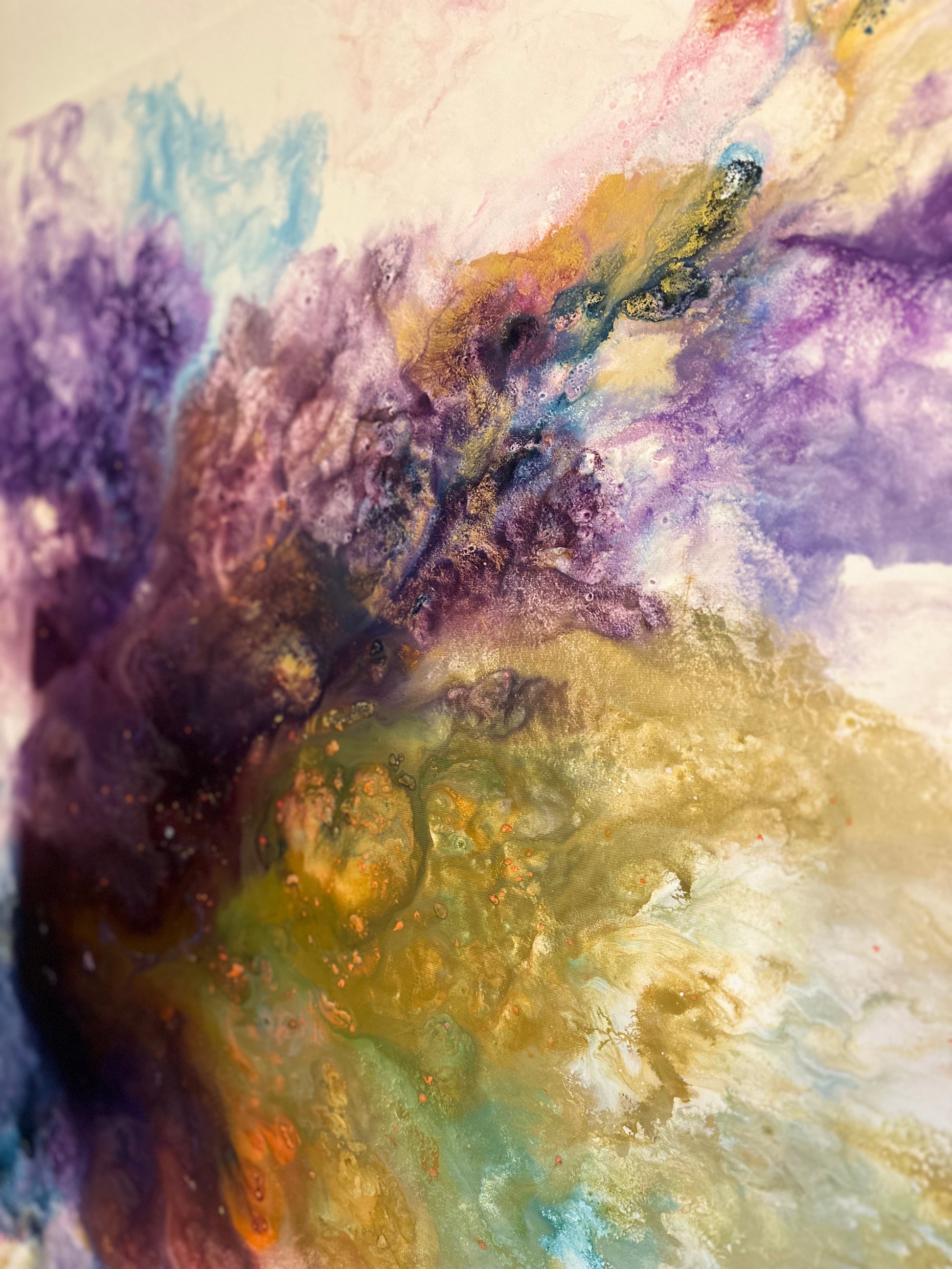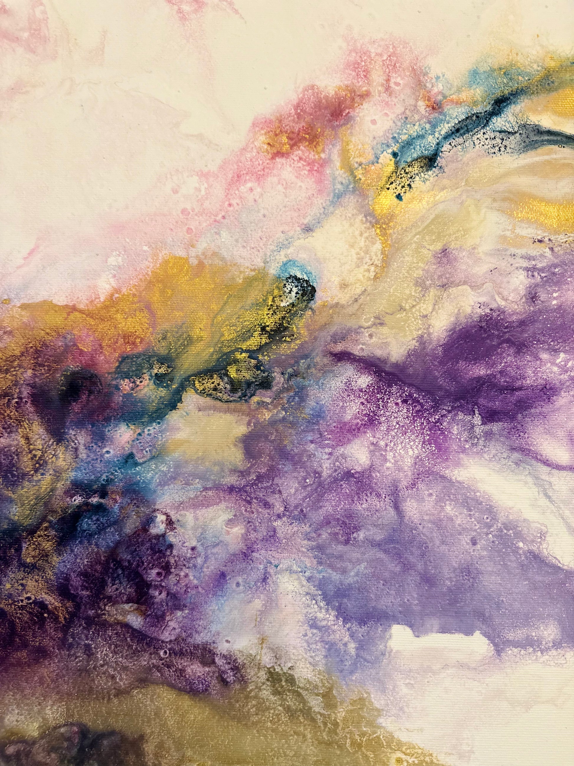 Das Zusammenspiel von Weiß, Lila, Blau und Gold verschmilzt zu einem kreativen Wirbel, der deine Sinne anspricht. Der zentrale Fokus, der an einen schmetterlingsähnlichen Kokon erinnert, verleiht dem Kunstwerk eine einzigartige Tiefe und emotionale Resonanz.