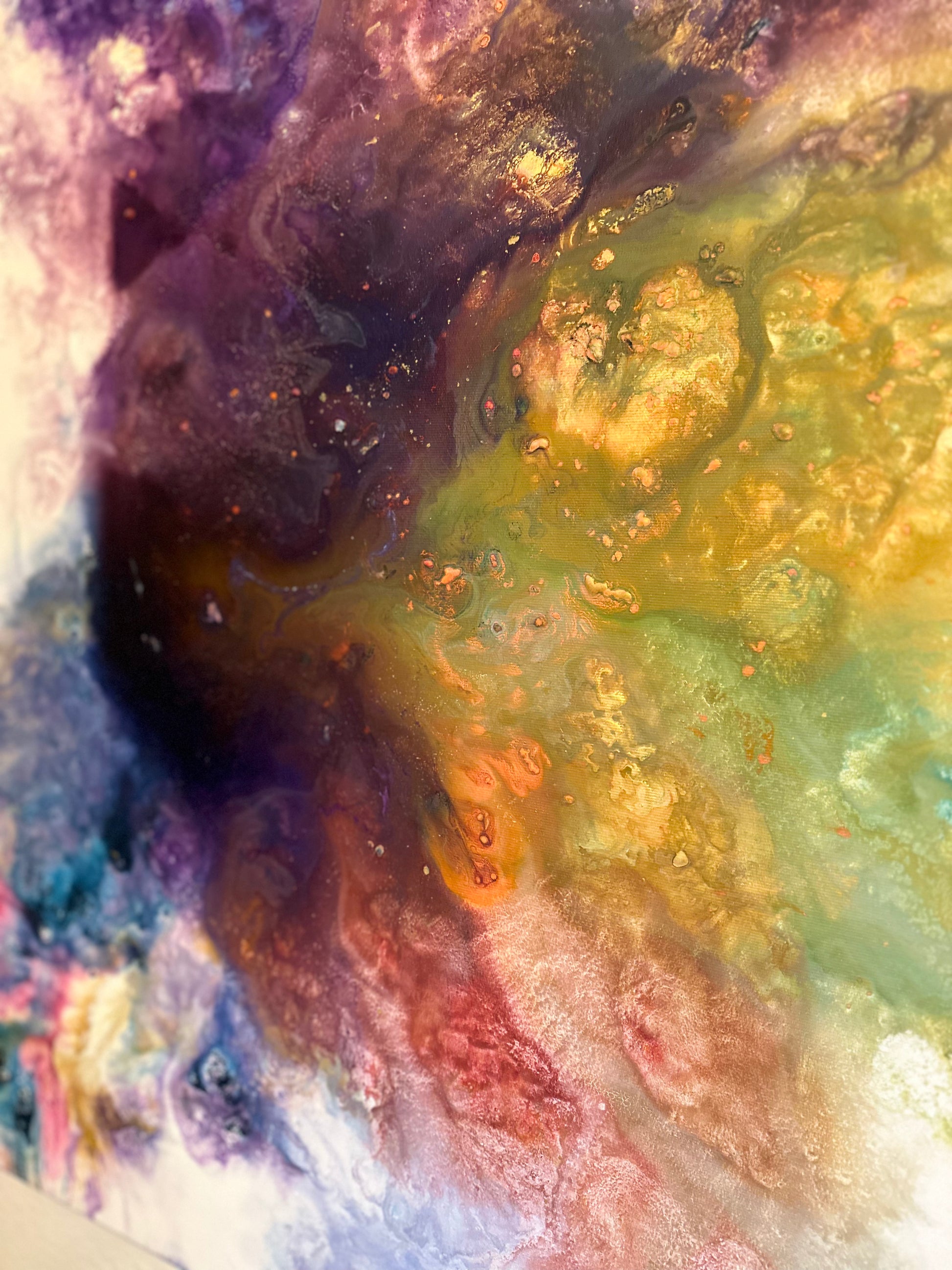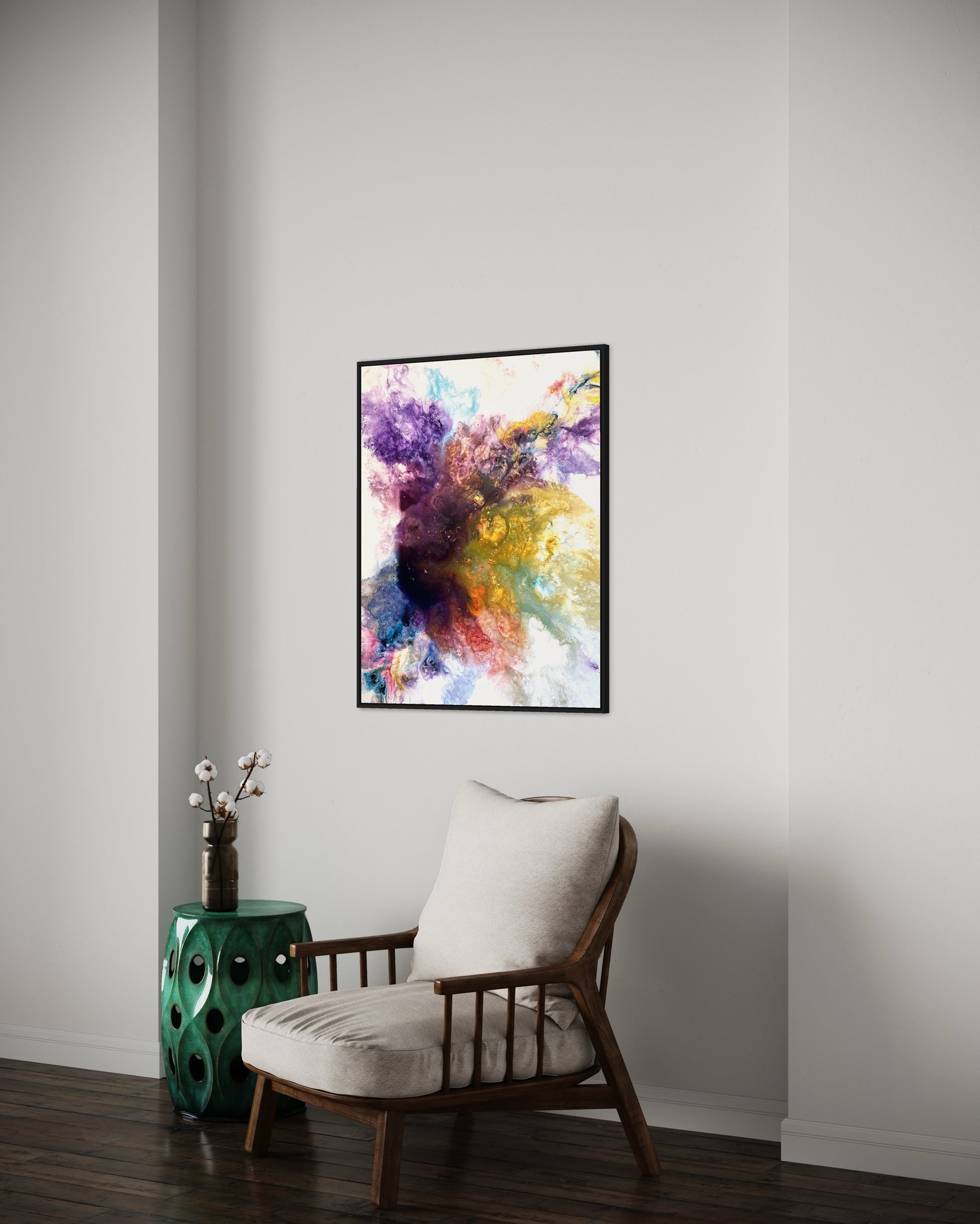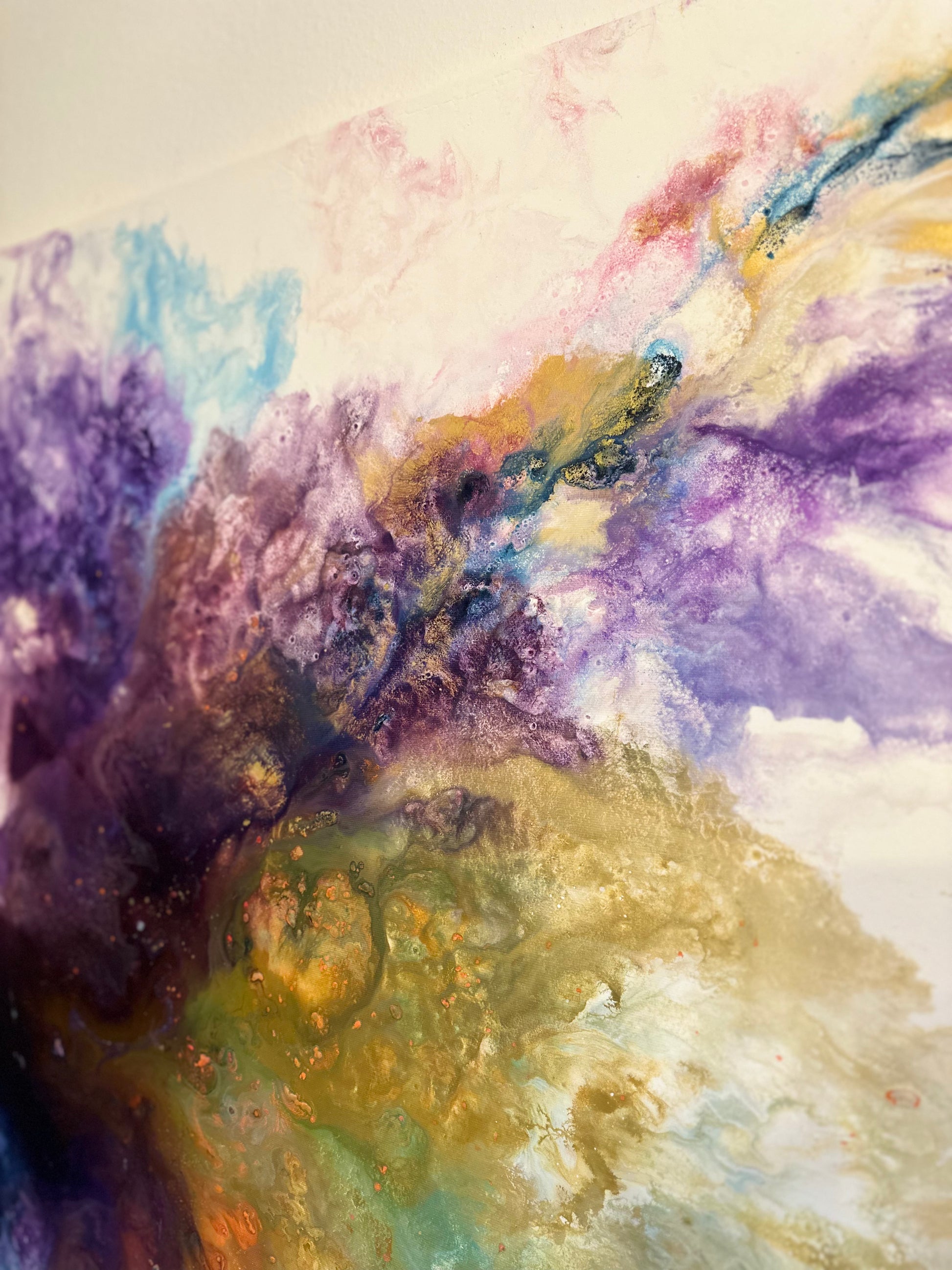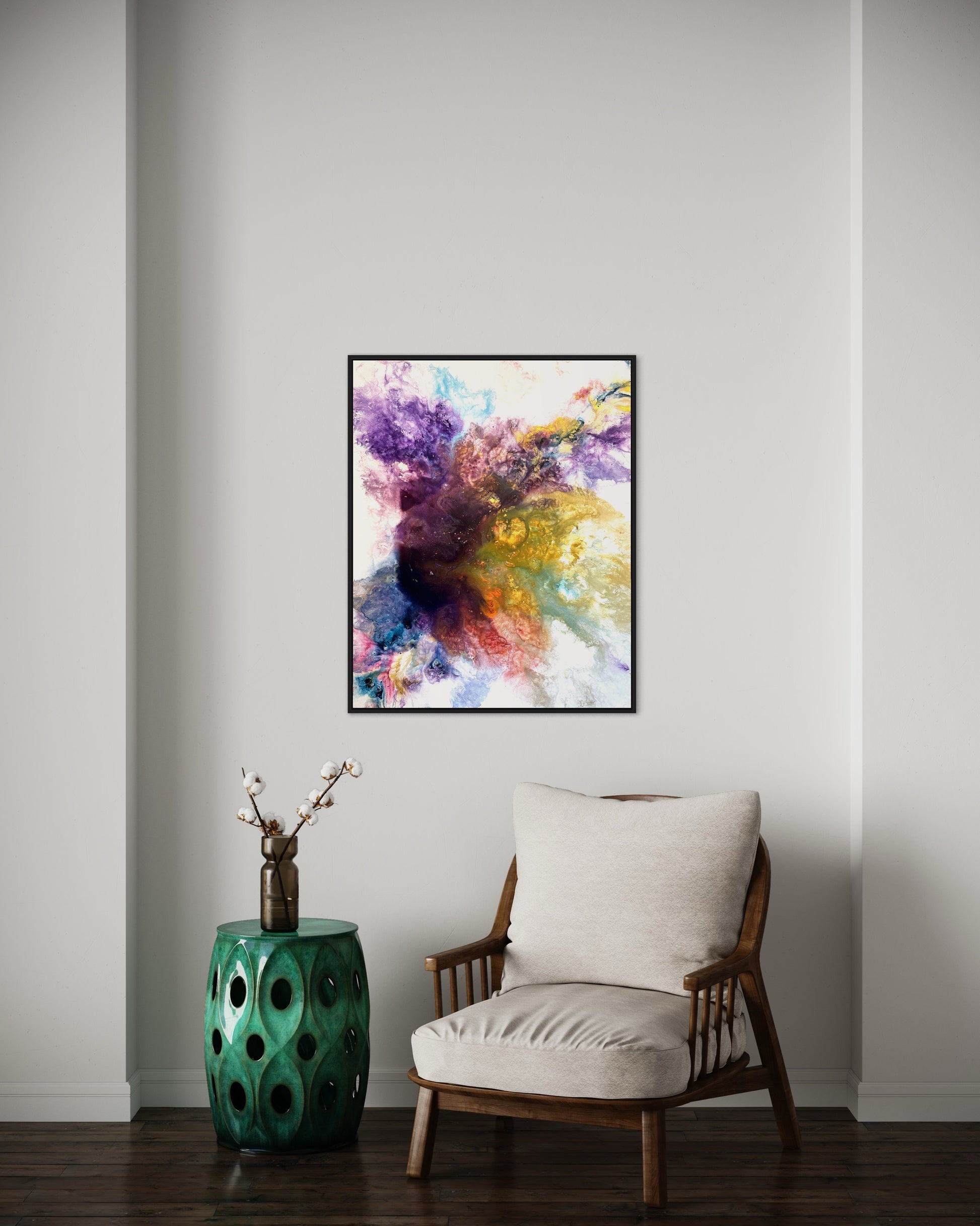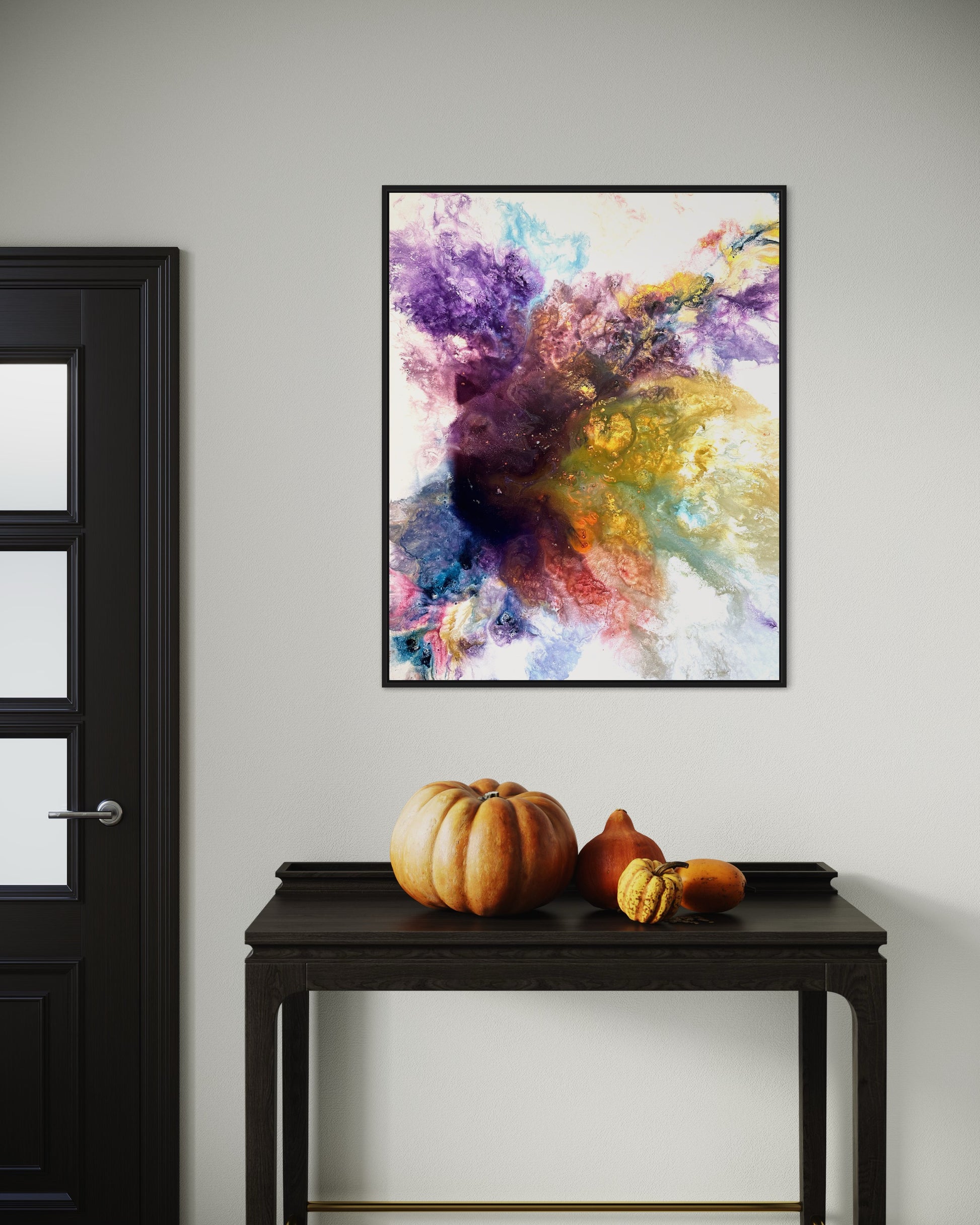 Das Zusammenspiel von Weiß, Lila, Blau und Gold verschmilzt zu einem kreativen Wirbel, der deine Sinne anspricht. Der zentrale Fokus, der an einen schmetterlingsähnlichen Kokon erinnert, verleiht dem Kunstwerk eine einzigartige Tiefe und emotionale Resonanz.