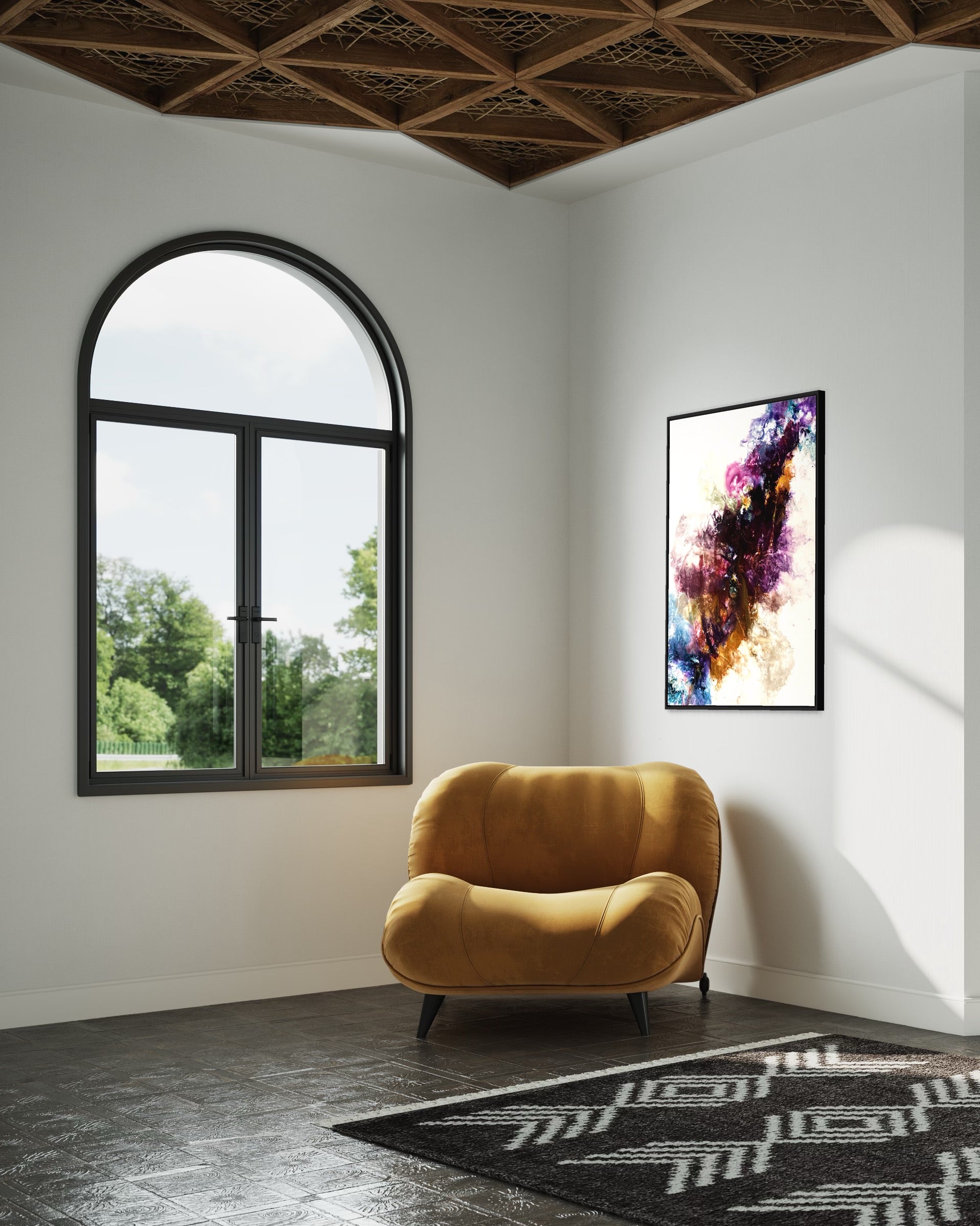 Das Kunstwerk wird professionell mit einem eleganten schwarzen Rahmen präsentiert, der seine zeitgenössische Anziehungskraft unterstreicht. Verleihe deinem Raum mit diesem Statement-Stück mühelos eine kühne und zugleich anspruchsvolle Note.