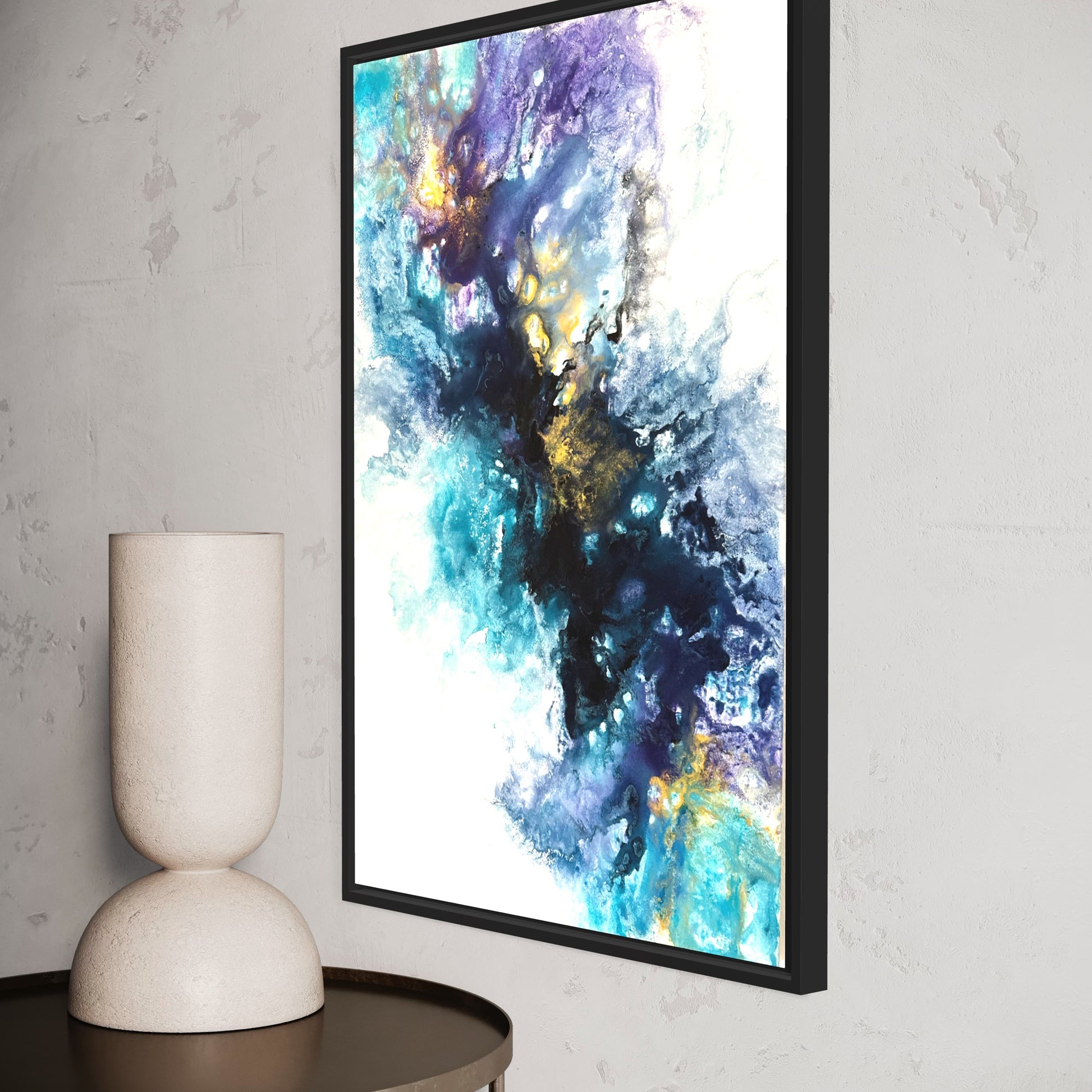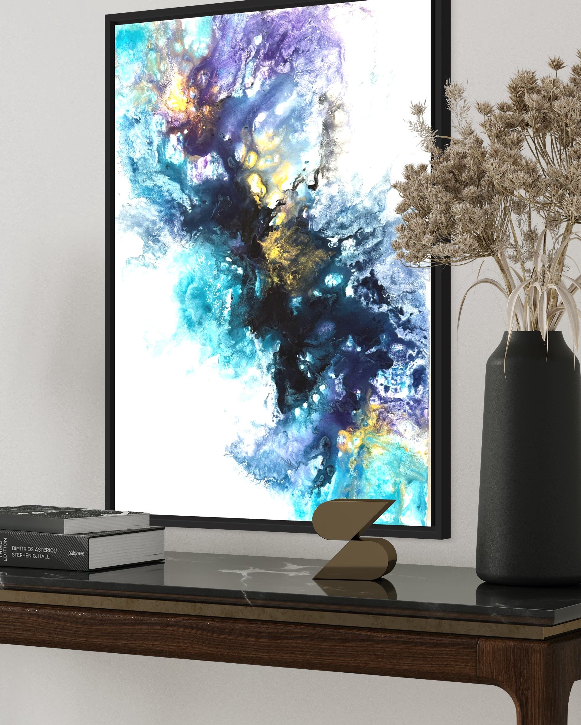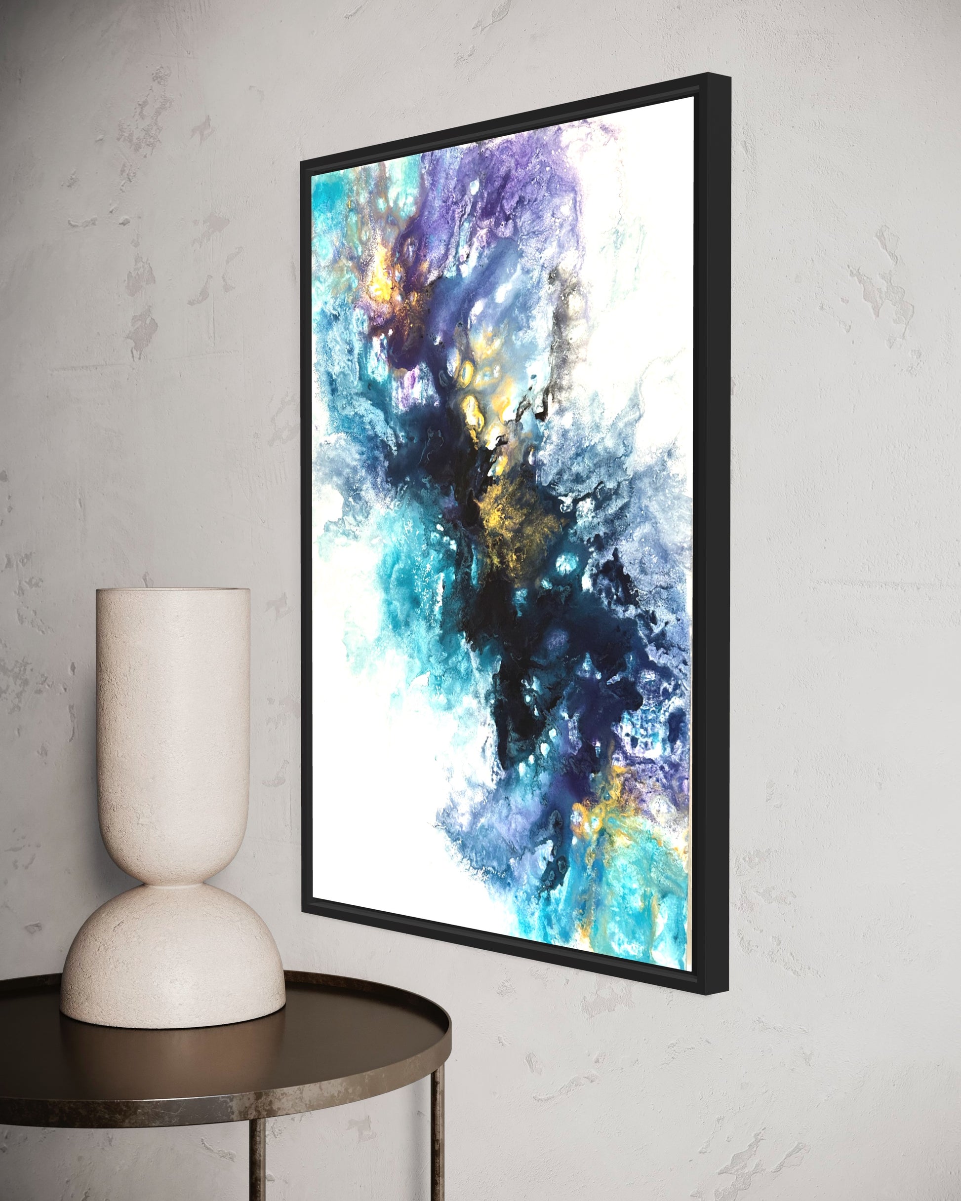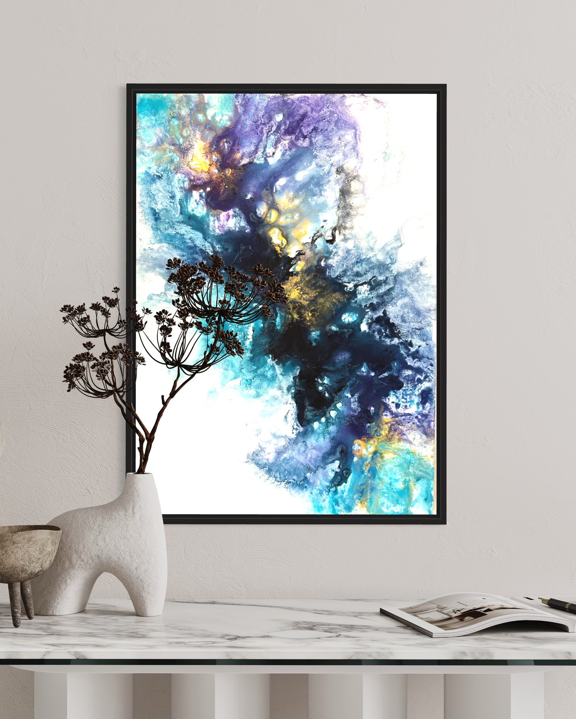 Stelle dir "Dunkler Fluss der Träume" vor - ein exquisites abstraktes Kunstwerk, das ein Gefühl von Verzauberung und Mysterium hervorruft. Dieses 70 x 50 Leinwandbild ist eine harmonische Mischung aus tiefen Blau- und Lilatönen, die sich elegant miteinander verweben und in der Mitte einen faszinierenden dunklen Fluss erzeugen. Um diesen bezaubernden Mittelpunkt herum findest du eine zarte Mischung aus Gold, die dem Kunstwerk eine ätherische Note verleiht.