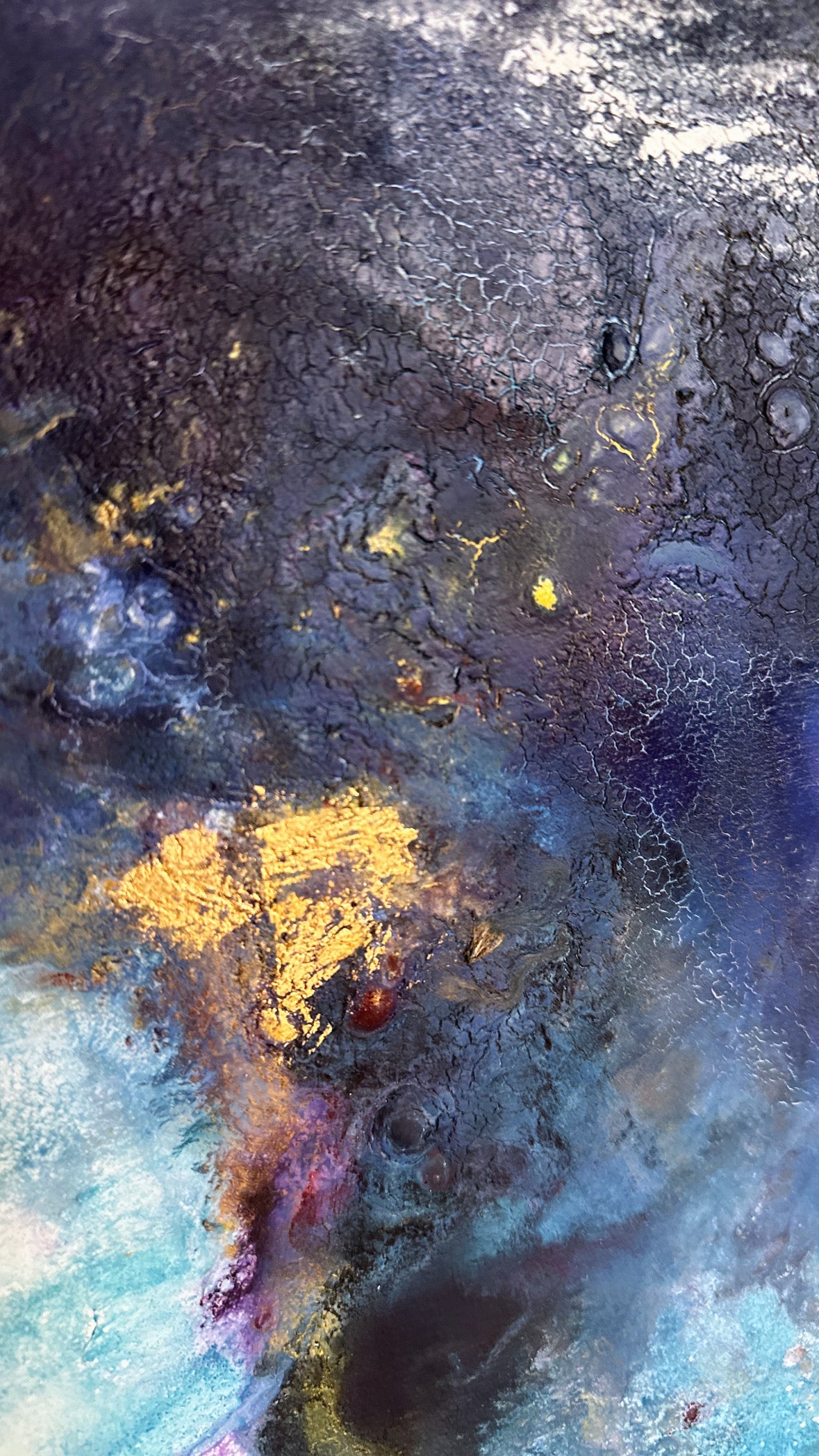 Entdecke 'Royal Blue', ein faszinierendes abstraktes Gemälde (50 x 70 cm). Dieses kunstvolle Werk fängt die Essenz von königlichem Blau und strahlendem Gold ein, verflochten mit einem Hauch von betörendem Lila. Die einzigartige Verwendung von echtem Blattgold verleiht dem Gemälde einen unwiderstehlichen Glanz und eine Aura königlicher Eleganz.