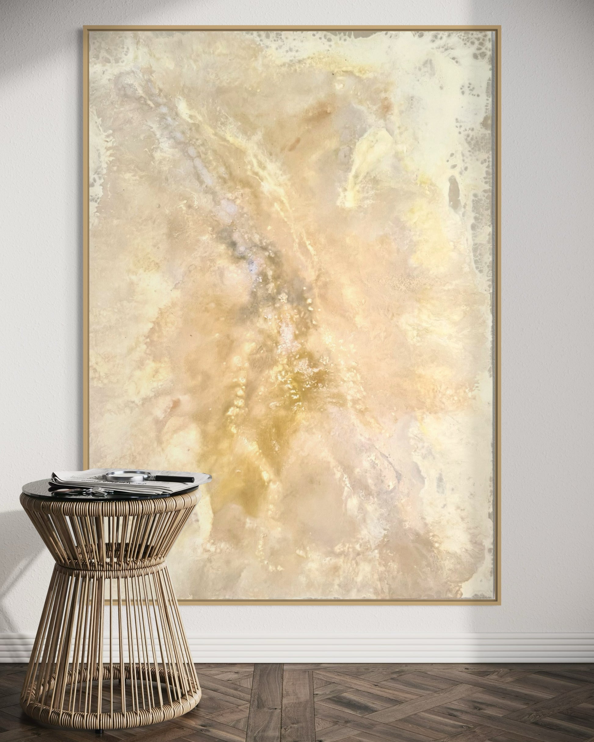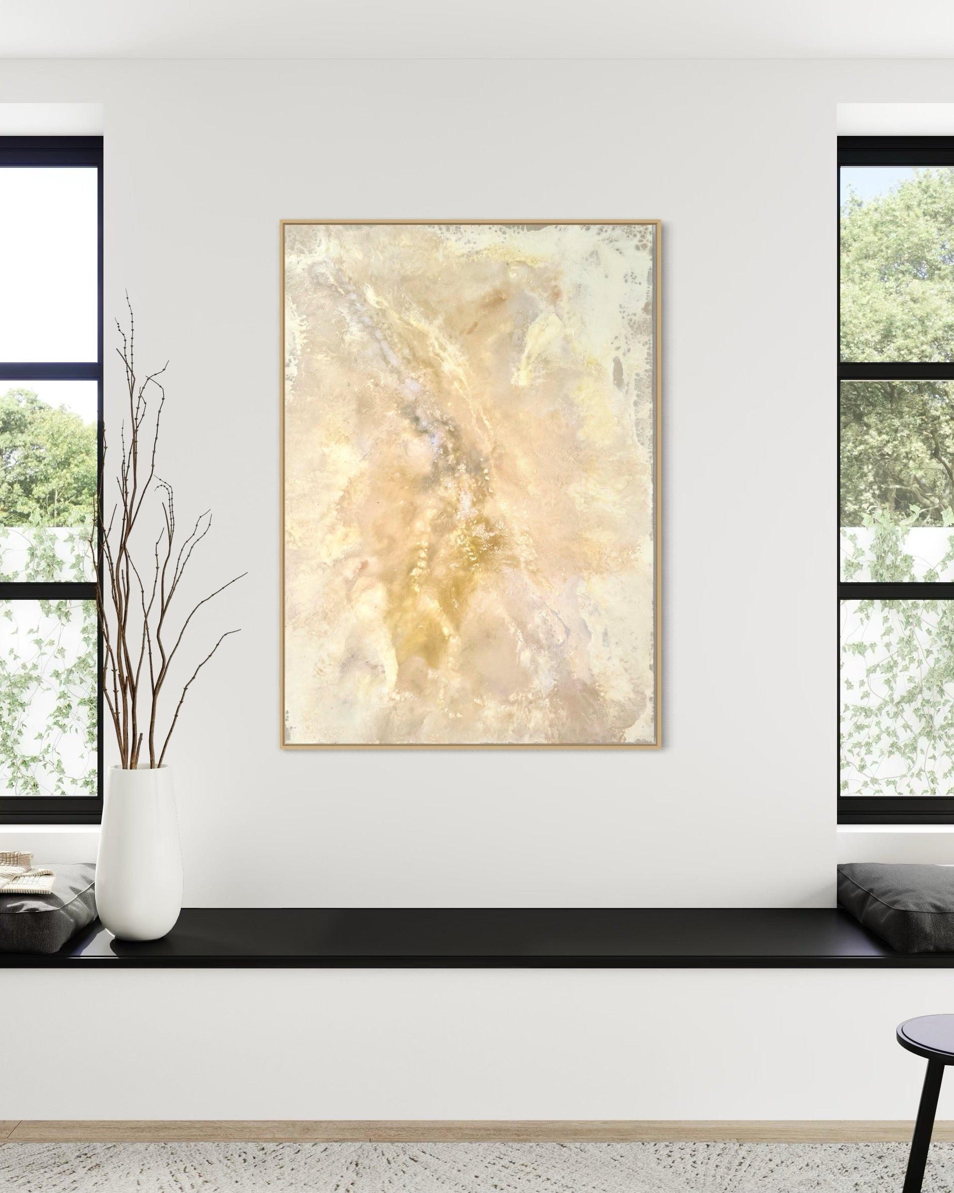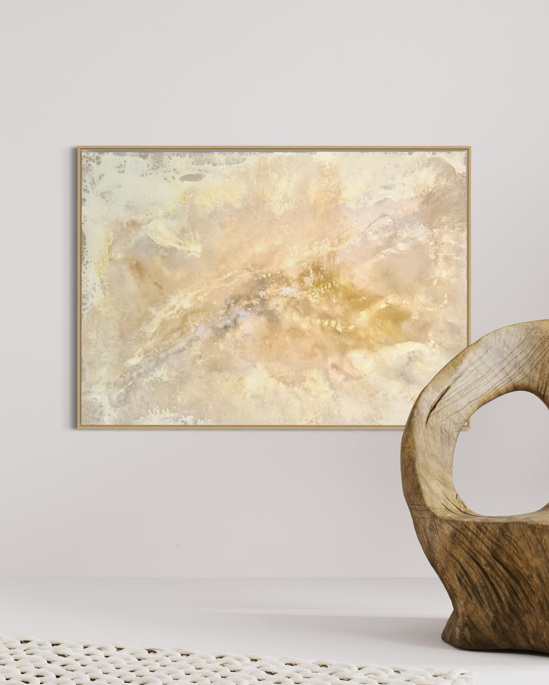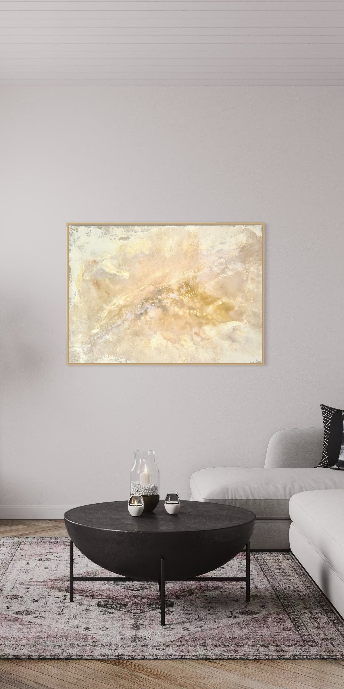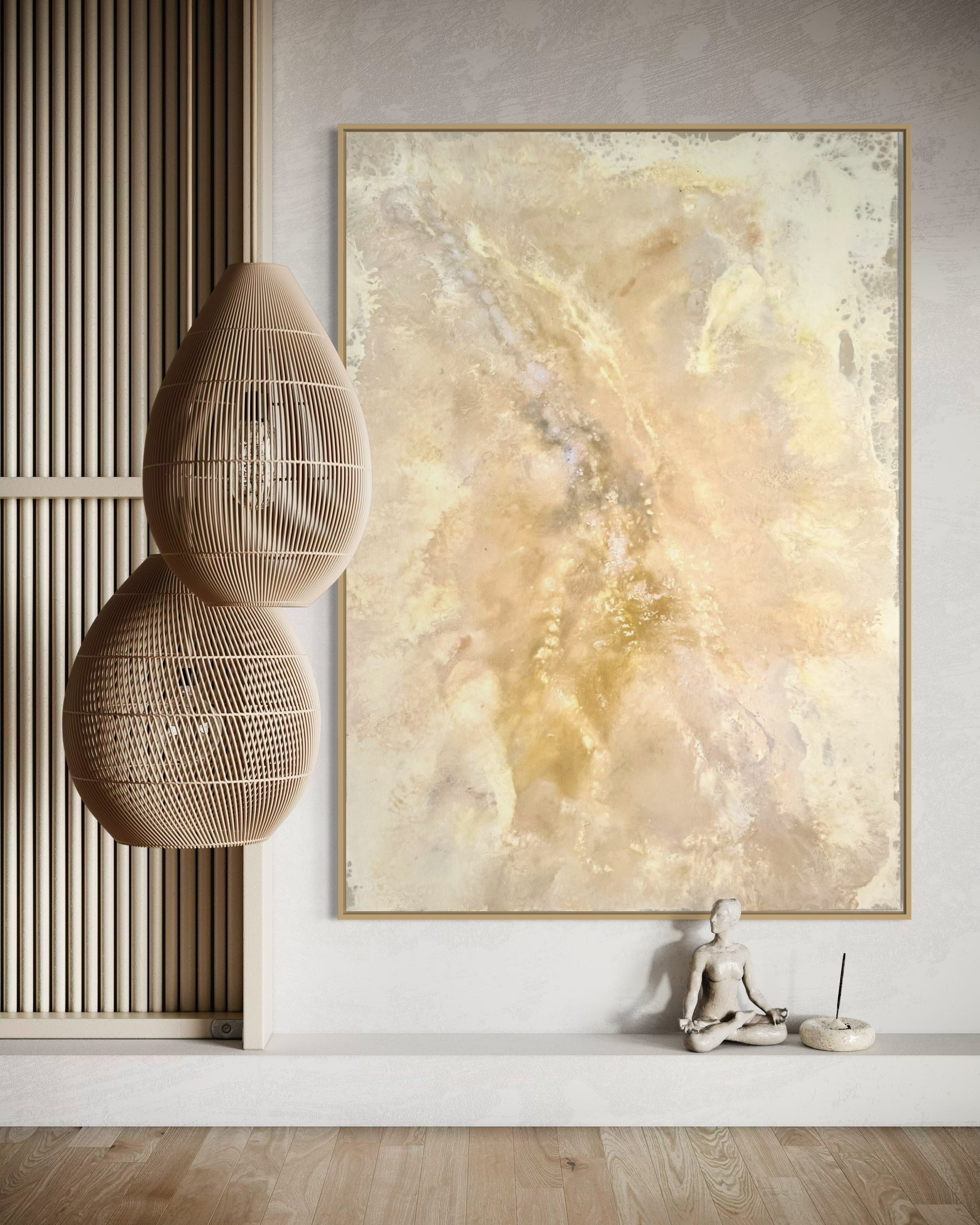 Oasis verkörpert den Gedanken eines stillen, friedlichen Ortes, an dem Seele und Geist Erholung finden können. Die zarten, natürlichen Farbtöne und die geschmeidigen Übergänge im Bild erzeugen eine sanfte, einladende Aura, die jeden Raum in ein Paradies verwandelt. Dieses Gemälde ist nicht nur ein visuelles Highlight, sondern auch eine Quelle der Inspiration und des Wohlbefindens.