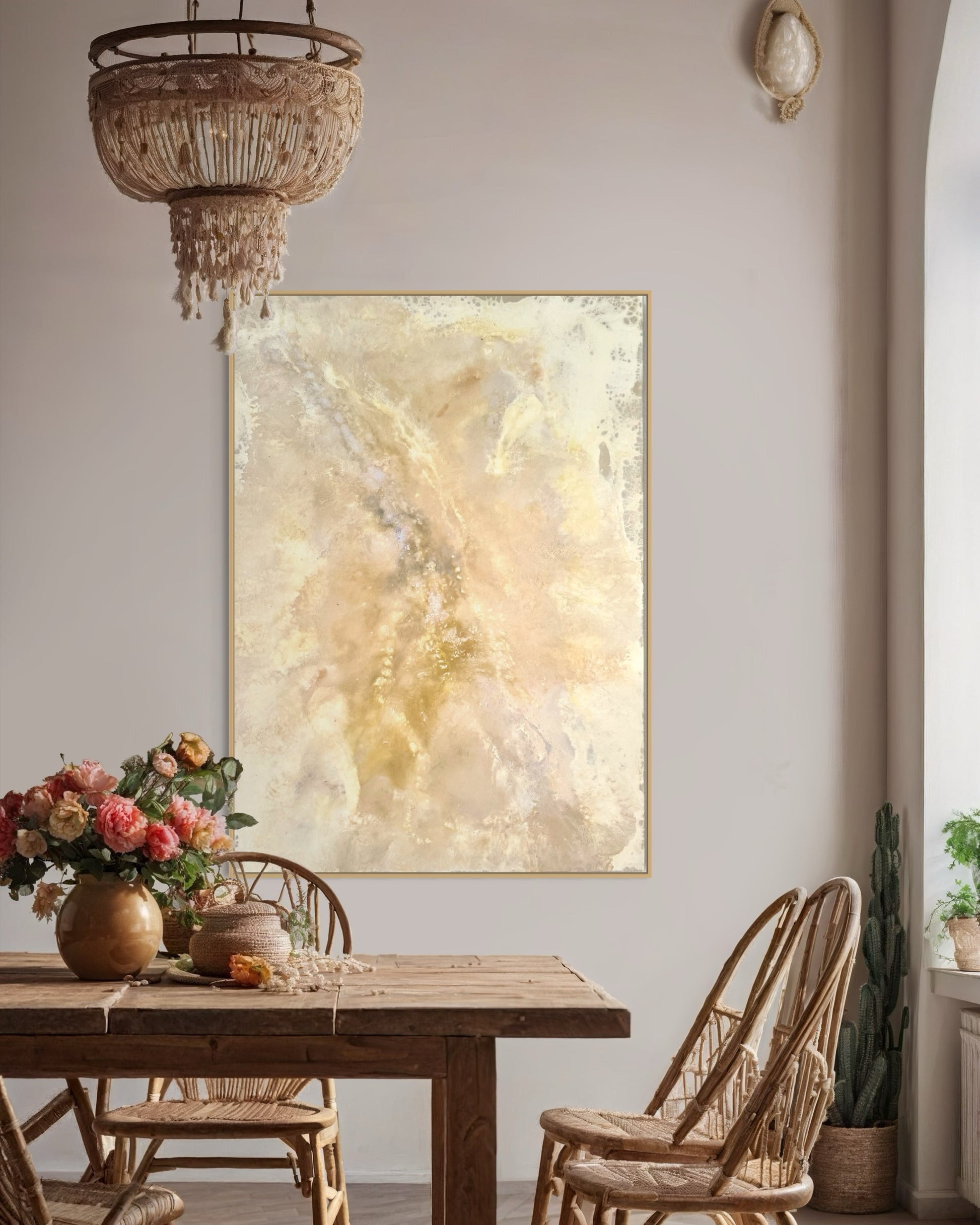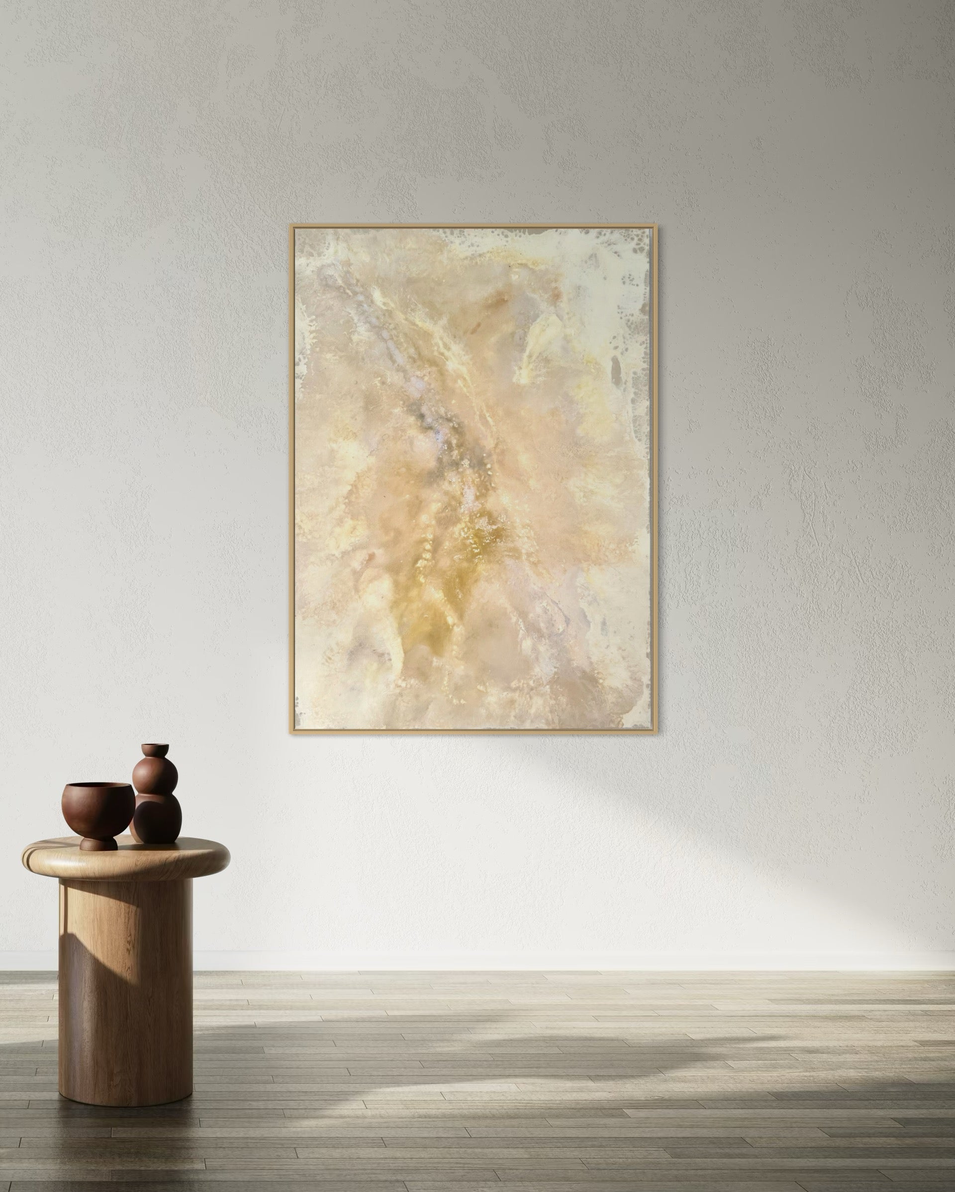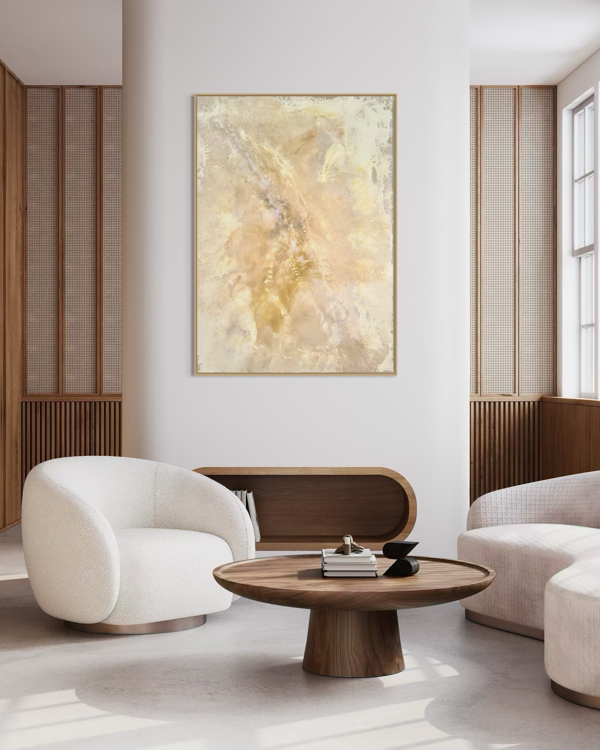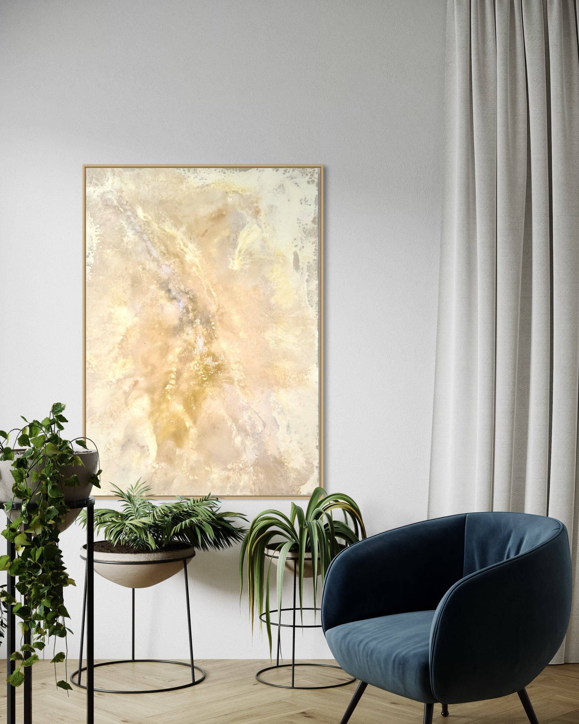 Oasis verkörpert den Gedanken eines stillen, friedlichen Ortes, an dem Seele und Geist Erholung finden können. Die zarten, natürlichen Farbtöne und die geschmeidigen Übergänge im Bild erzeugen eine sanfte, einladende Aura, die jeden Raum in ein Paradies verwandelt. Dieses Gemälde ist nicht nur ein visuelles Highlight, sondern auch eine Quelle der Inspiration und des Wohlbefindens.