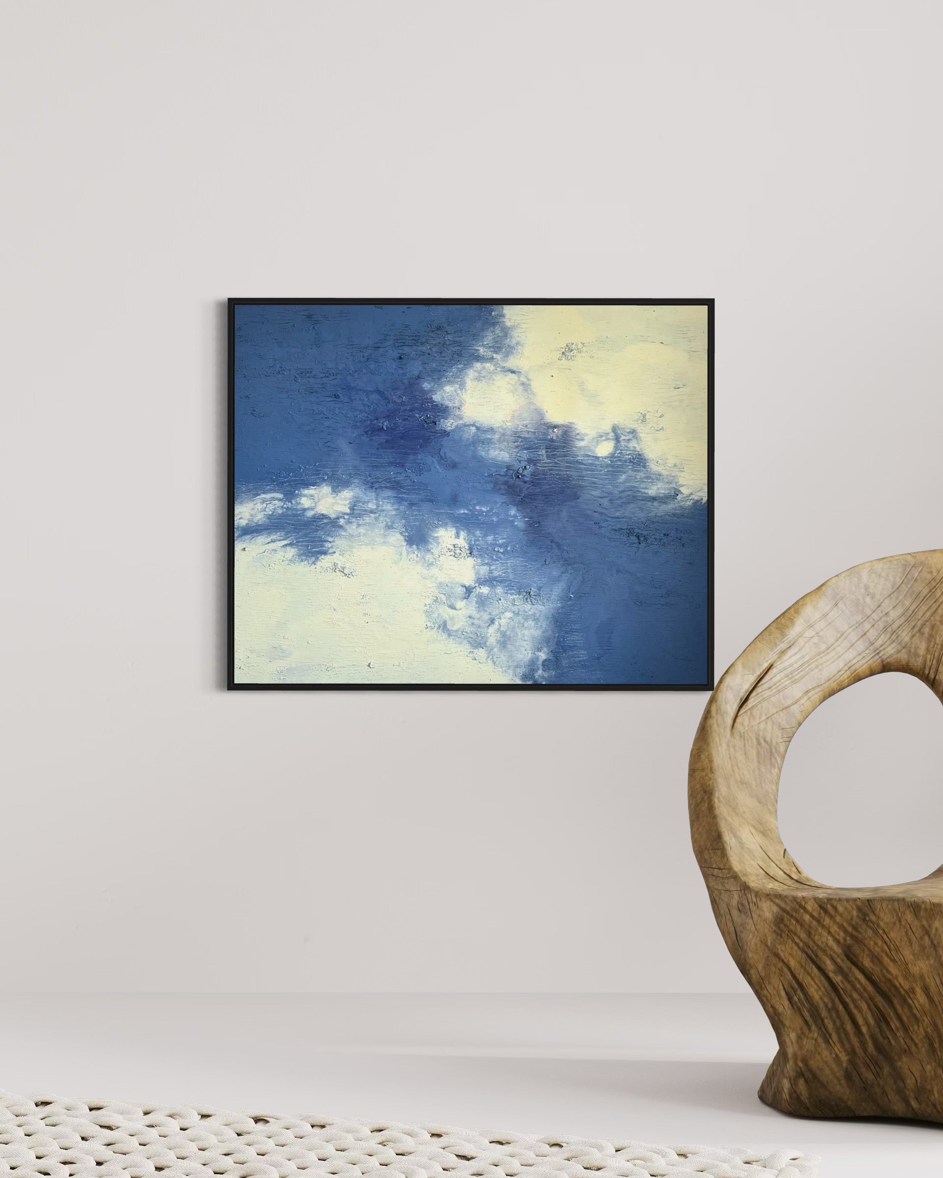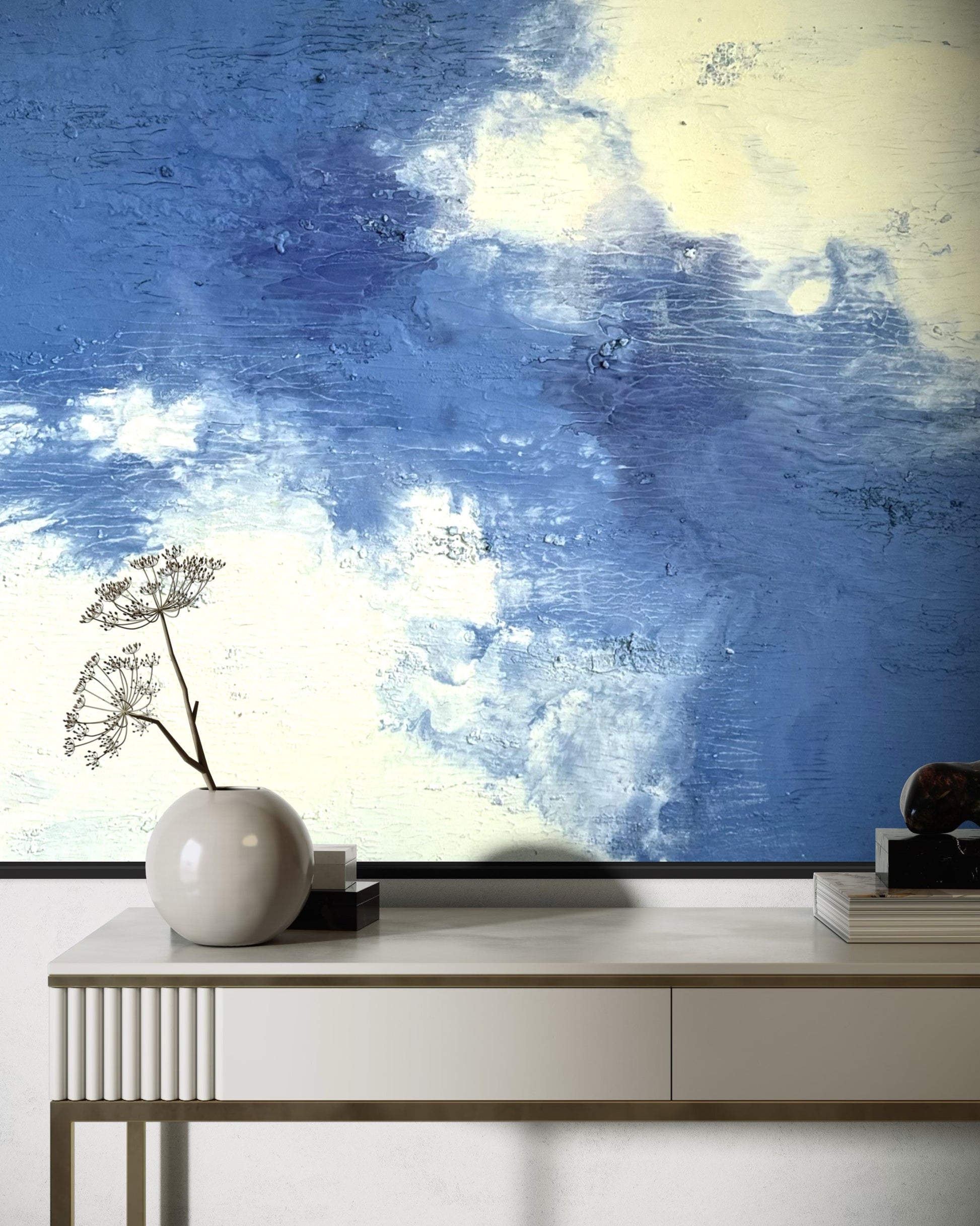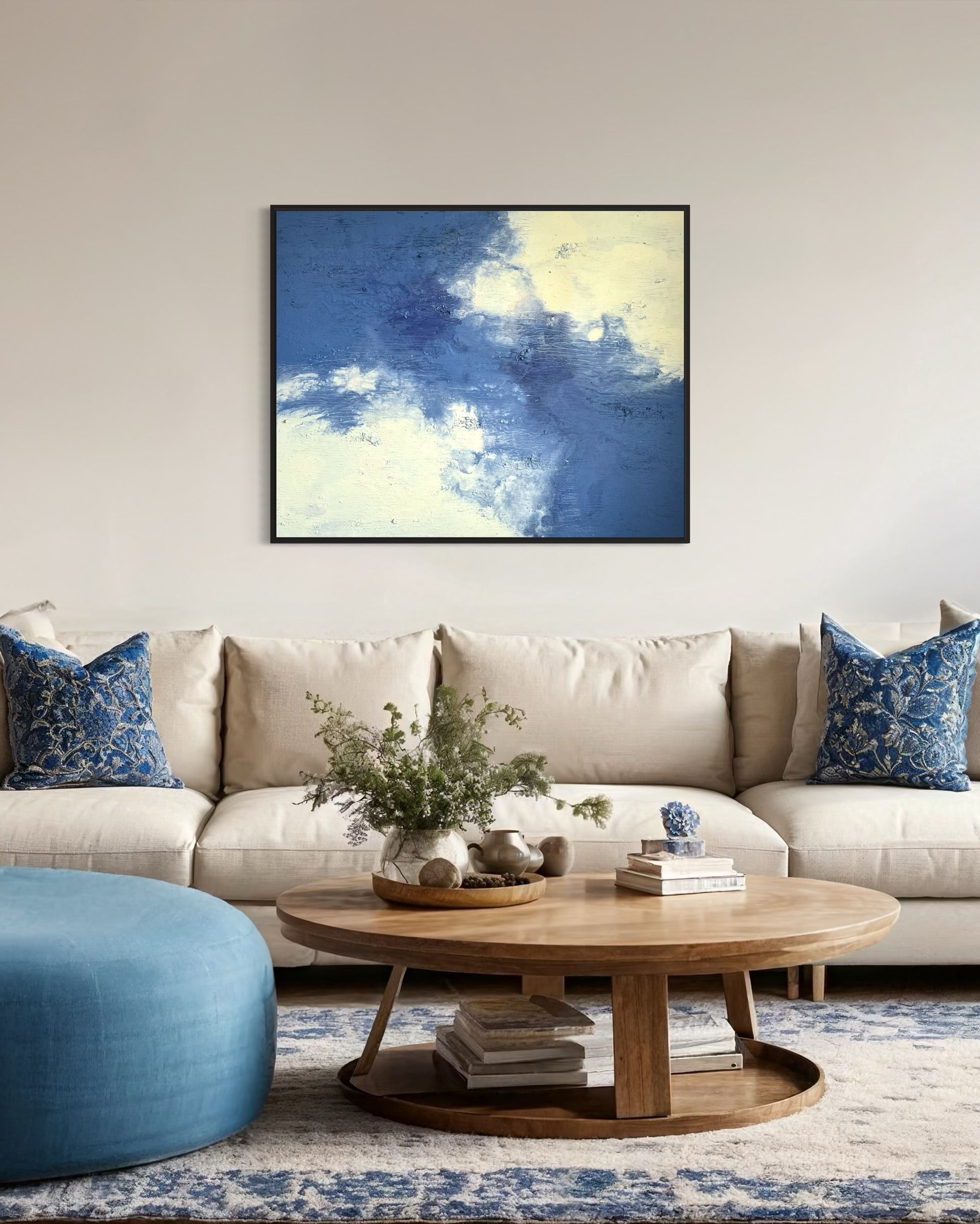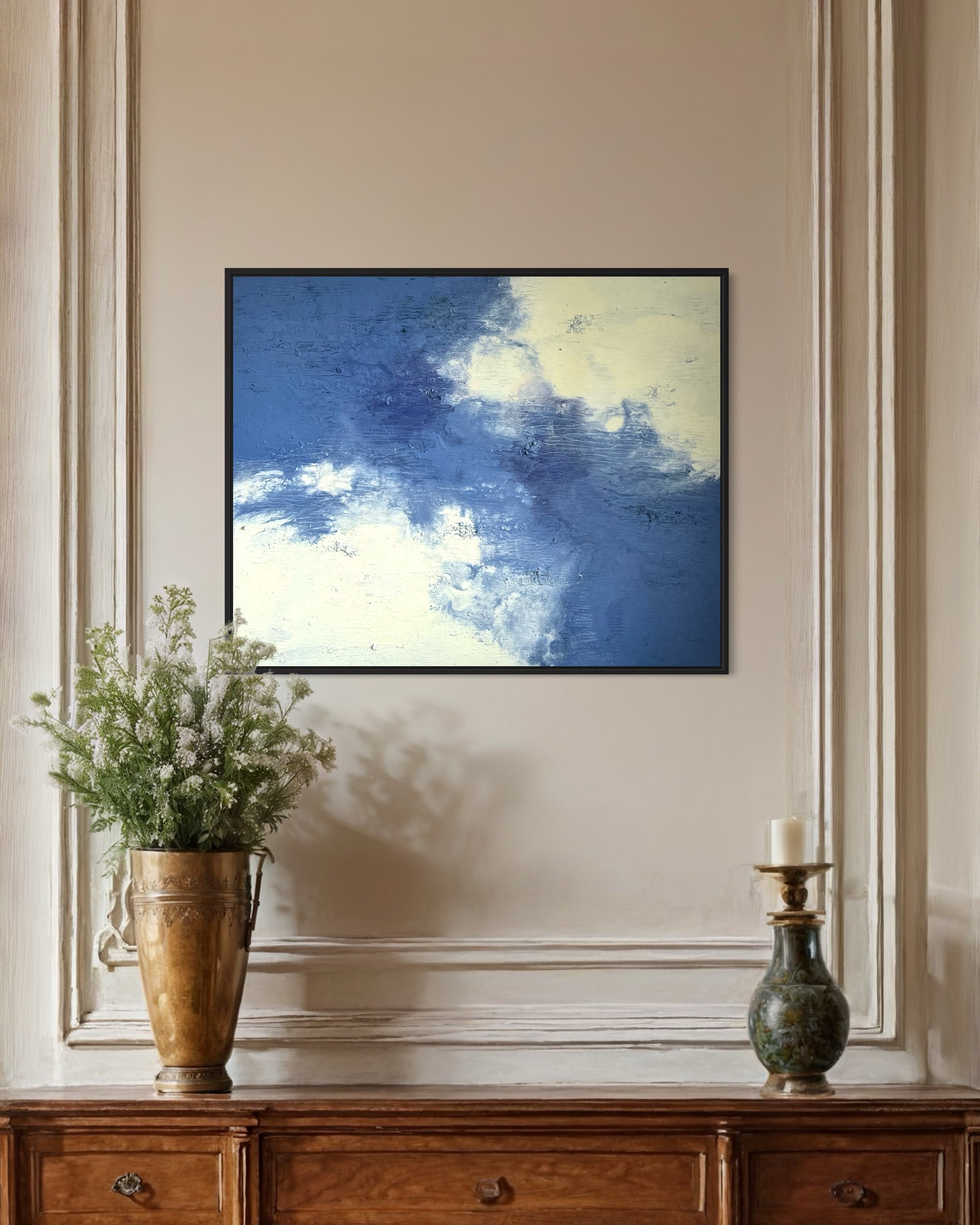 "Daydream" vereint zarte Blau- und Cremetöne zu einer harmonischen Komposition, die Ruhe und Leichtigkeit ausstrahlt. Mit seiner Größe von 100x80 cm bringt das Gemälde eine zeitlose Atmosphäre in jeden Raum.