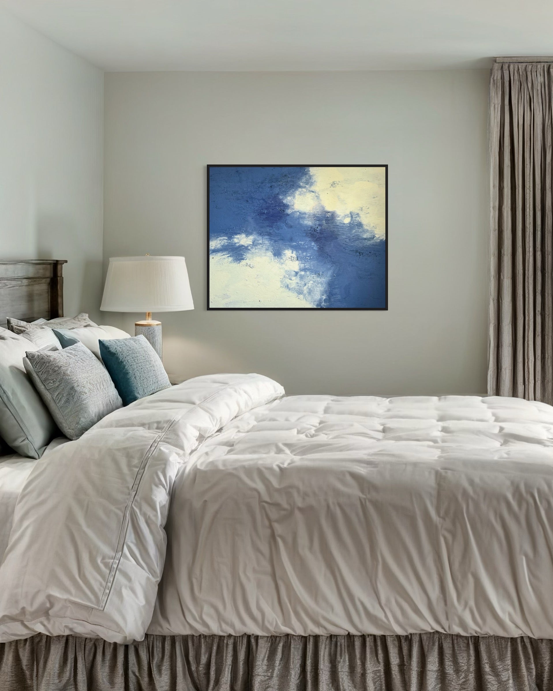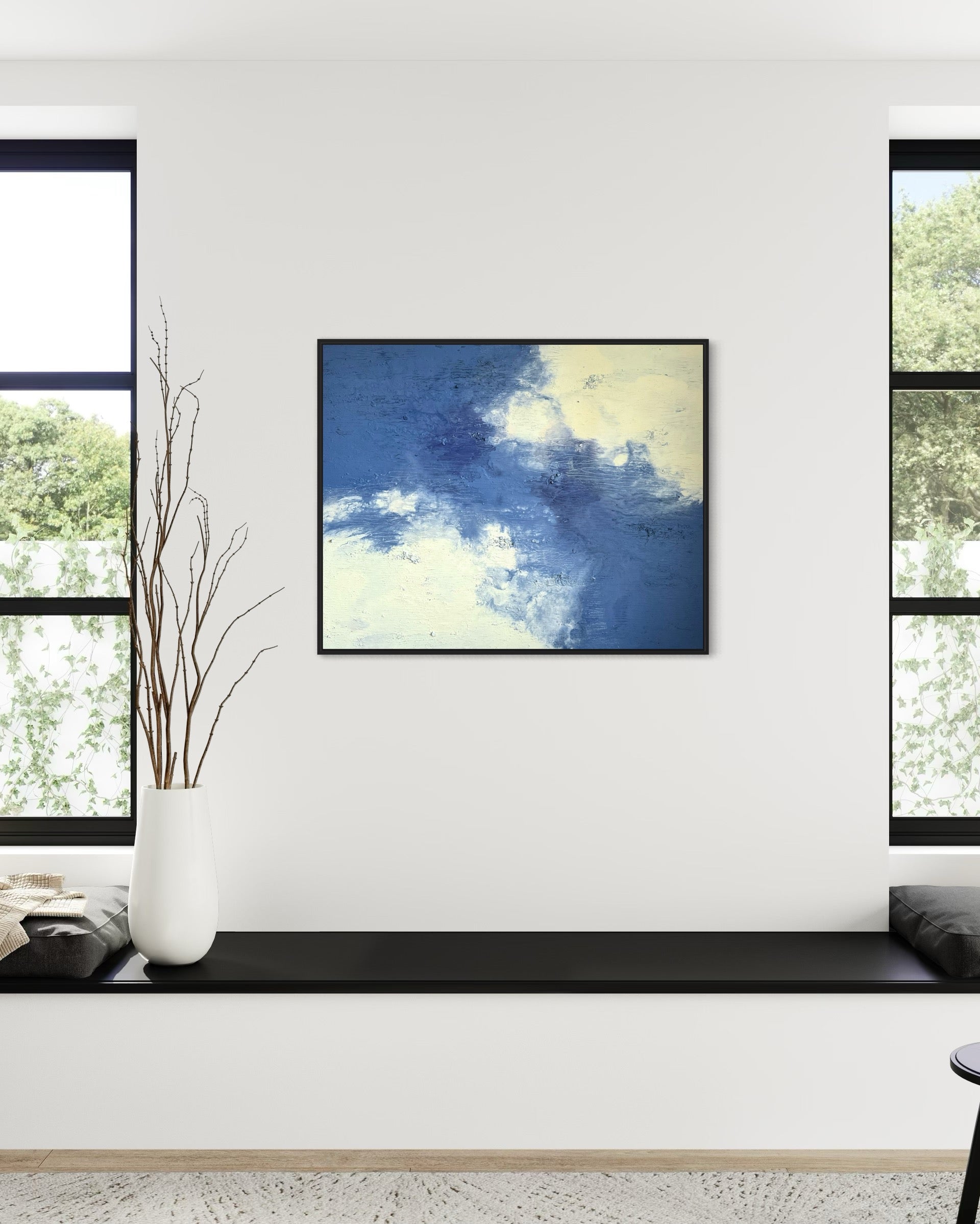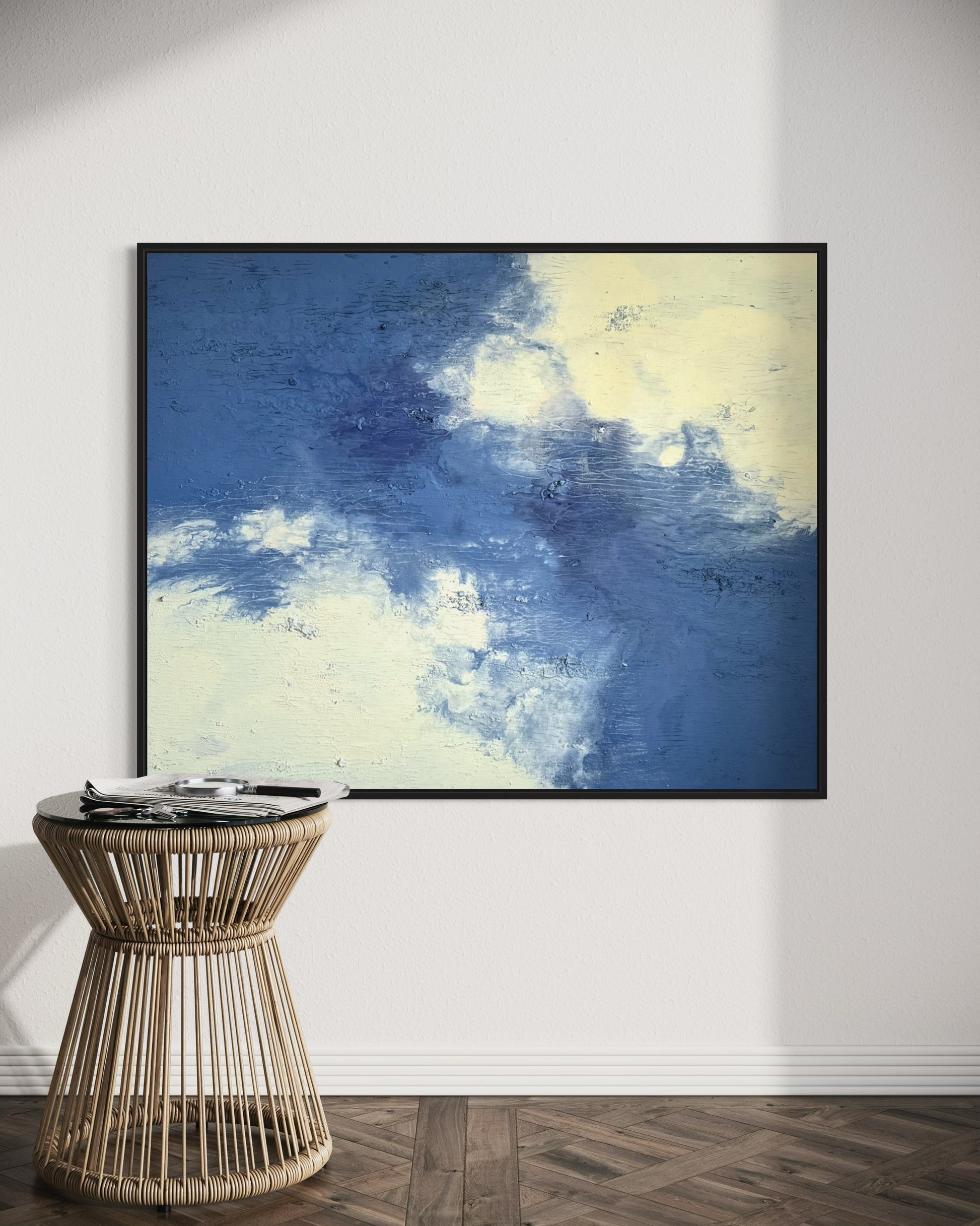 "Daydream" vereint zarte Blau- und Cremetöne zu einer harmonischen Komposition, die Ruhe und Leichtigkeit ausstrahlt. Mit seiner Größe von 100x80 cm bringt das Gemälde eine zeitlose Atmosphäre in jeden Raum.