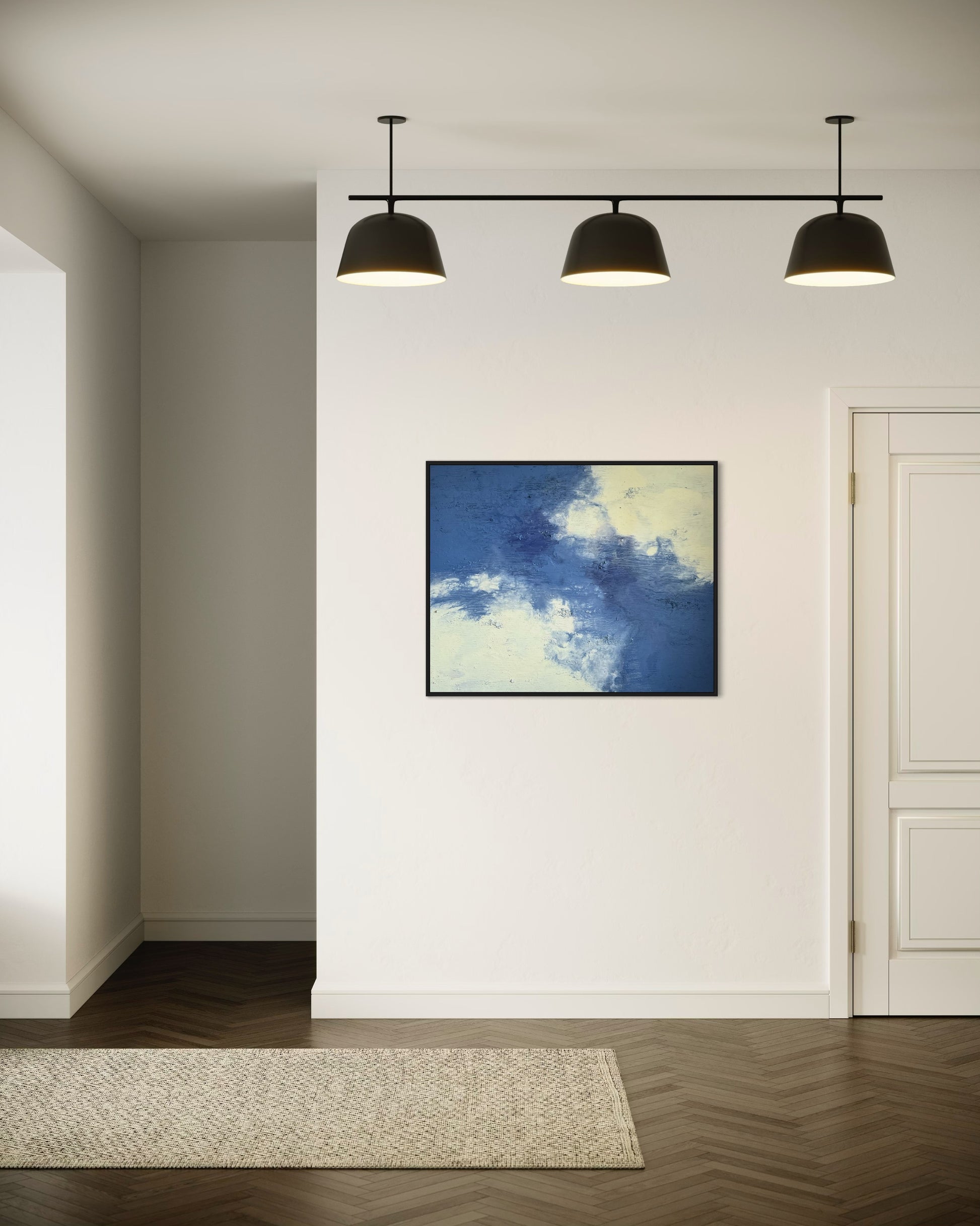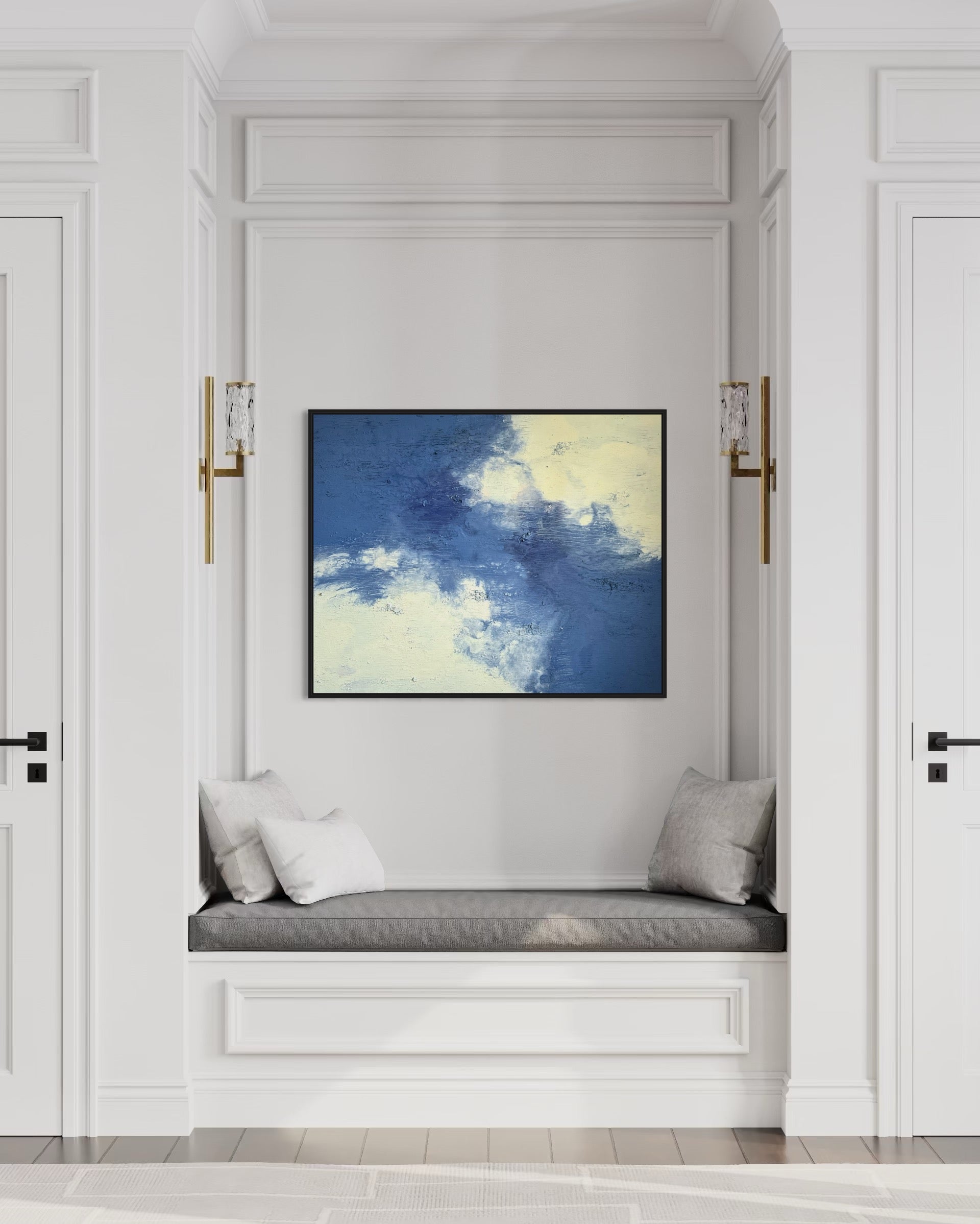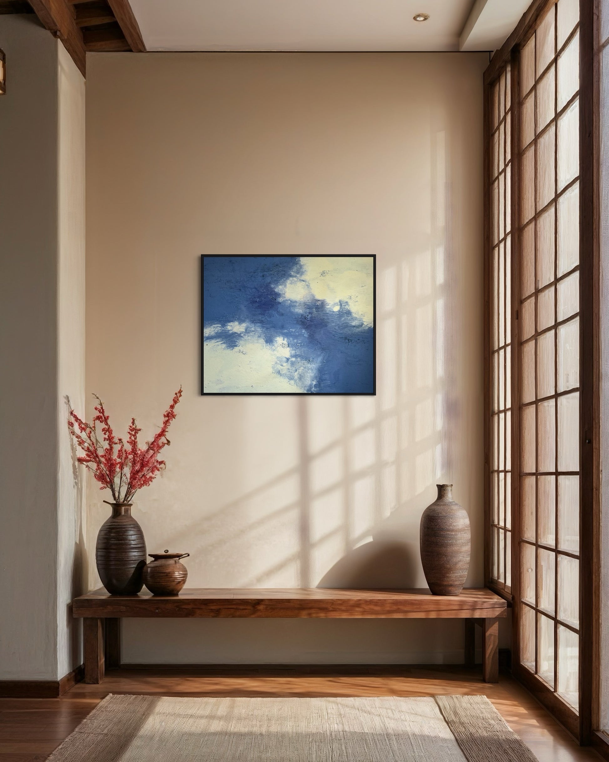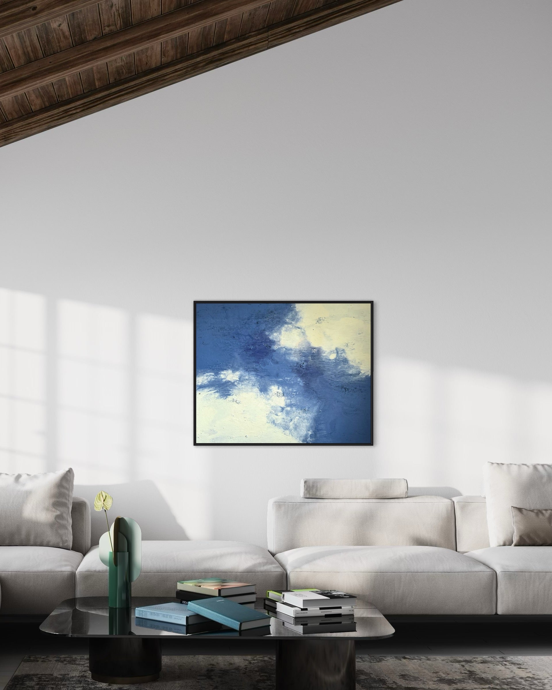 "Daydream" vereint zarte Blau- und Cremetöne zu einer harmonischen Komposition, die Ruhe und Leichtigkeit ausstrahlt. Mit seiner Größe von 100x80 cm bringt das Gemälde eine zeitlose Atmosphäre in jeden Raum.