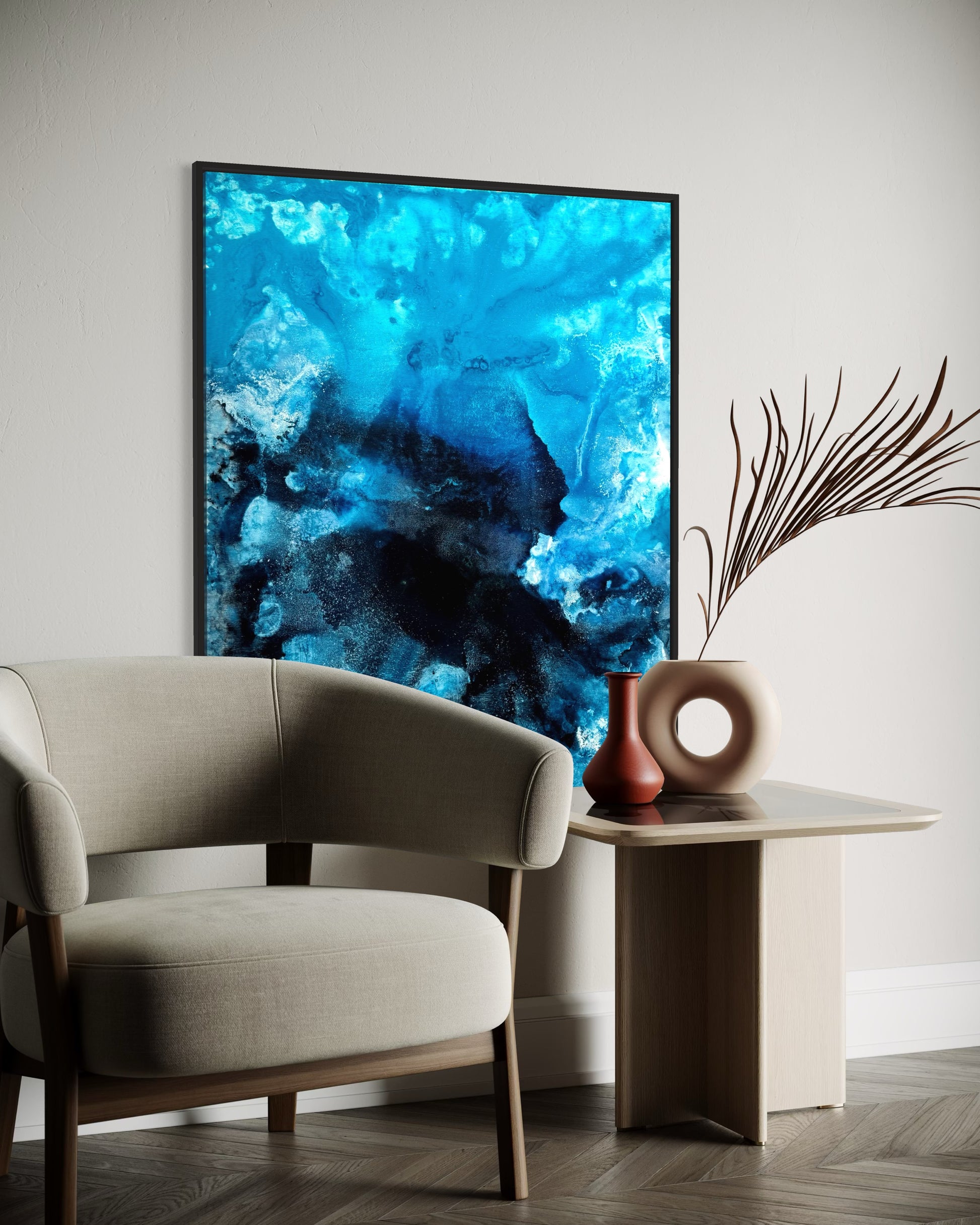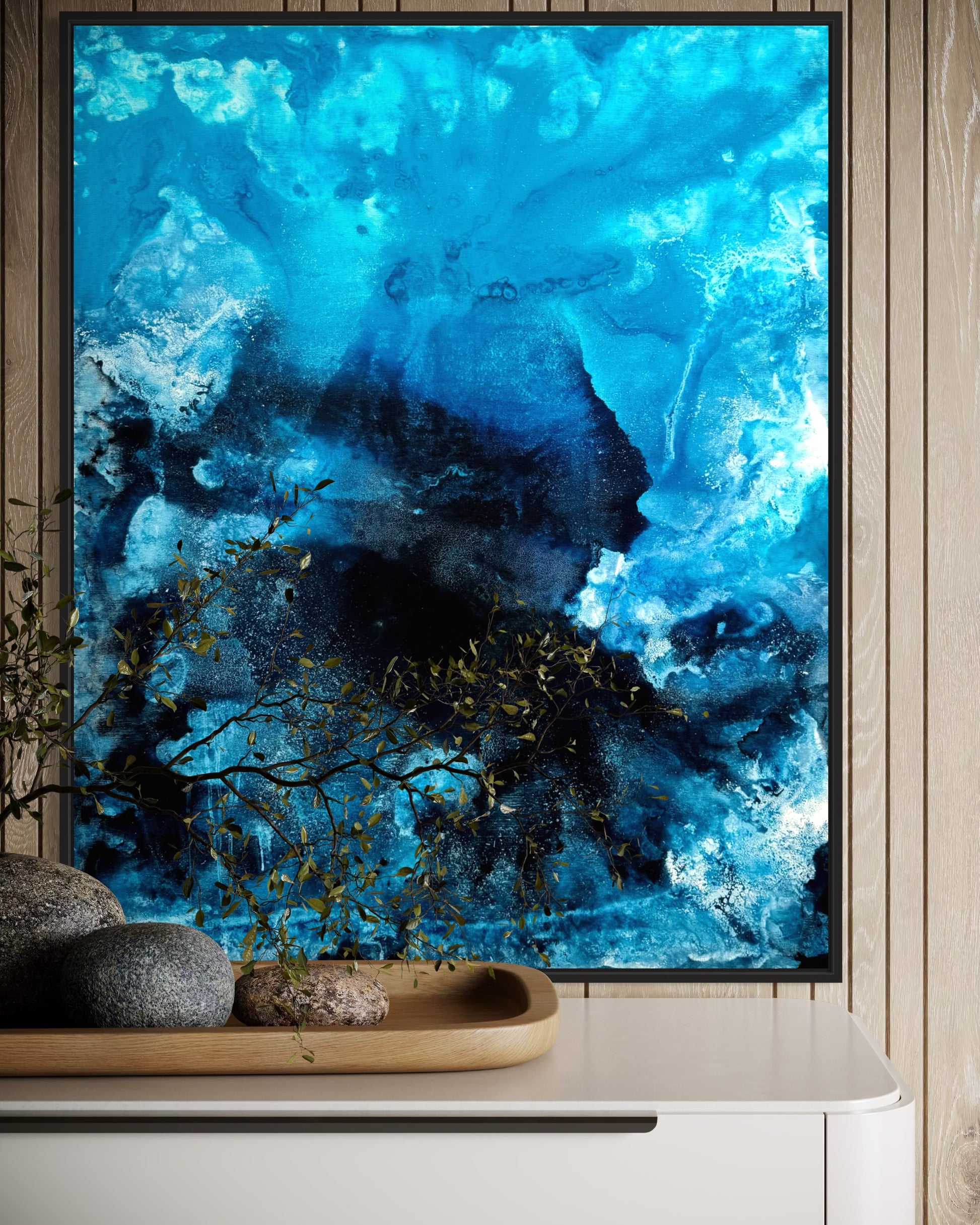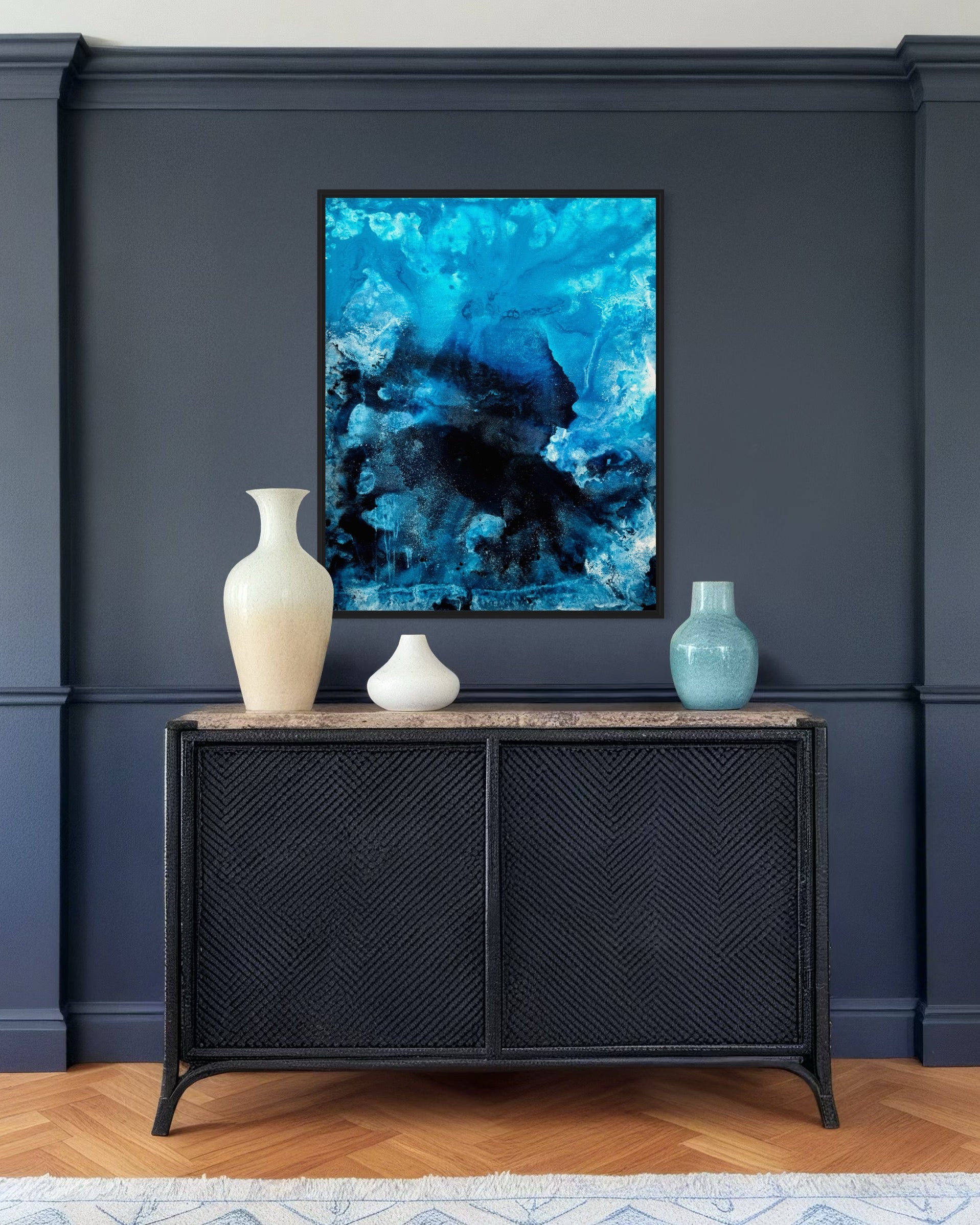"Blue Forest" fasziniert mit tiefen Blautönen und einer dynamischen Struktur. Die handgemalte Oberfläche verleiht dem Bild eine besondere Tiefe und sorgt für eine eindrucksvolle Wirkung an der Wand.