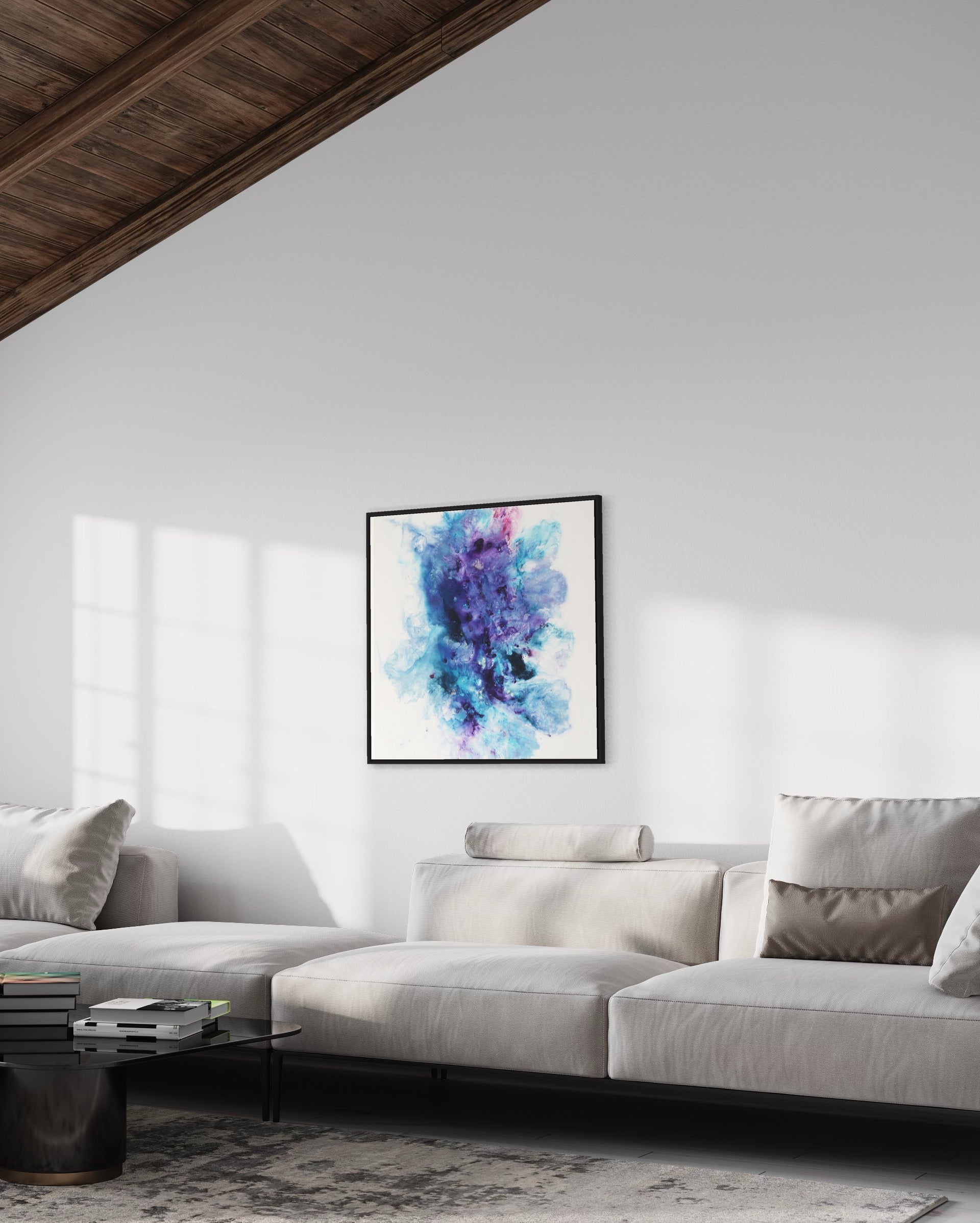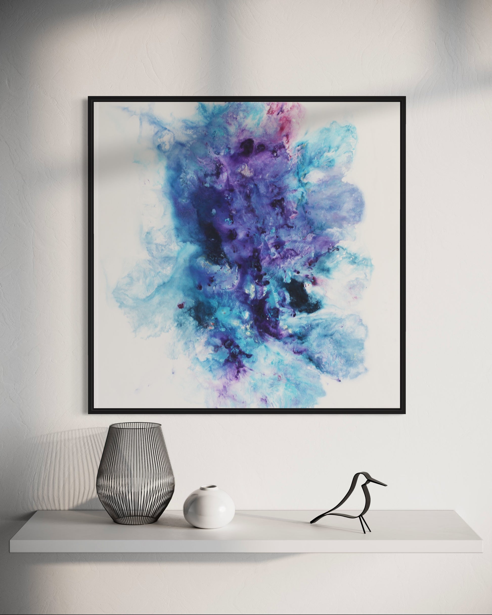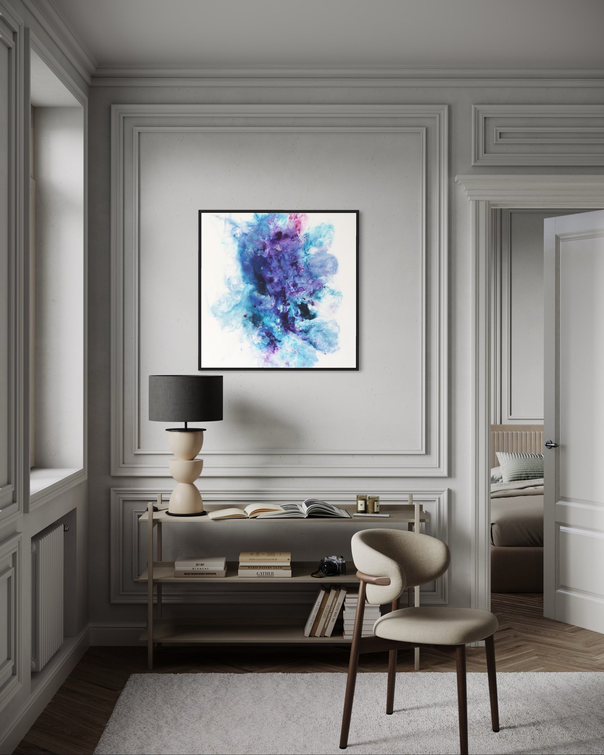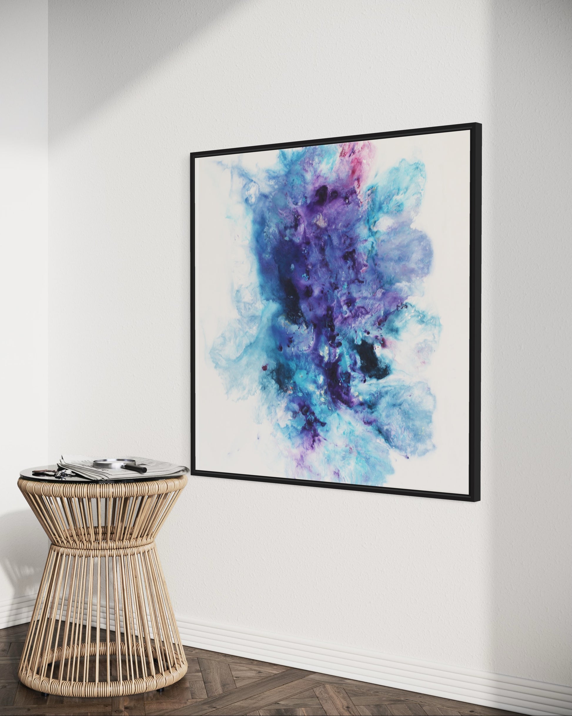 Bringe die dynamische Schönheit von "Delight" in dein Zuhause. Dieses Acrylgemälde auf Leinwand, mit den Maßen 80x80 cm, wird durch seine fließenden Blau-, Lila- und Weißtöne zu einem unverwechselbaren Highlight in jedem Raum.