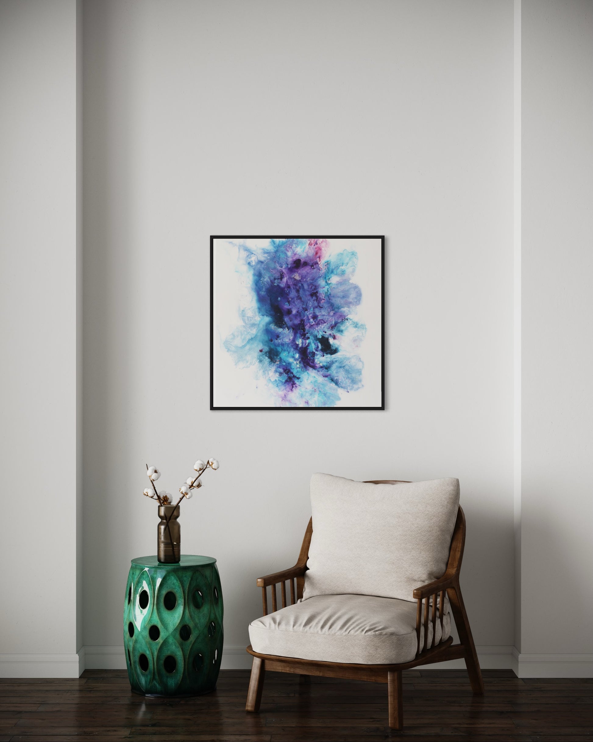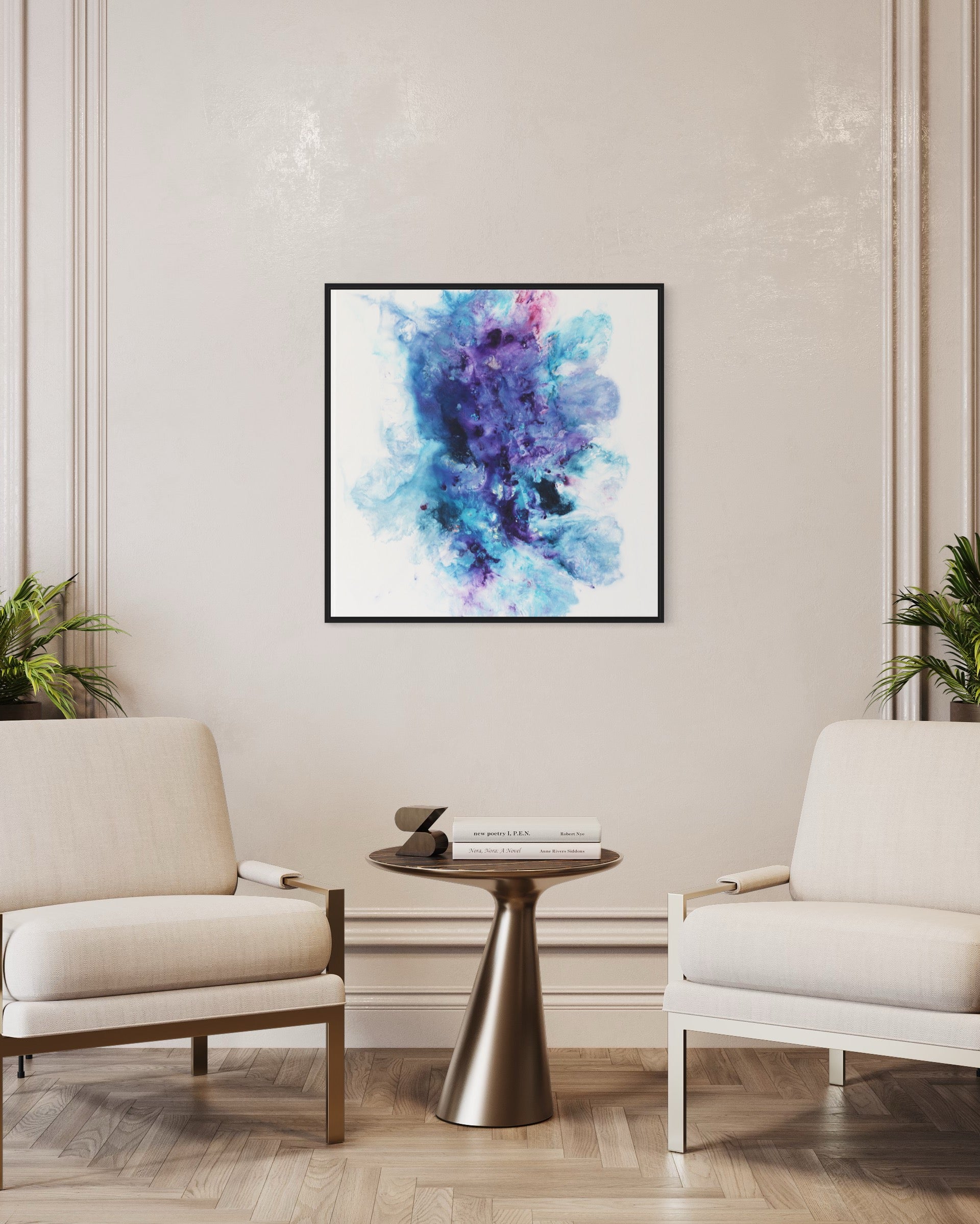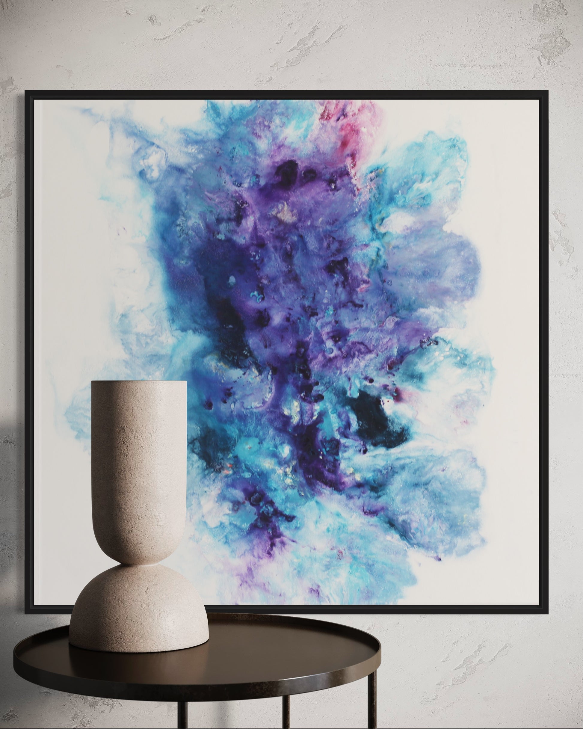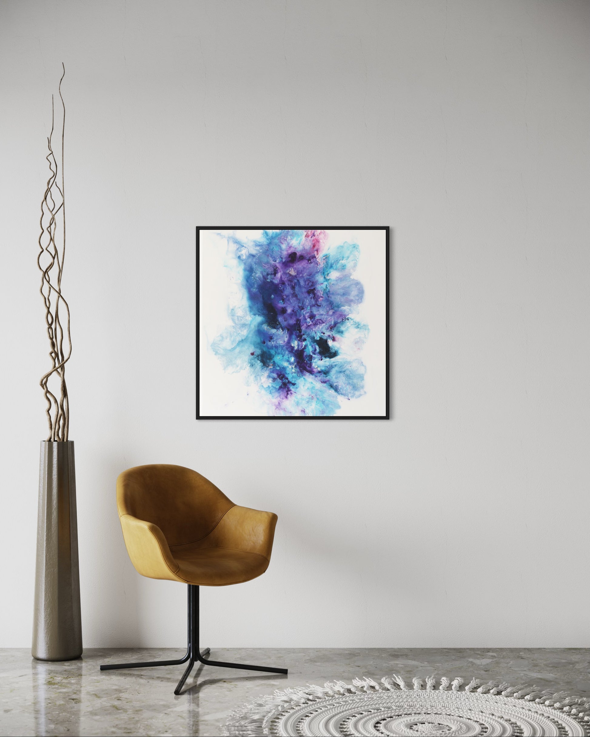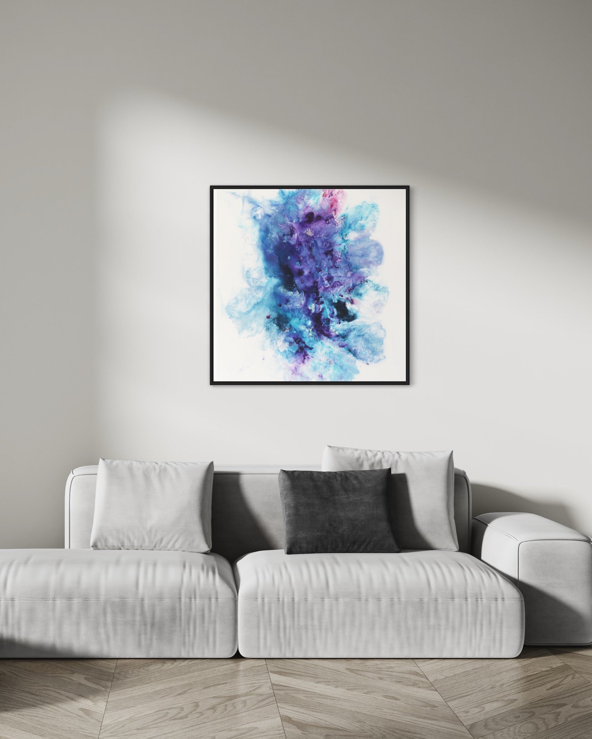 Bringe die dynamische Schönheit von "Delight" in dein Zuhause. Dieses Acrylgemälde auf Leinwand, mit den Maßen 80x80 cm, wird durch seine fließenden Blau-, Lila- und Weißtöne zu einem unverwechselbaren Highlight in jedem Raum.