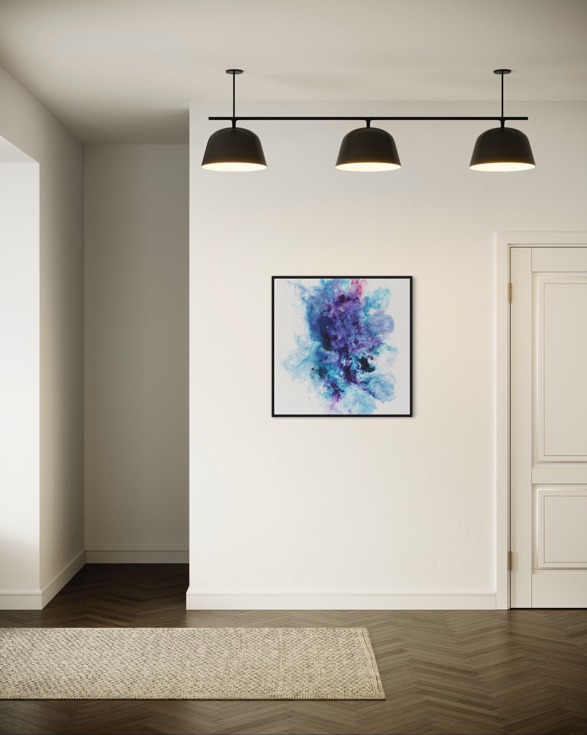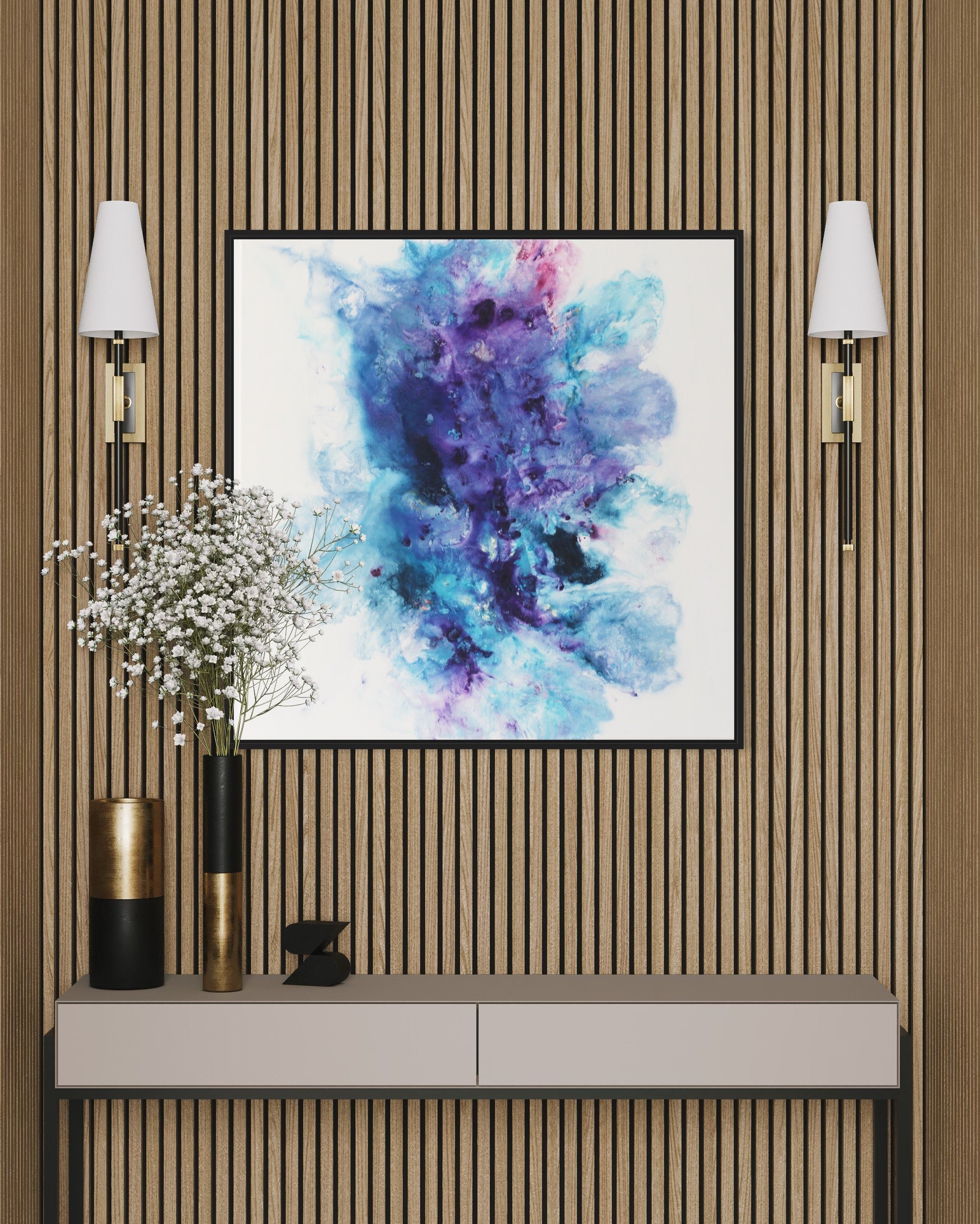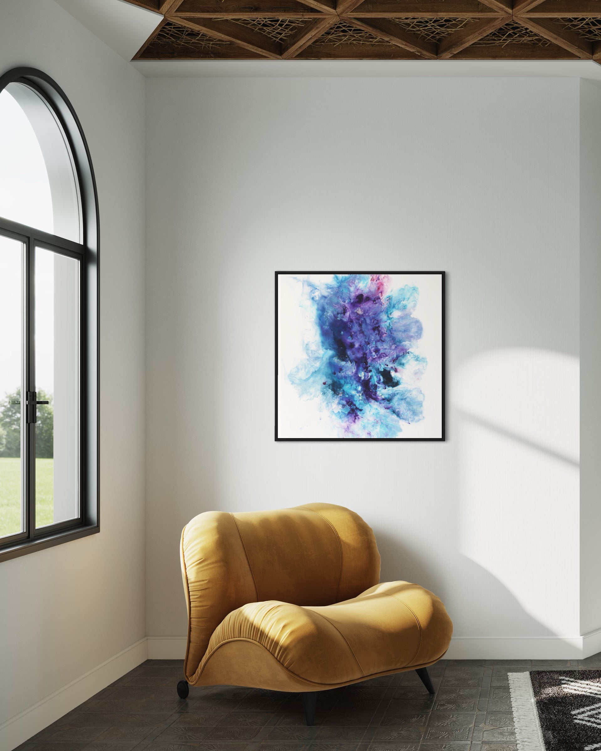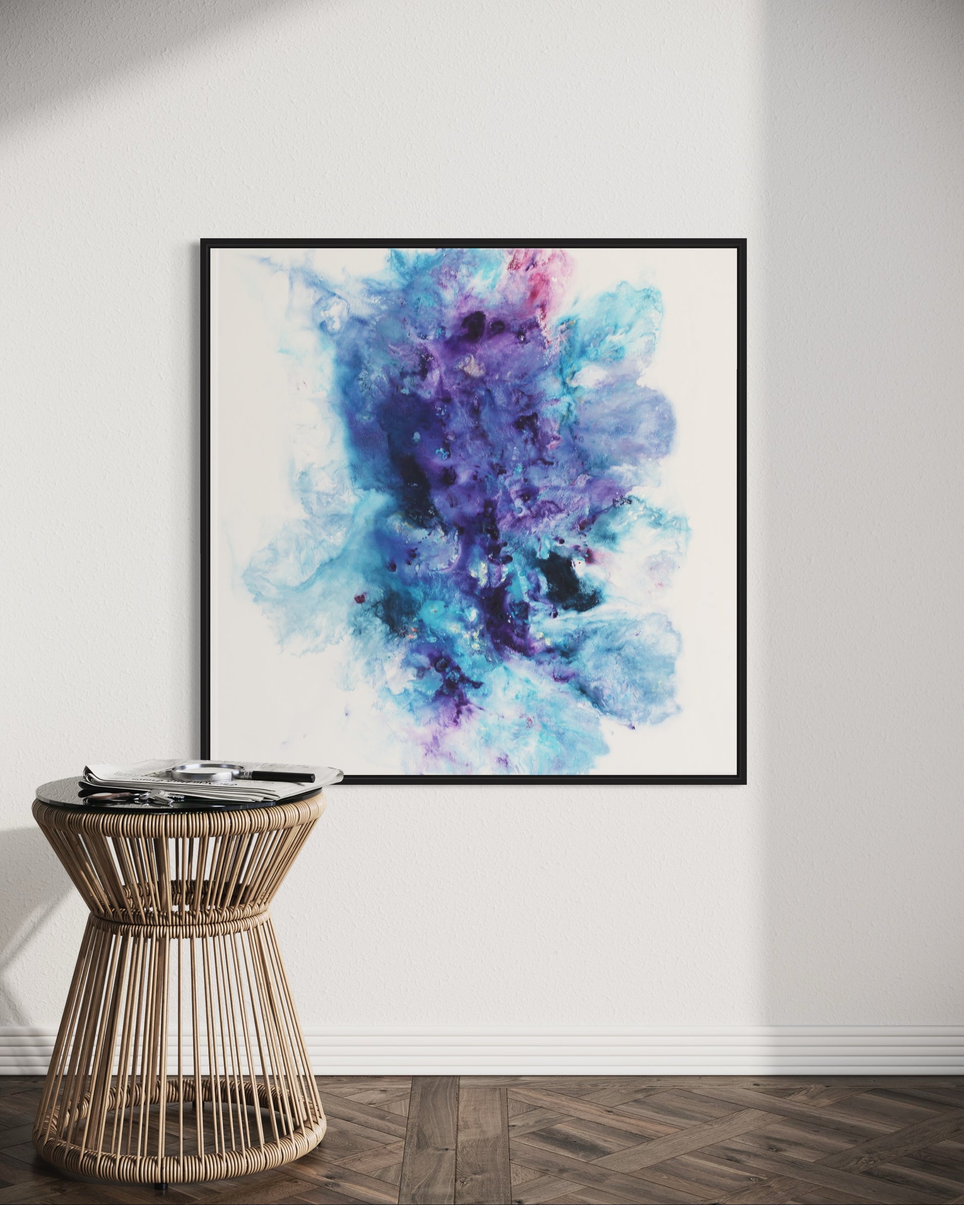 Bringe die dynamische Schönheit von "Delight" in dein Zuhause. Dieses Acrylgemälde auf Leinwand, mit den Maßen 80x80 cm, wird durch seine fließenden Blau-, Lila- und Weißtöne zu einem unverwechselbaren Highlight in jedem Raum.