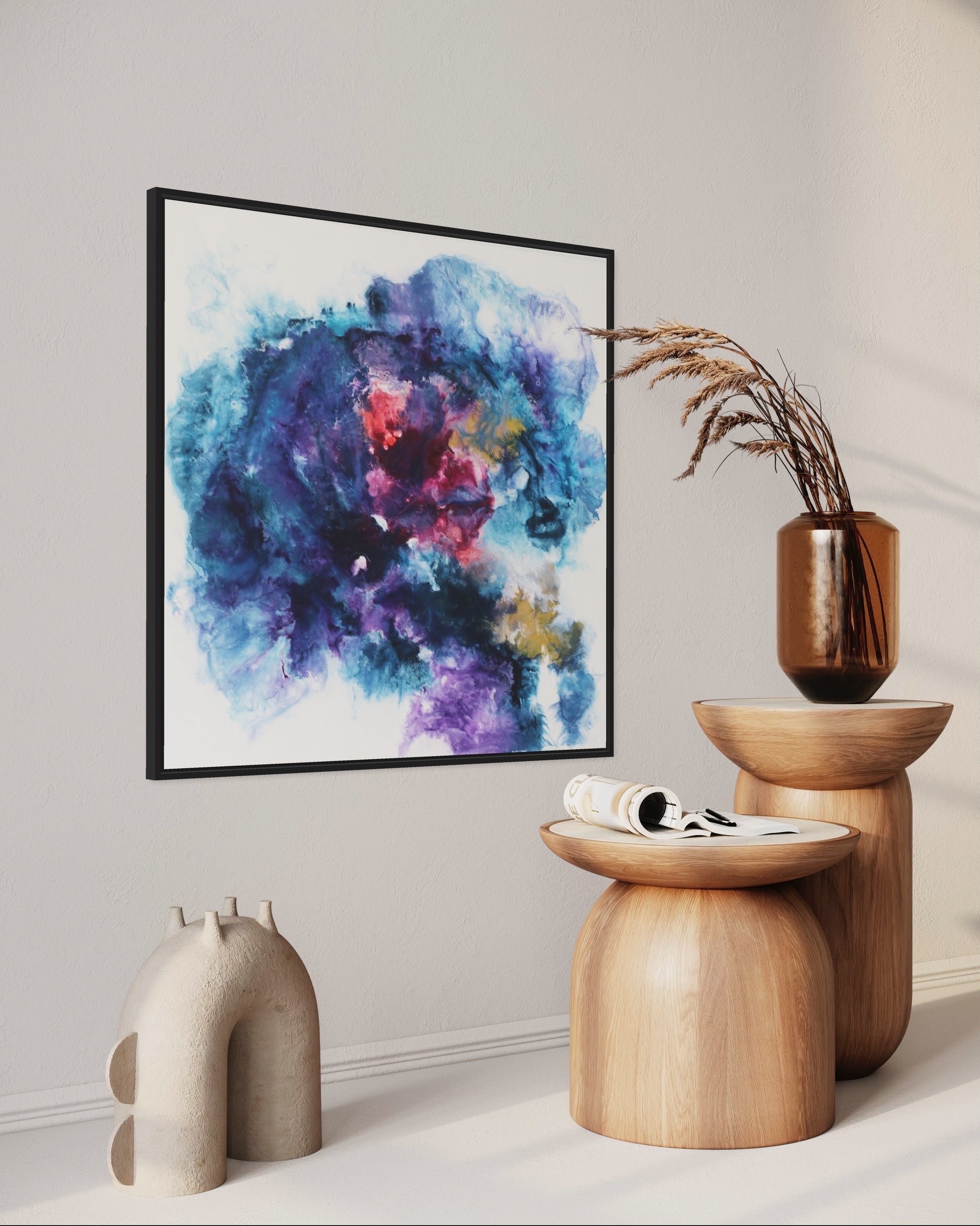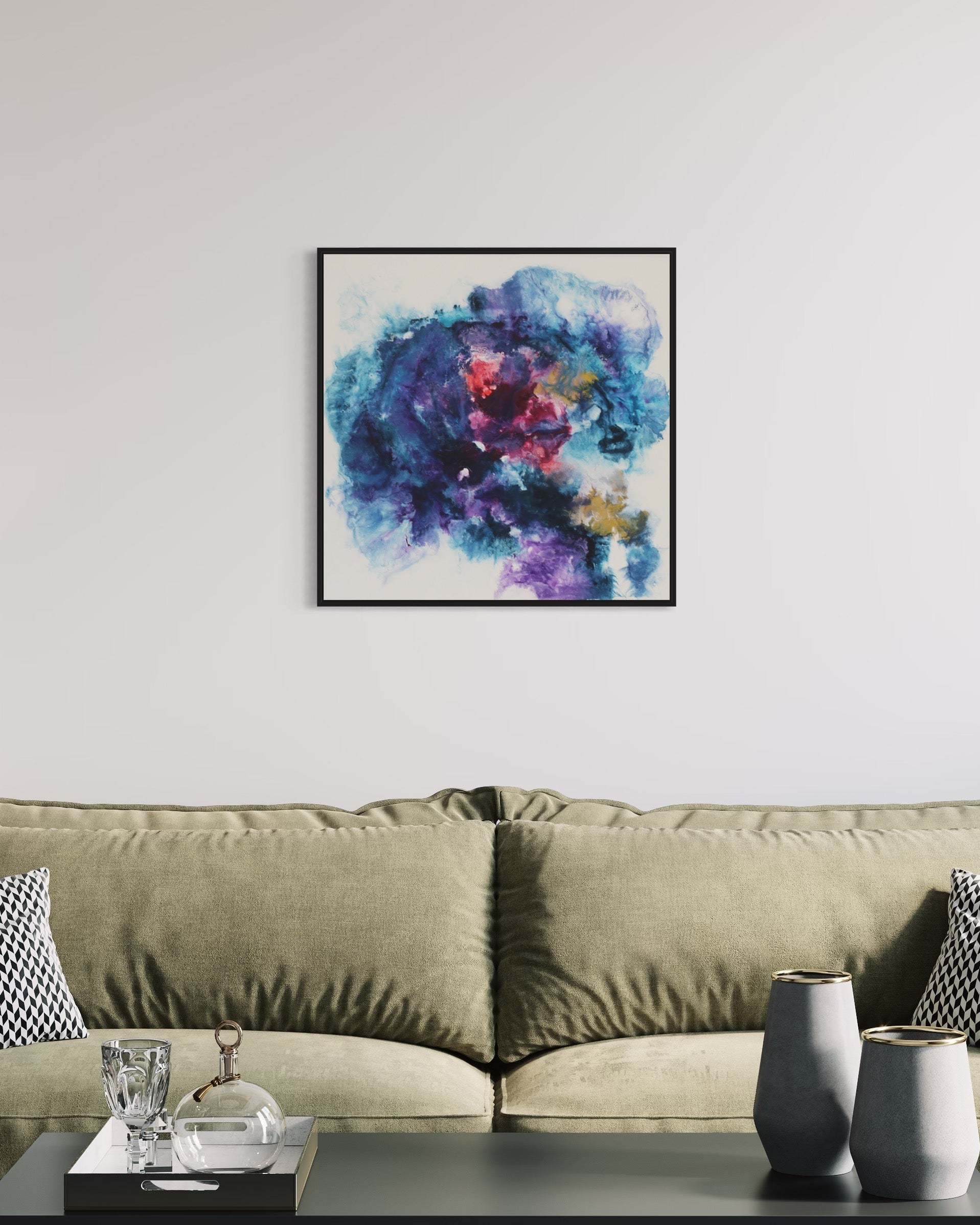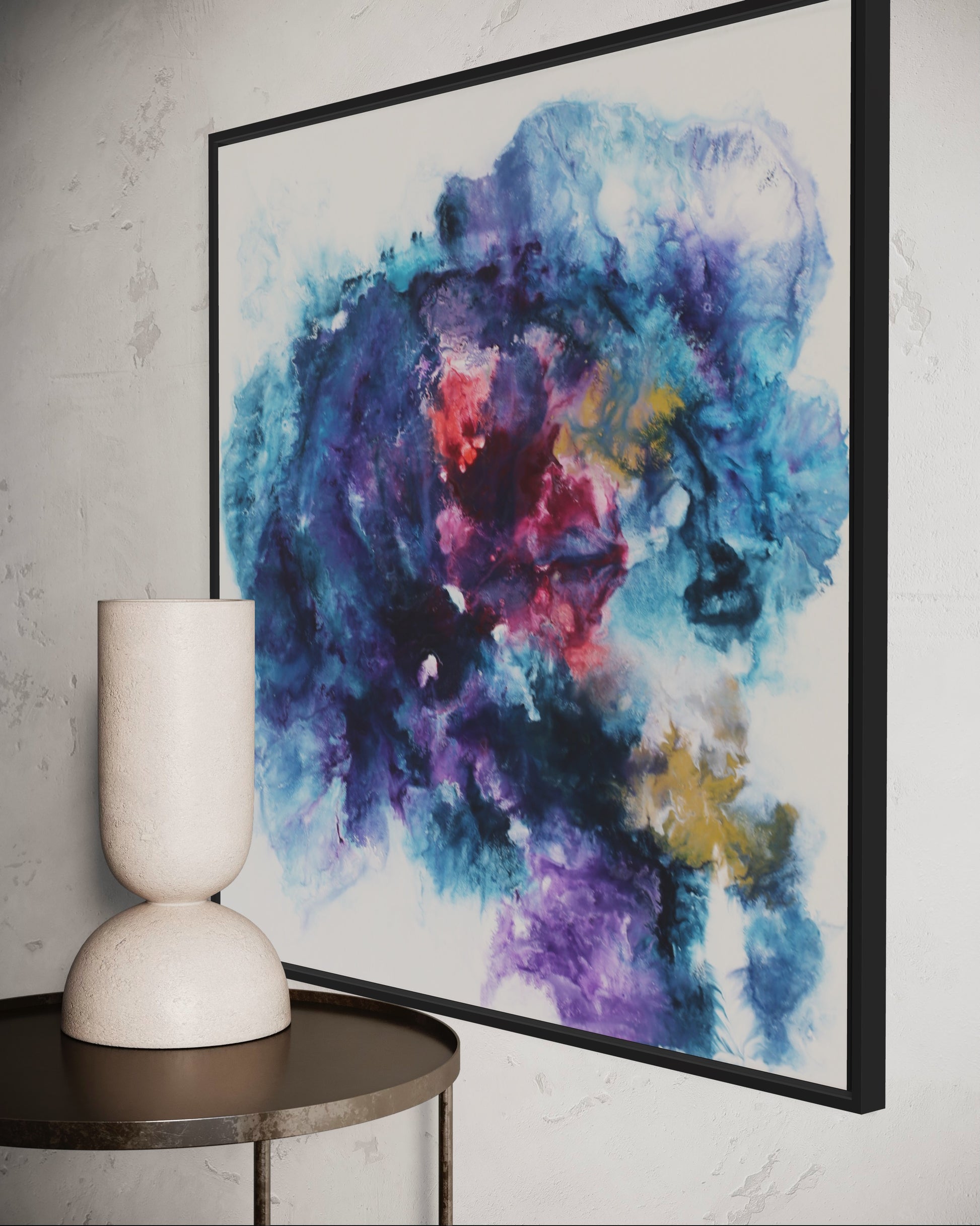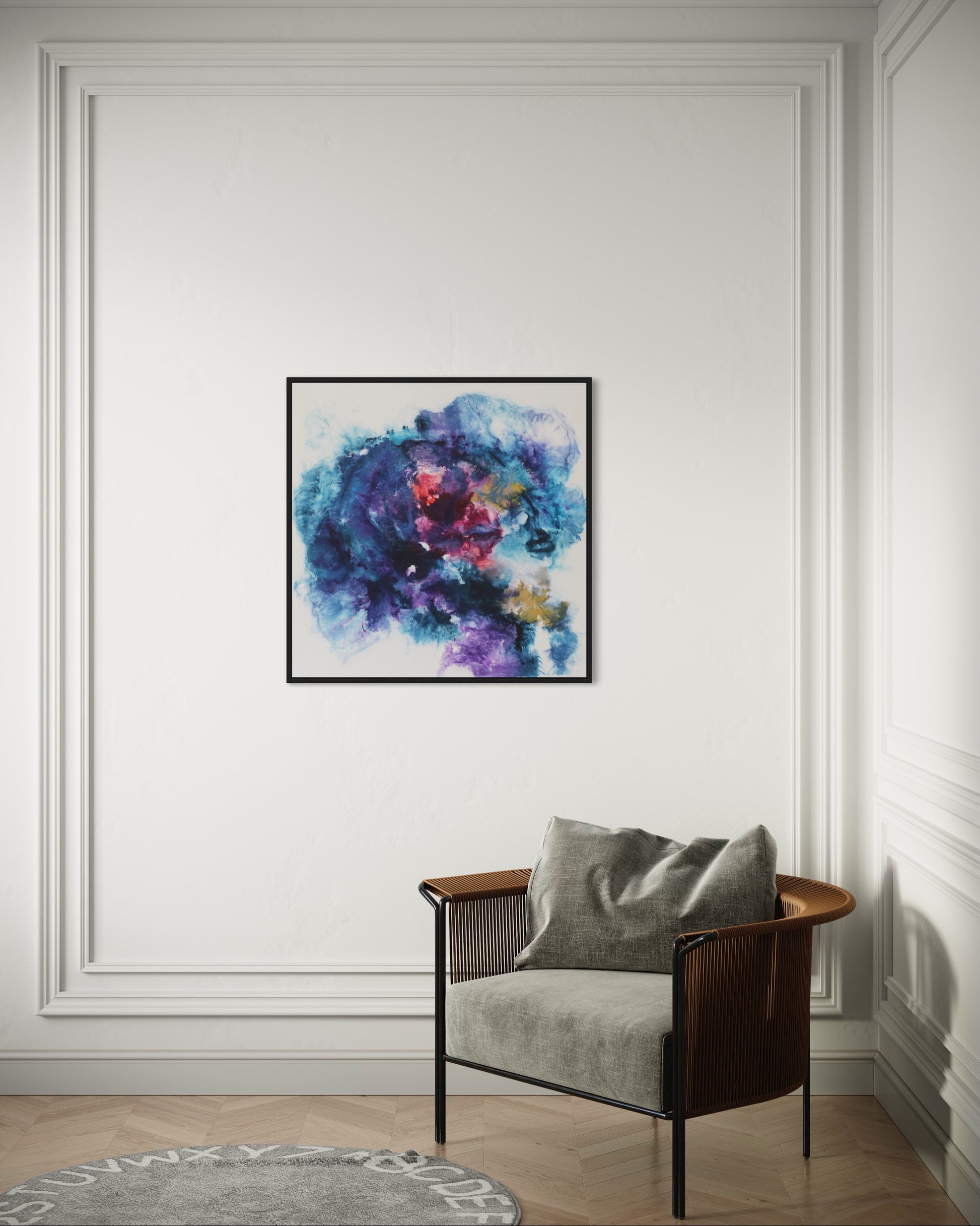Dieses einzigartige Kunstwerk wird in einem eleganten Rahmen geliefert, der das Bild perfekt ergänzt und gleichzeitig schützt. Der Rahmen verleiht dem Gemälde einen modernen und stilvollen Touch, der sich nahtlos in jede Wohn- oder Büroumgebung einfügt.