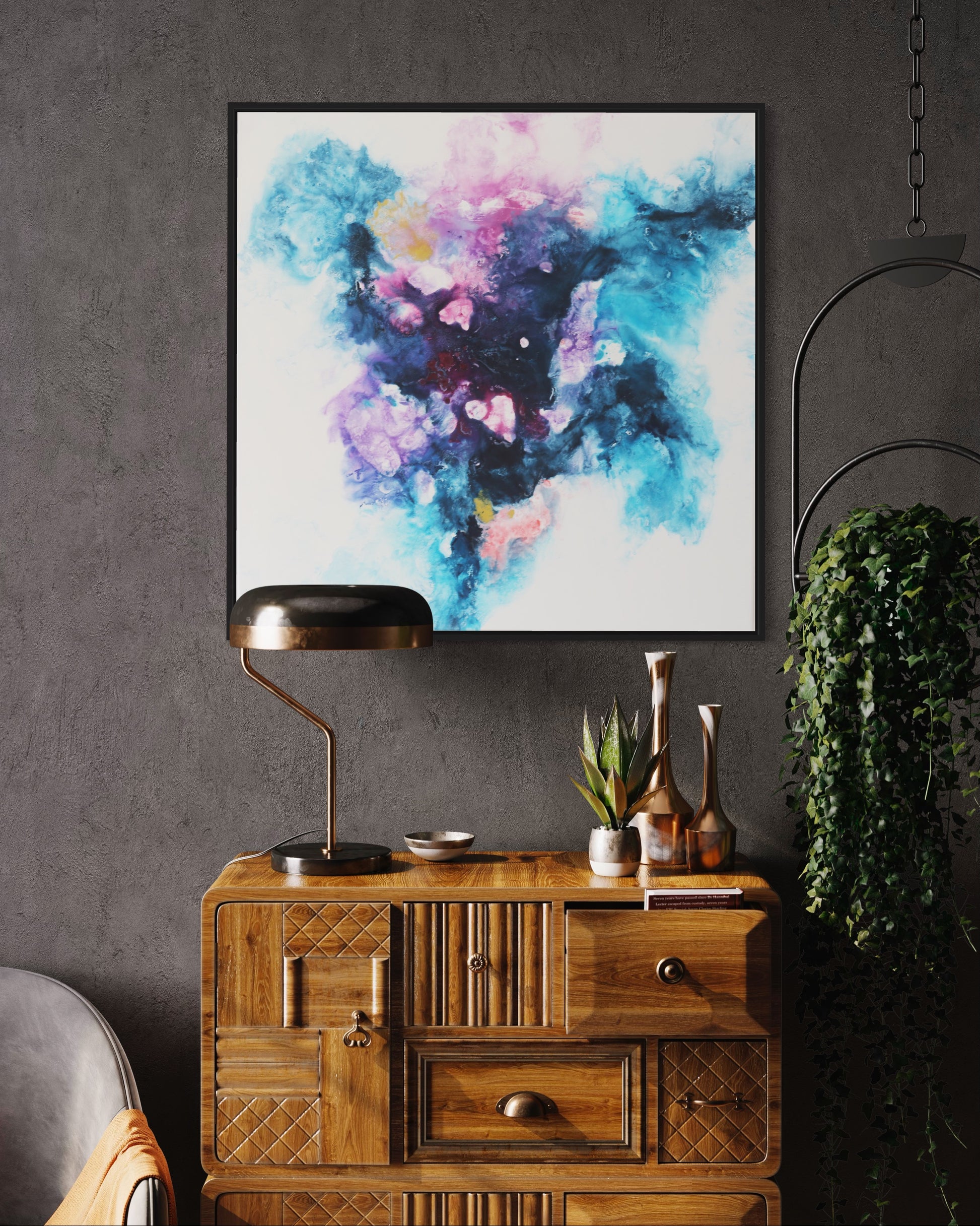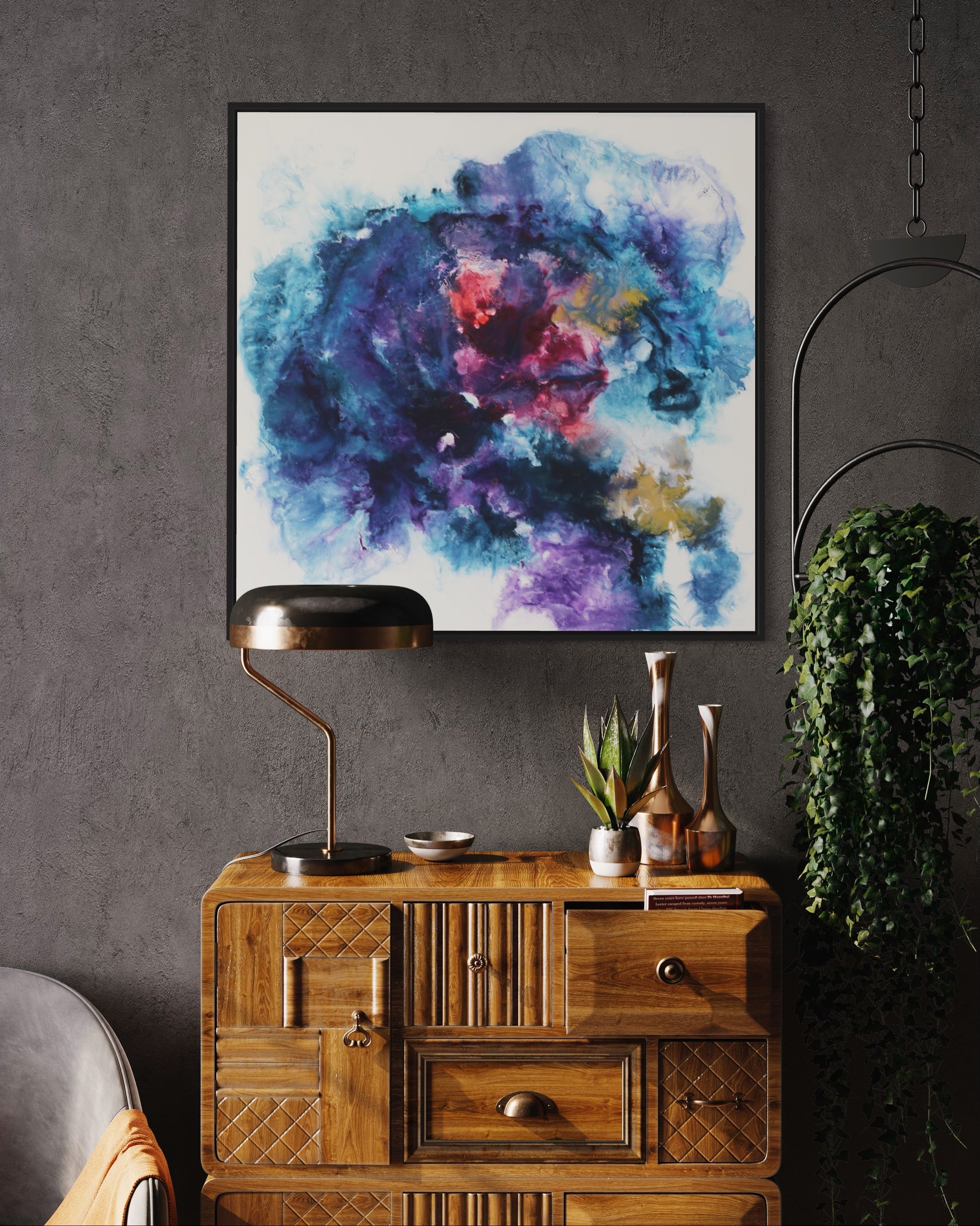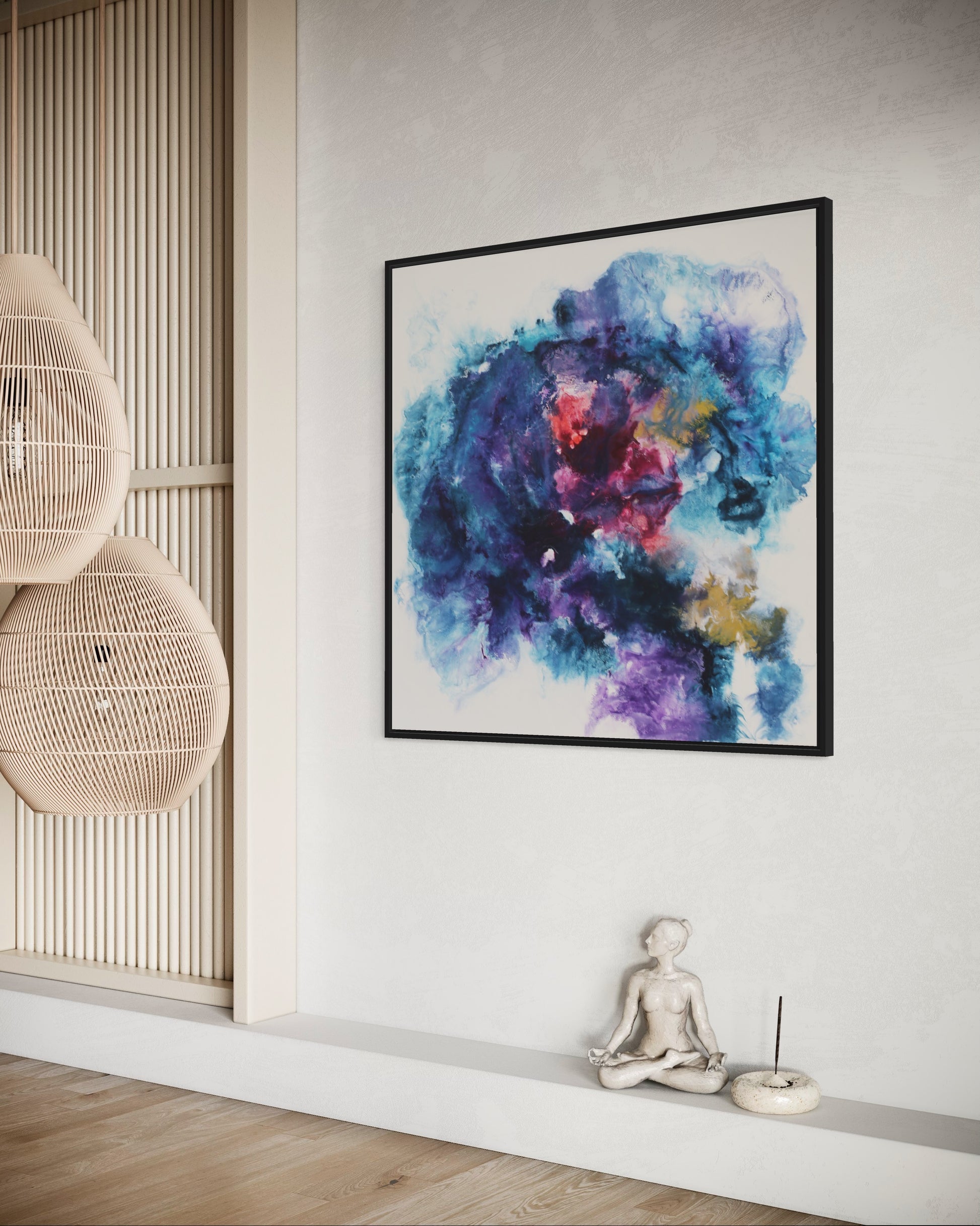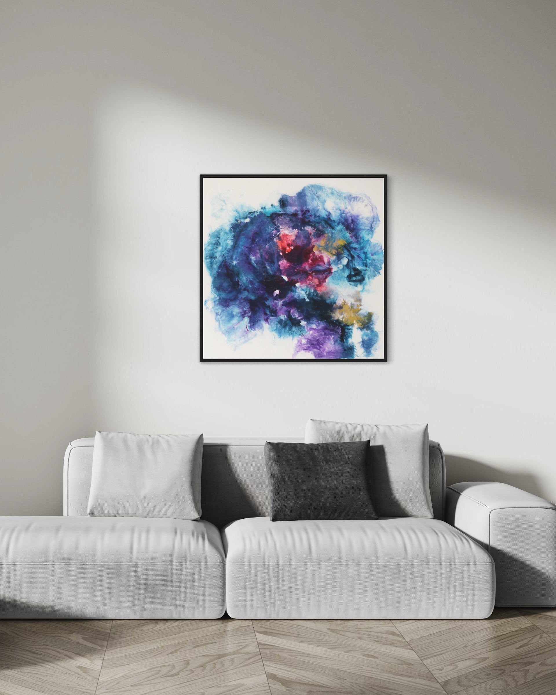 Dieses einzigartige Kunstwerk wird in einem eleganten Rahmen geliefert, der das Bild perfekt ergänzt und gleichzeitig schützt. Der Rahmen verleiht dem Gemälde einen modernen und stilvollen Touch, der sich nahtlos in jede Wohn- oder Büroumgebung einfügt.