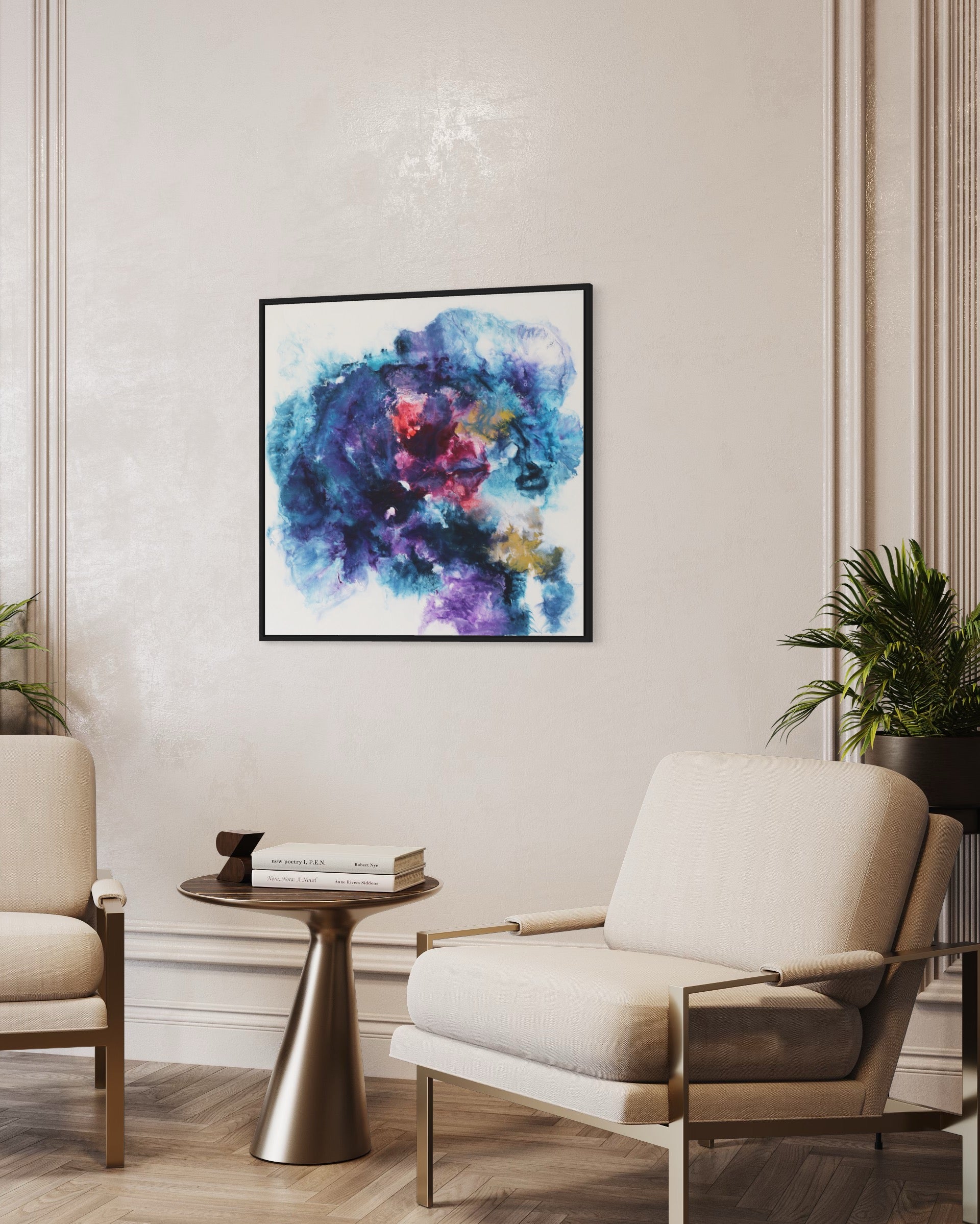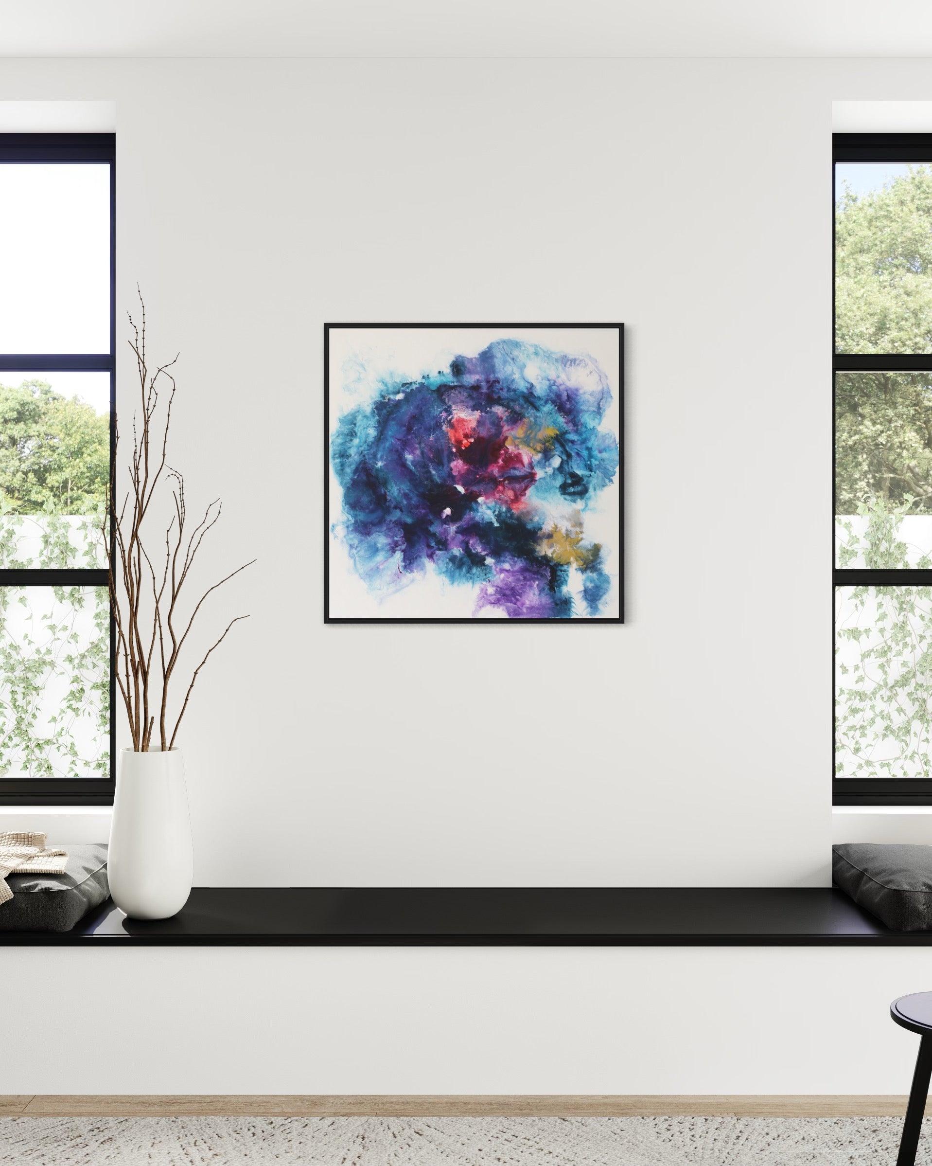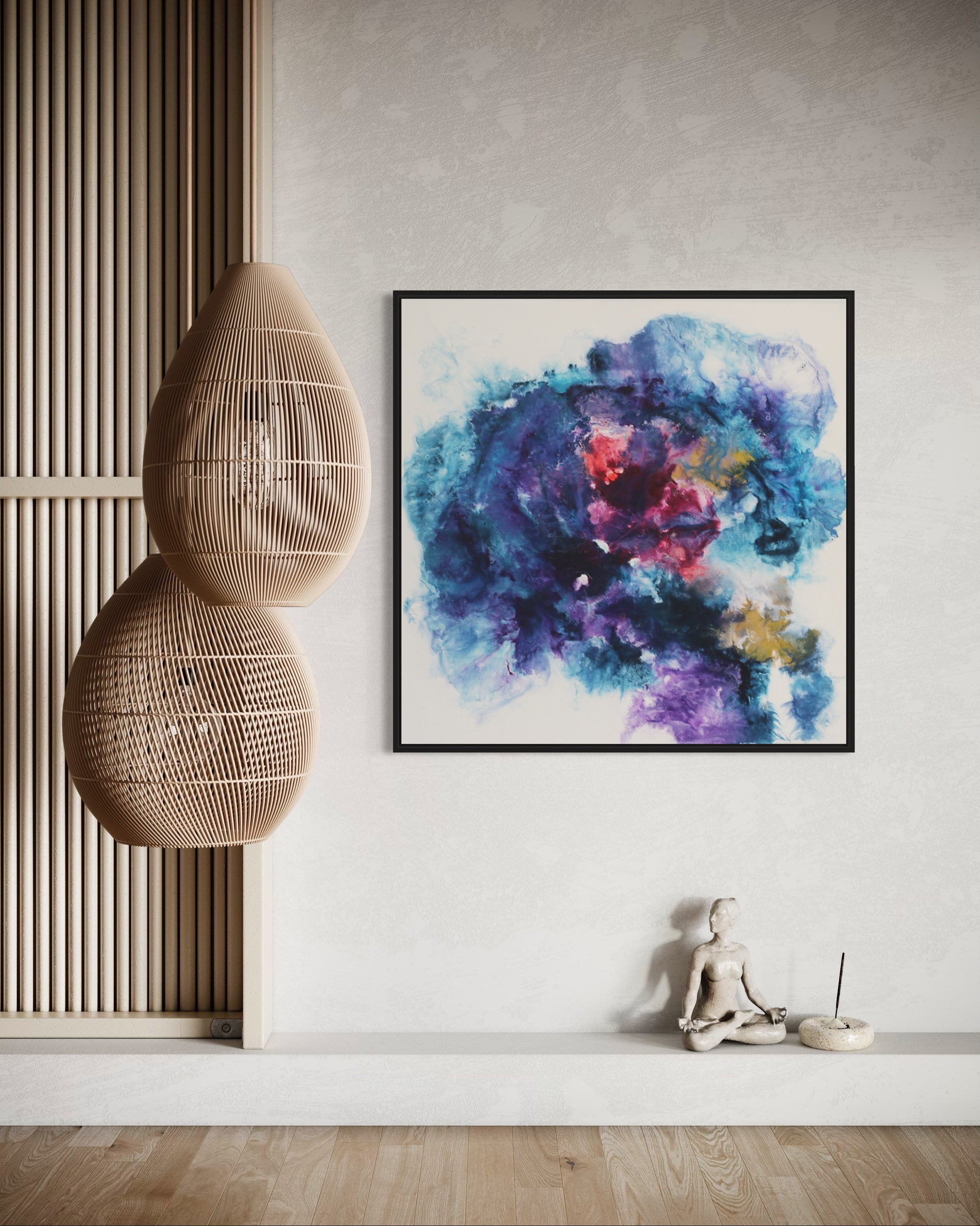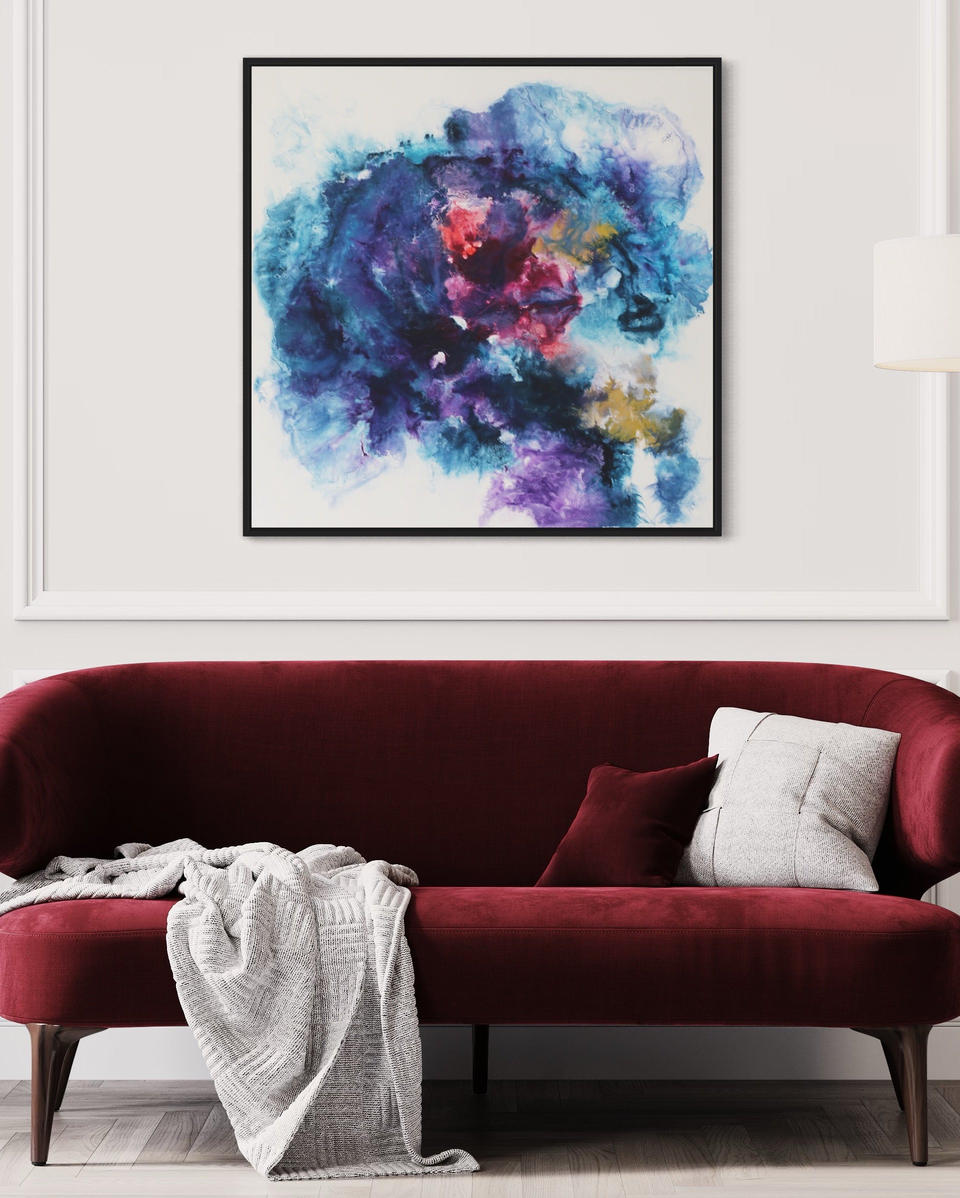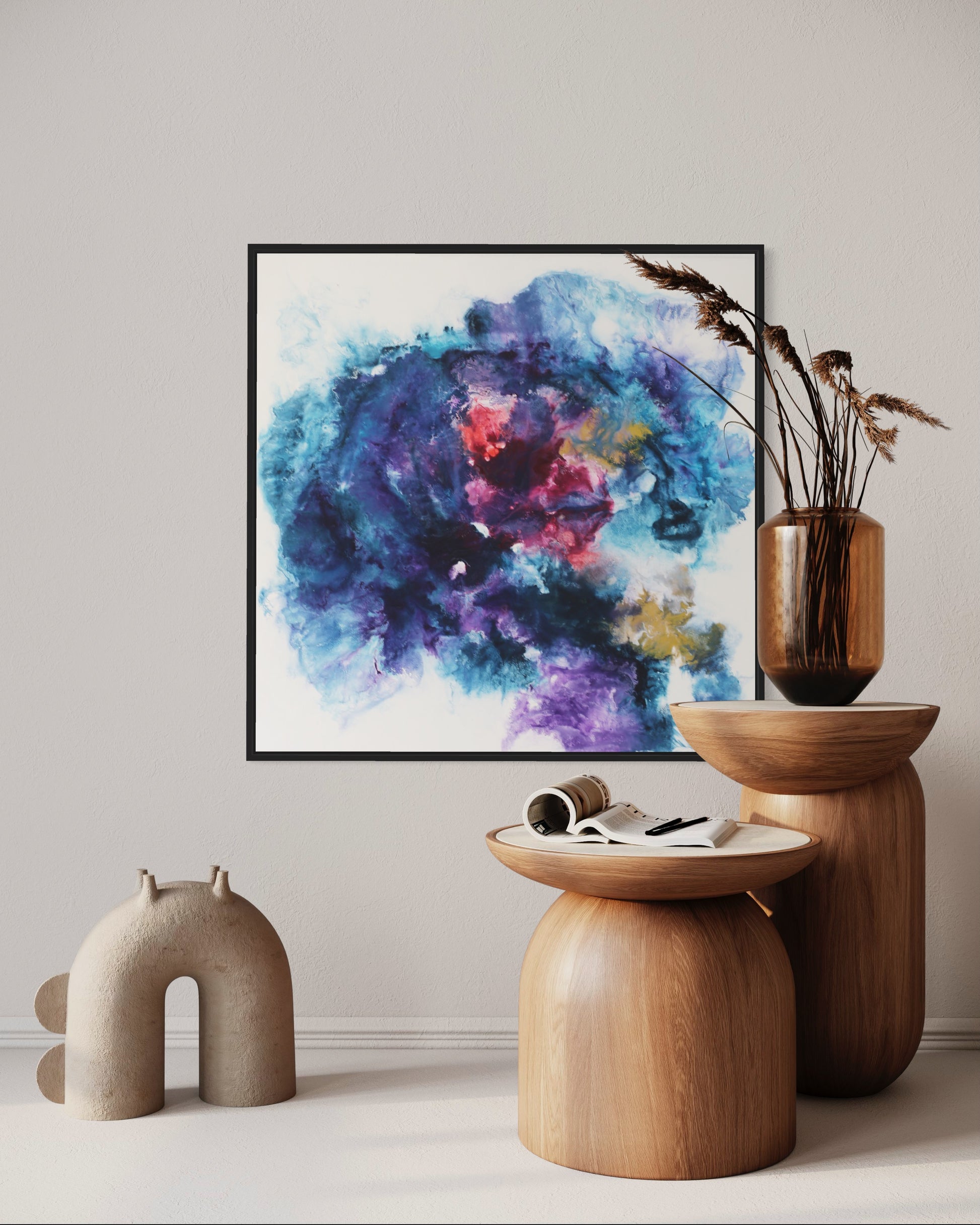 Dieses einzigartige Kunstwerk wird in einem eleganten Rahmen geliefert, der das Bild perfekt ergänzt und gleichzeitig schützt. Der Rahmen verleiht dem Gemälde einen modernen und stilvollen Touch, der sich nahtlos in jede Wohn- oder Büroumgebung einfügt.