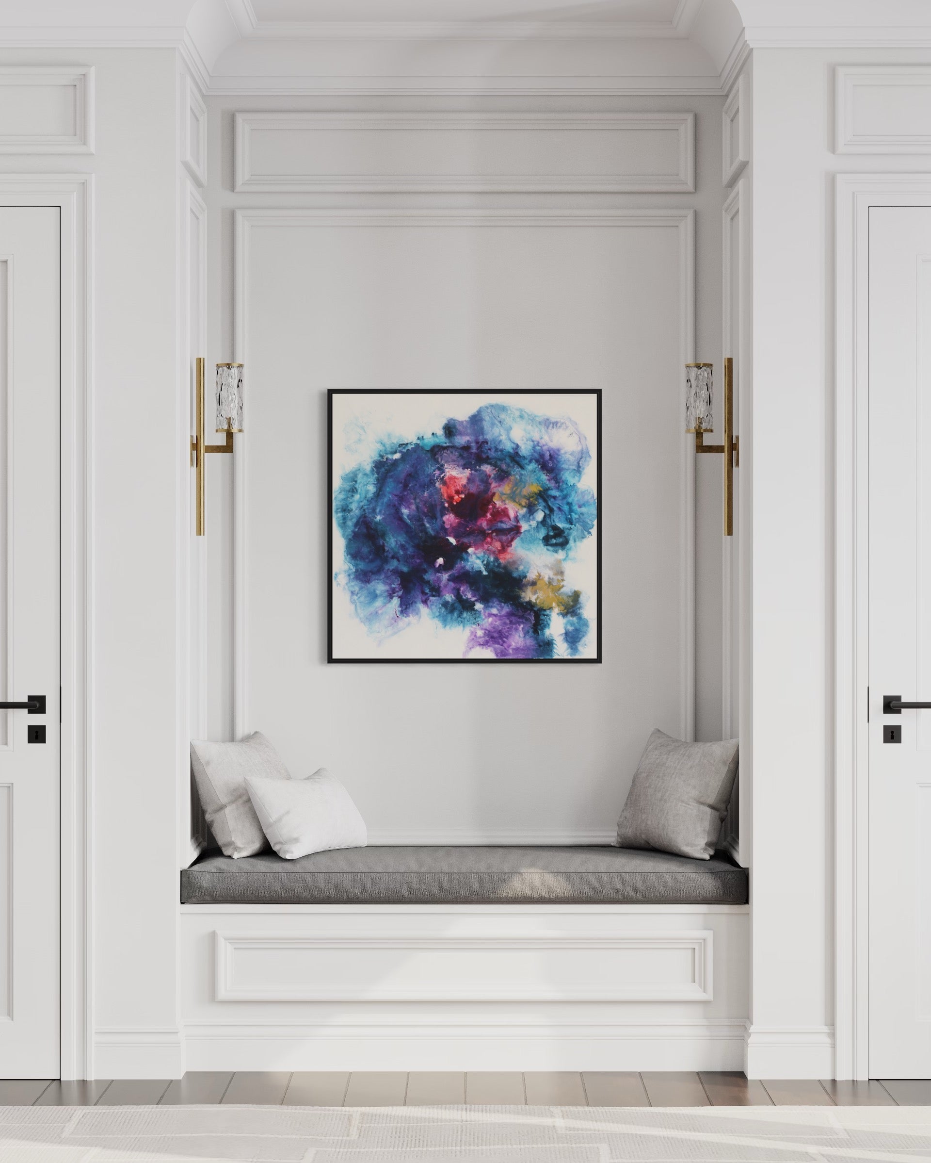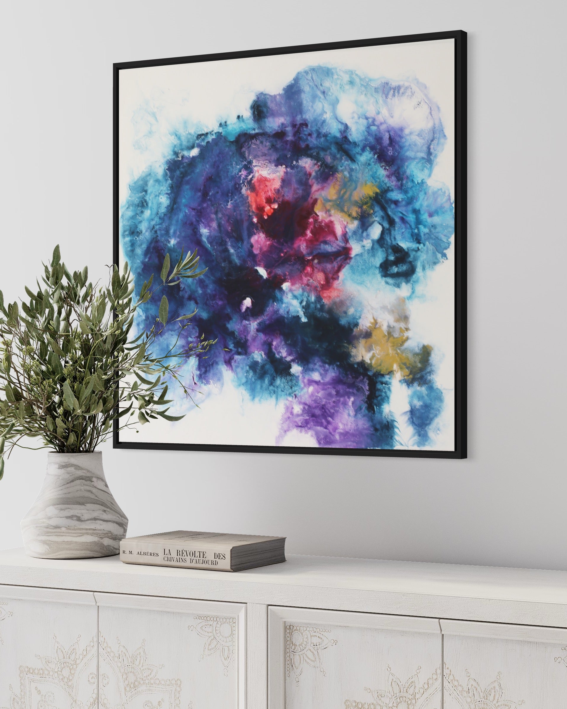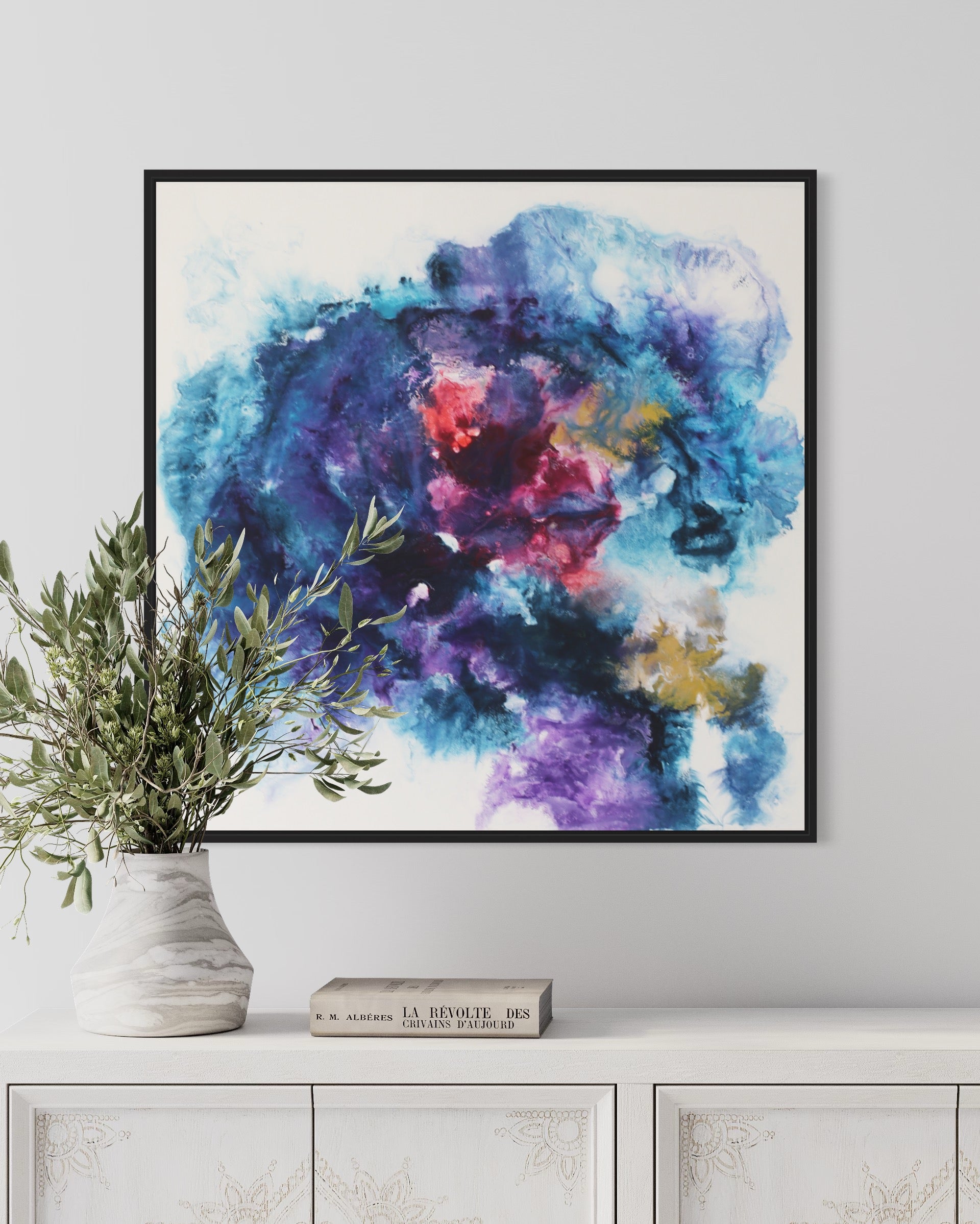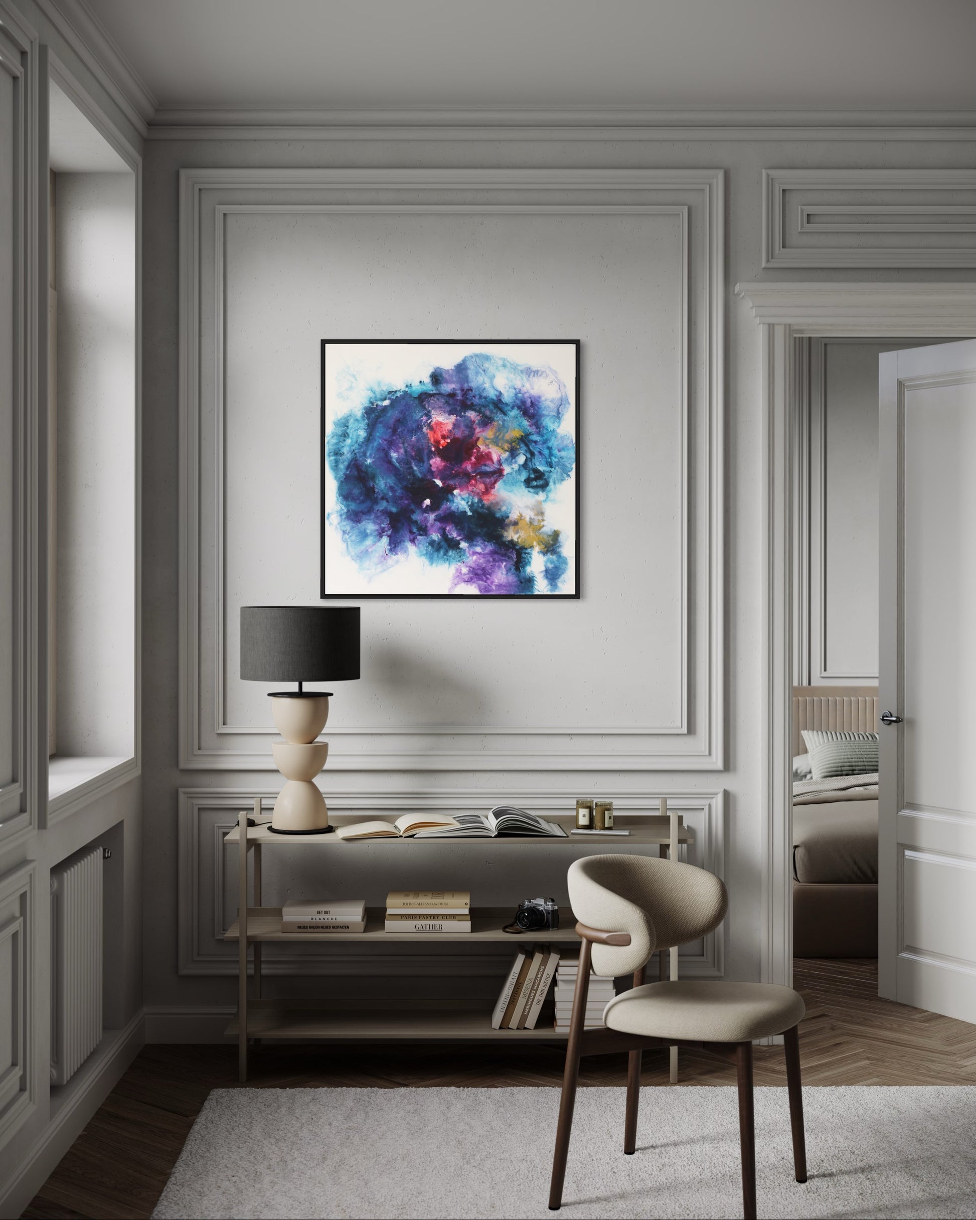 Dieses einzigartige Kunstwerk wird in einem eleganten Rahmen geliefert, der das Bild perfekt ergänzt und gleichzeitig schützt. Der Rahmen verleiht dem Gemälde einen modernen und stilvollen Touch, der sich nahtlos in jede Wohn- oder Büroumgebung einfügt.