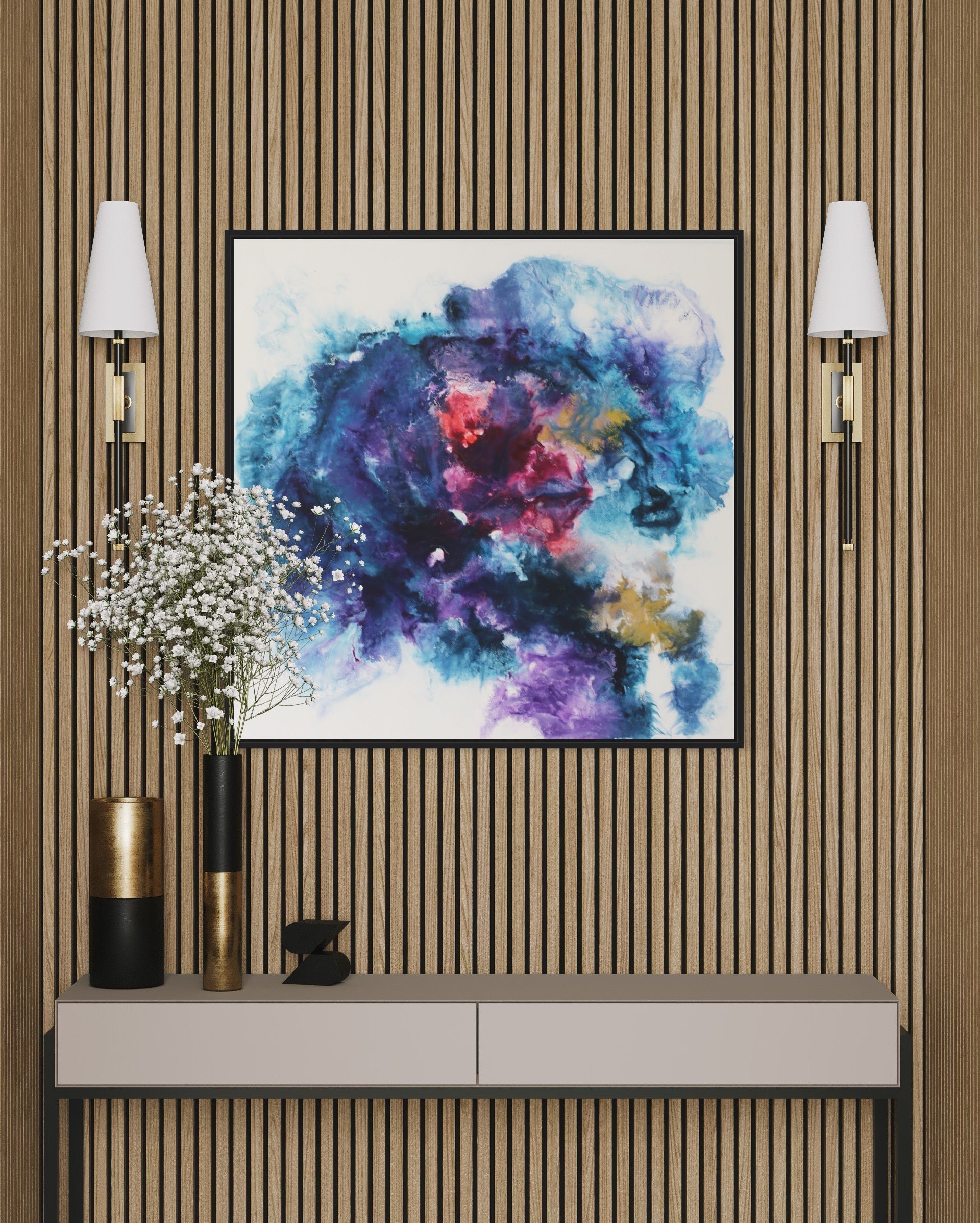 Jedes Detail dieses Gemäldes ist mit größter Sorgfalt und Kreativität gestaltet, um eine visuelle Darstellung von Energie und Bewegung zu schaffen, die in deinem Raum für Inspiration und Staunen sorgt. Die kräftigen Blautöne, kombiniert mit lebhaften Rot-, Gold- und Violett Akzenten, erzeugen eine tiefgründige und faszinierende Komposition, die an die unendliche Weite des Universums erinnert.
