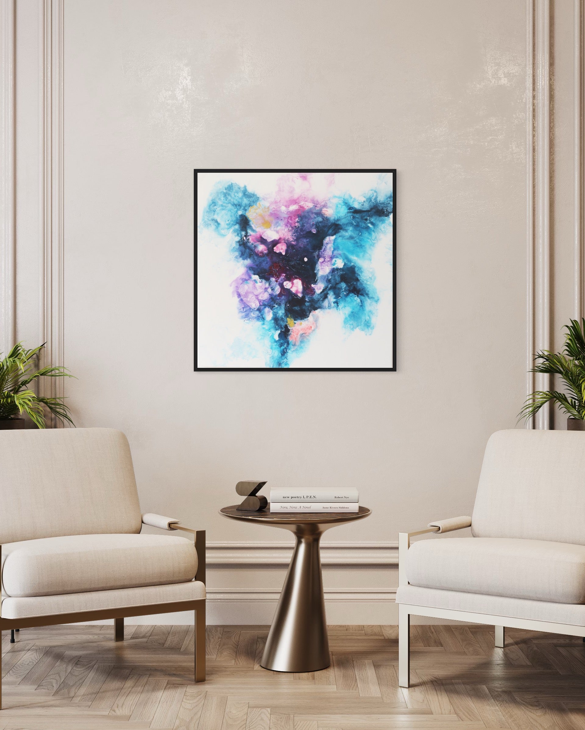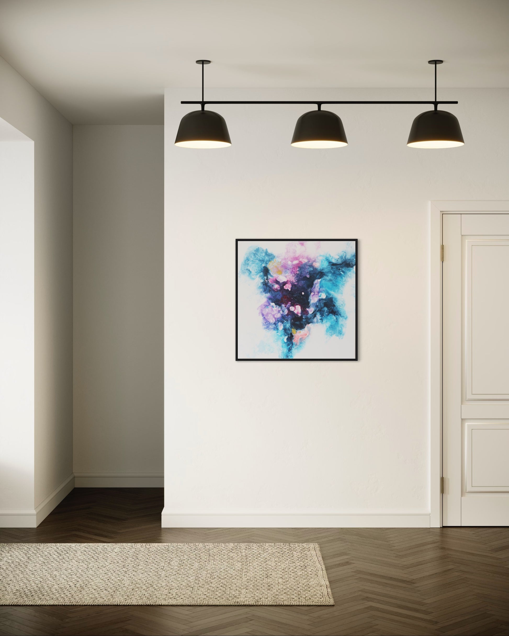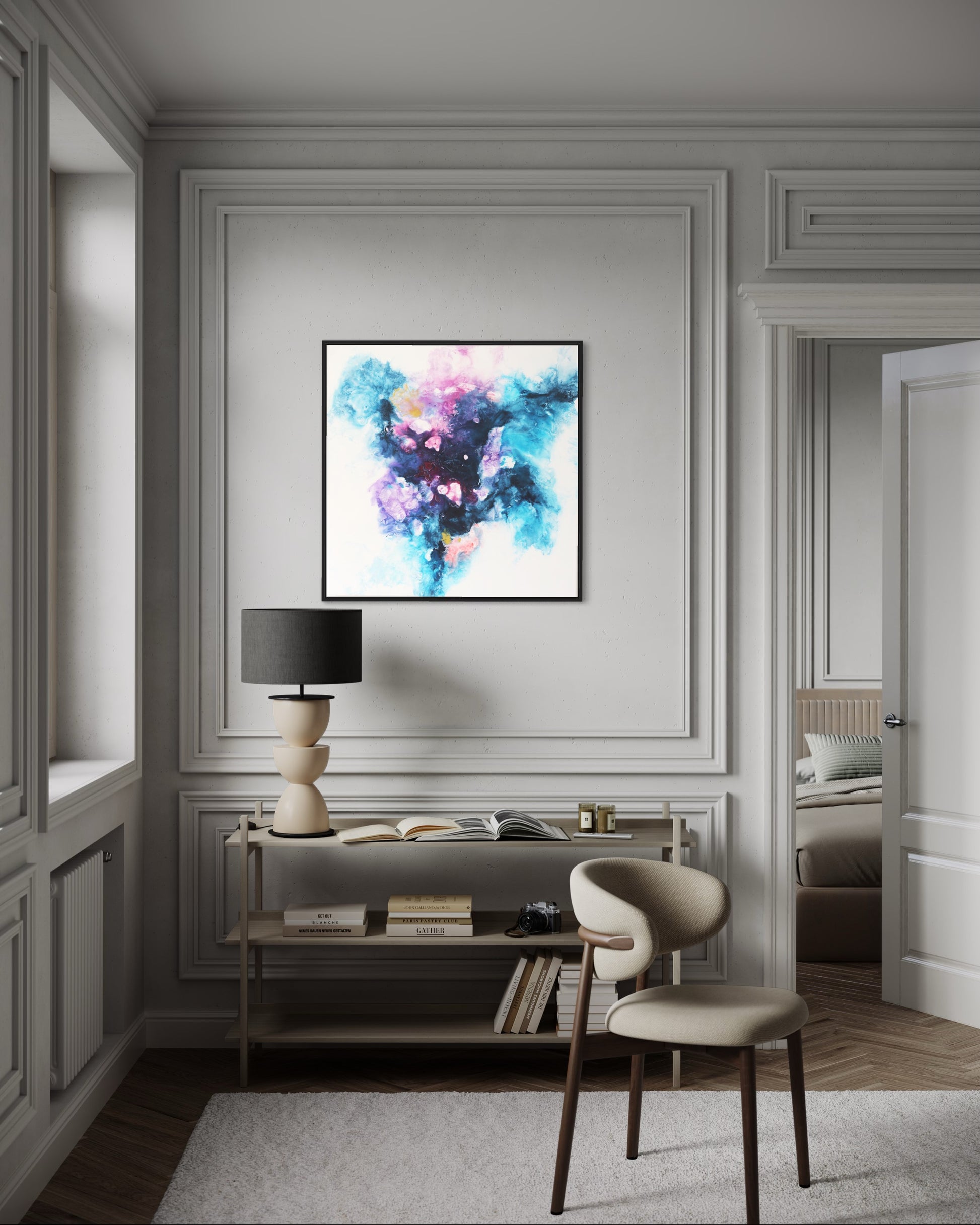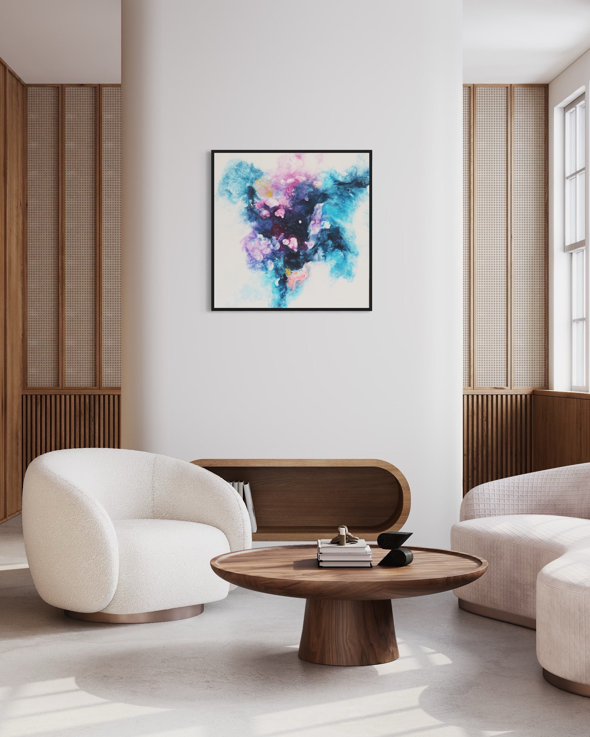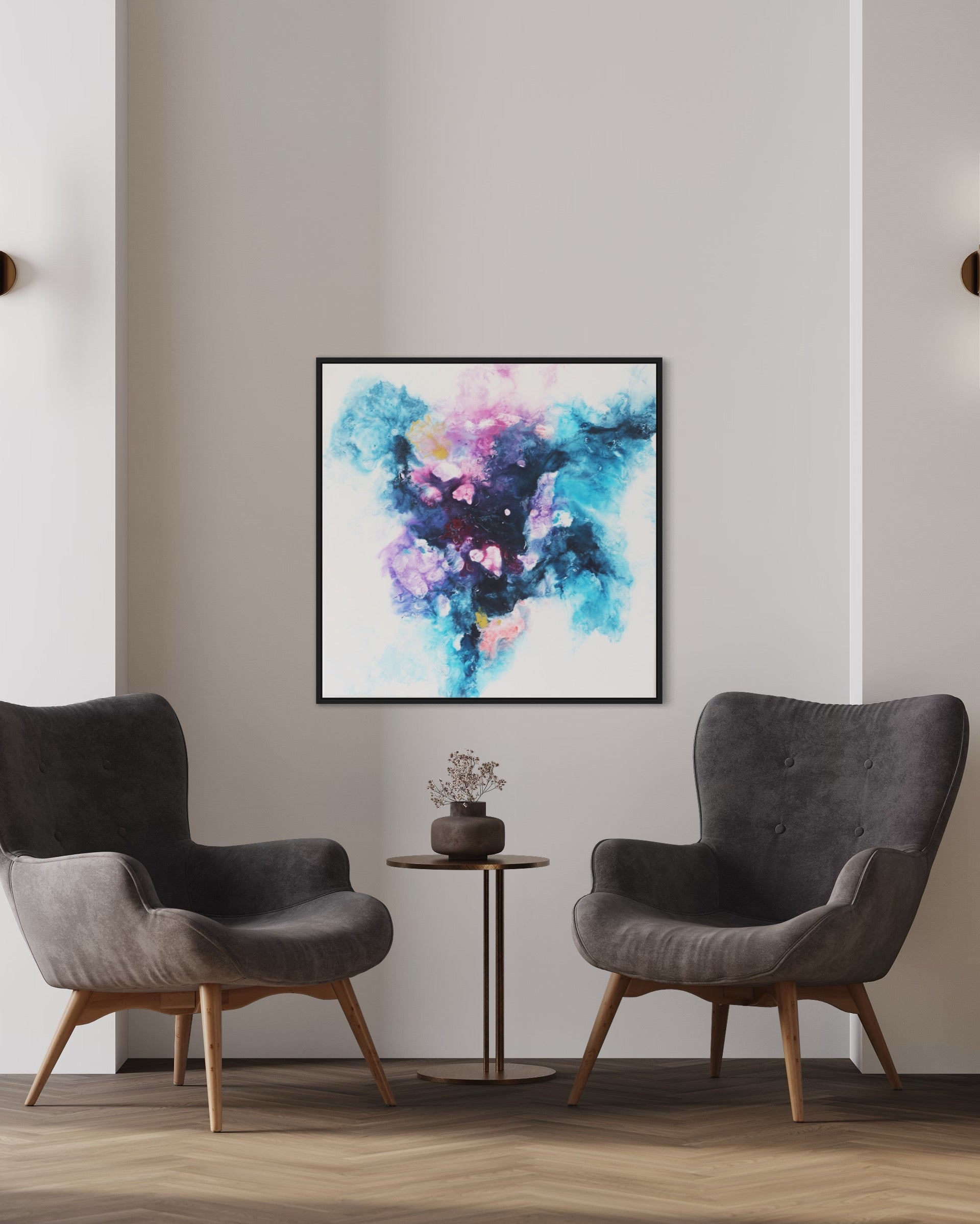 Verwandle deinen Raum mit "Sphere," einem faszinierenden abstrakten Acrylgemälde auf Leinwand, meisterhaft gefertigt mit der Fliestechnik. Dieses beeindruckende Kunstwerk, das eine Größe von 80x80 cm misst, besticht durch eine lebendige Mischung aus Blau-, Lila- und Rosatönen und schafft eine dynamische und ätherische Komposition, die jeden Kunstliebhaber begeistern wird.