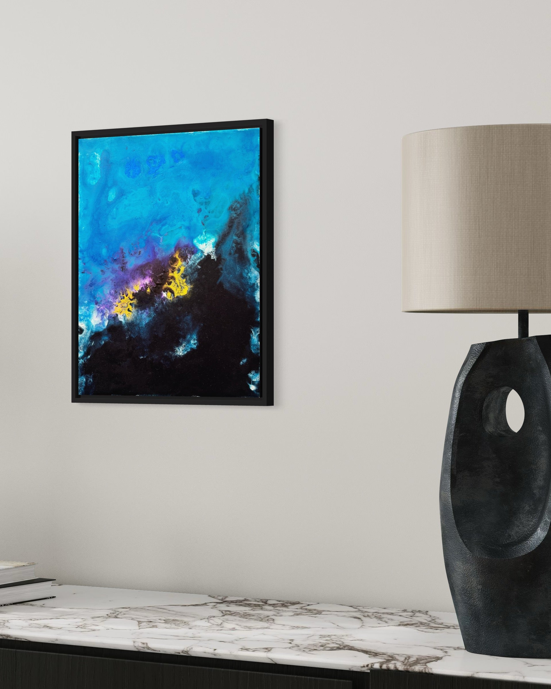 Das Bild misst 50x40 cm und wurde mit hochwertigen Acrylfarben auf Leinwand geschaffen. Es wird in einem eleganten schwarzen Rahmen geliefert, der die lebhaften Farben perfekt zur Geltung bringt und dir die Möglichkeit bietet, es sofort aufzuhängen.