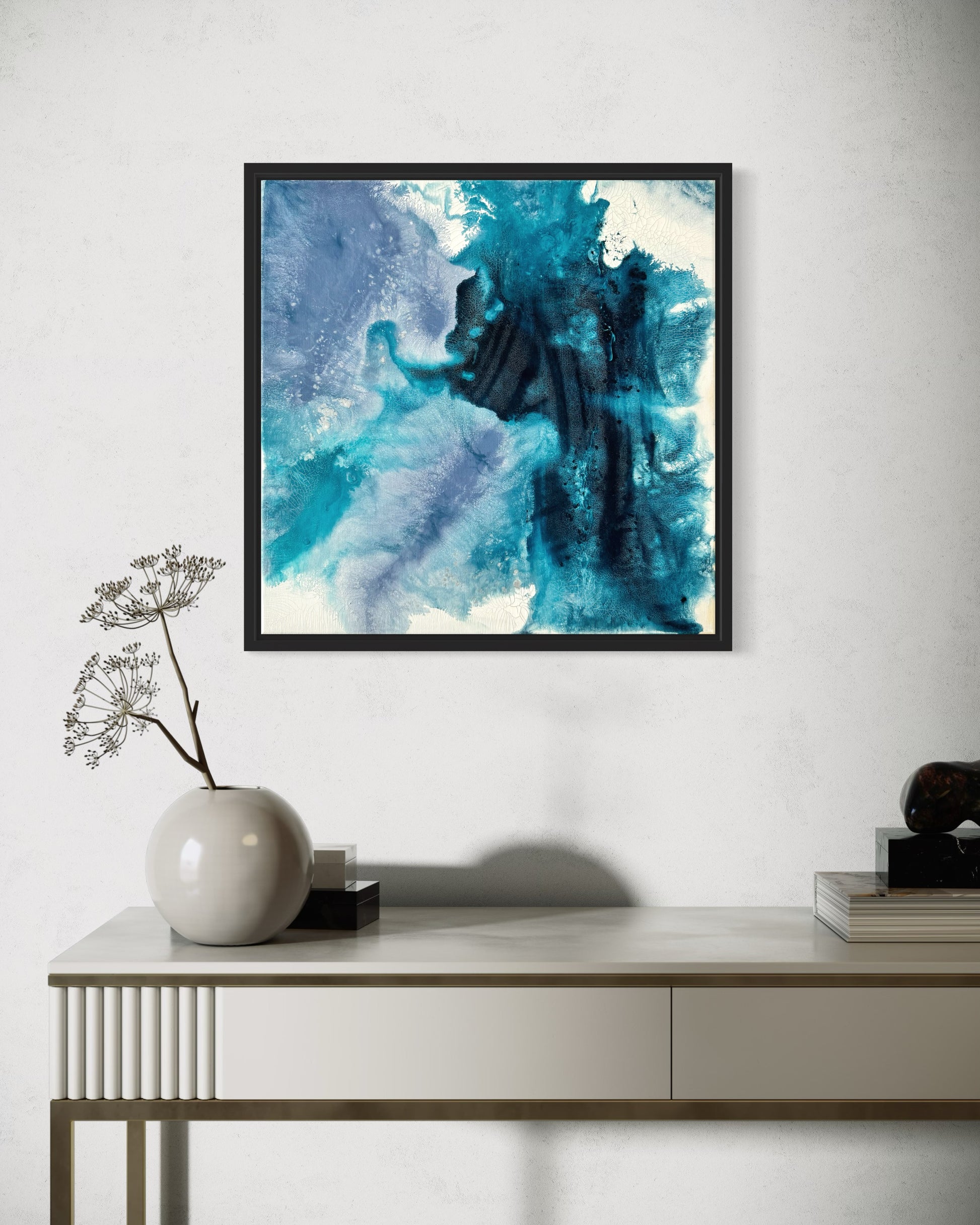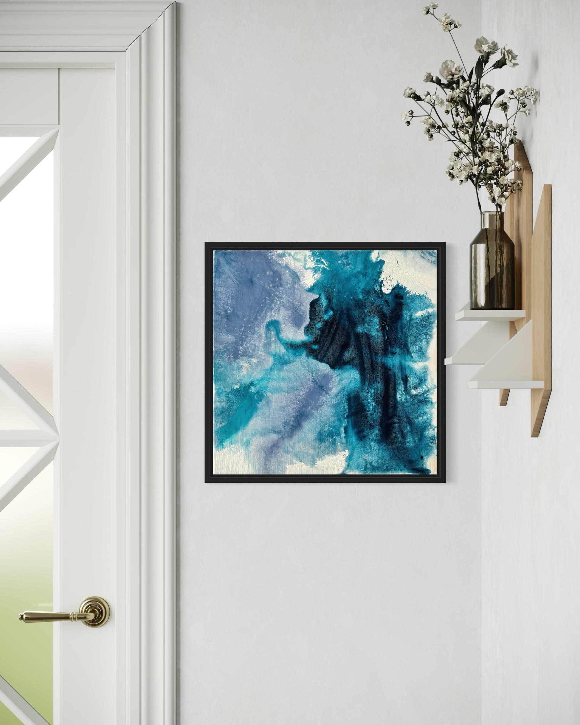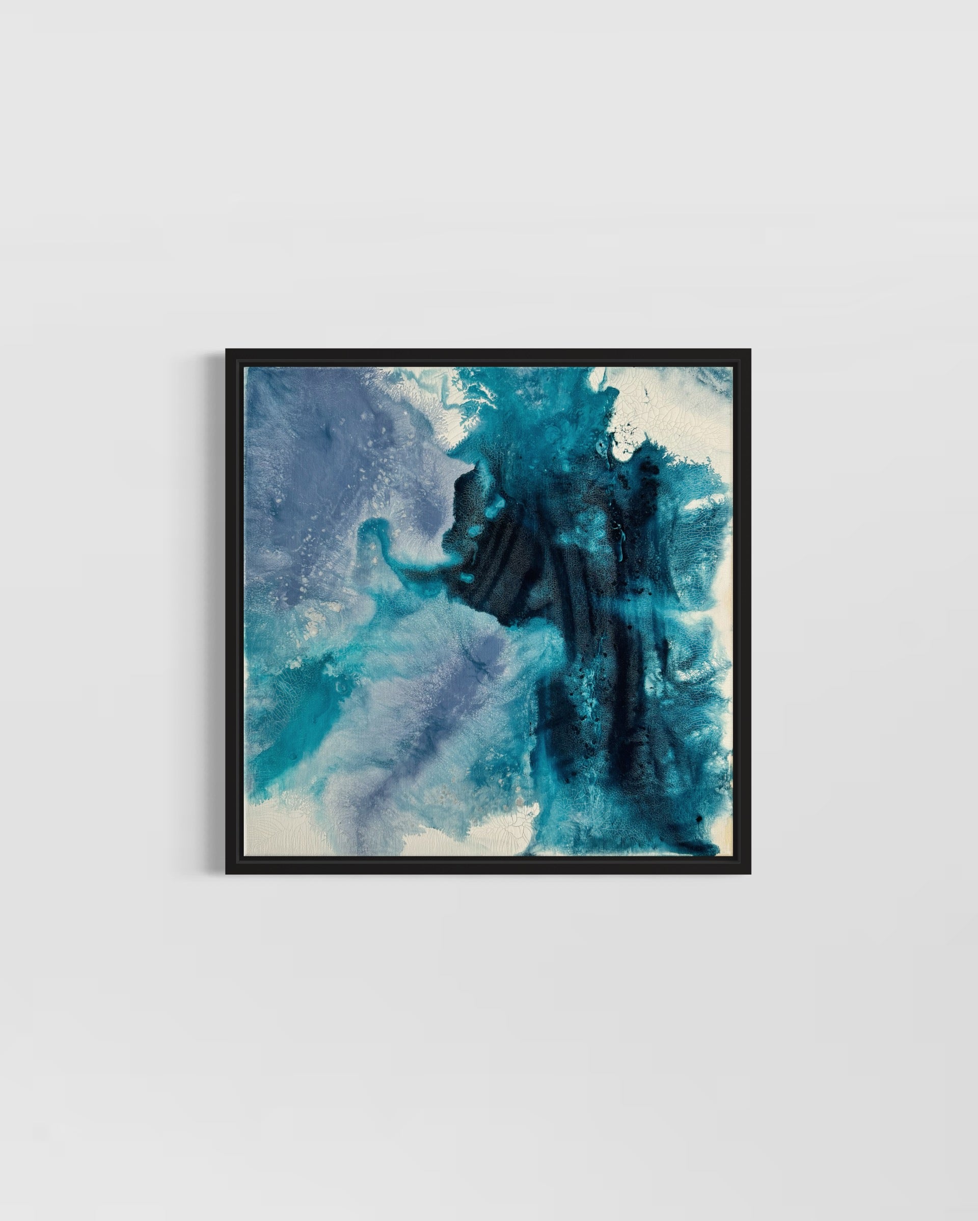 Hidden Fish ist ein Acrylgemälde auf Leinwand in der Größe 40x40 cm. Die Mischung aus Blau- und Türkistönen macht das Bild zu einem vielseitigen Wandbild, das in verschiedenen Räumen wie dem Wohnzimmer, Büro oder Flur gut zur Geltung kommt.