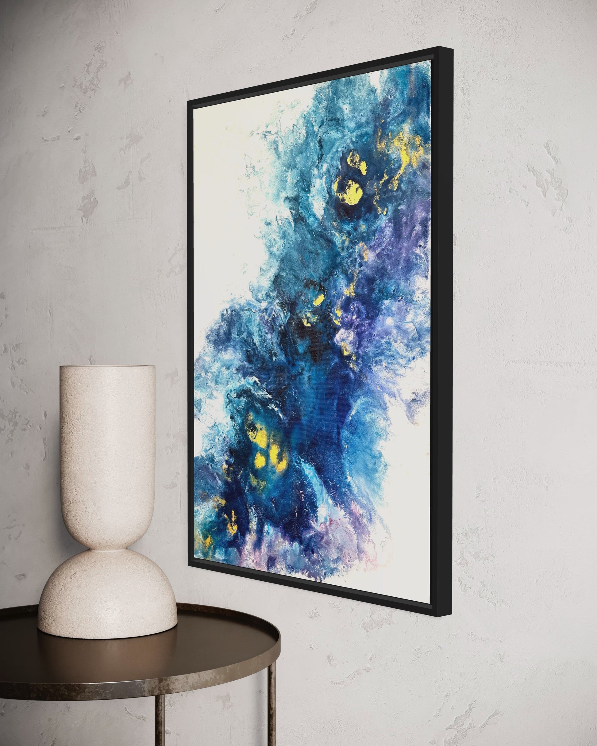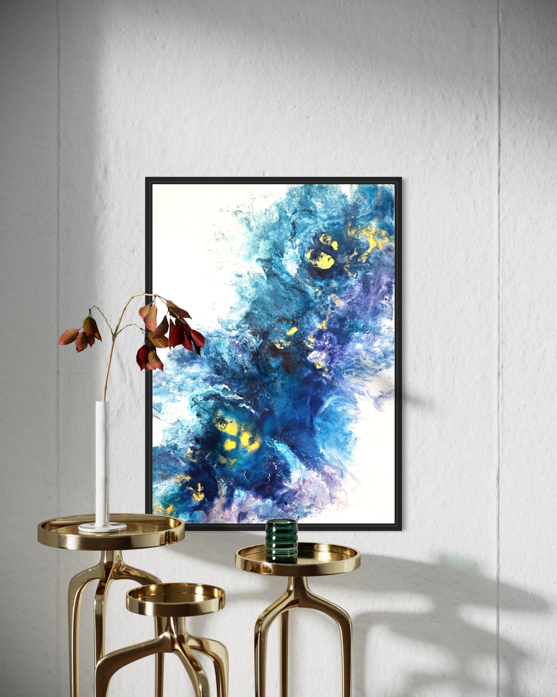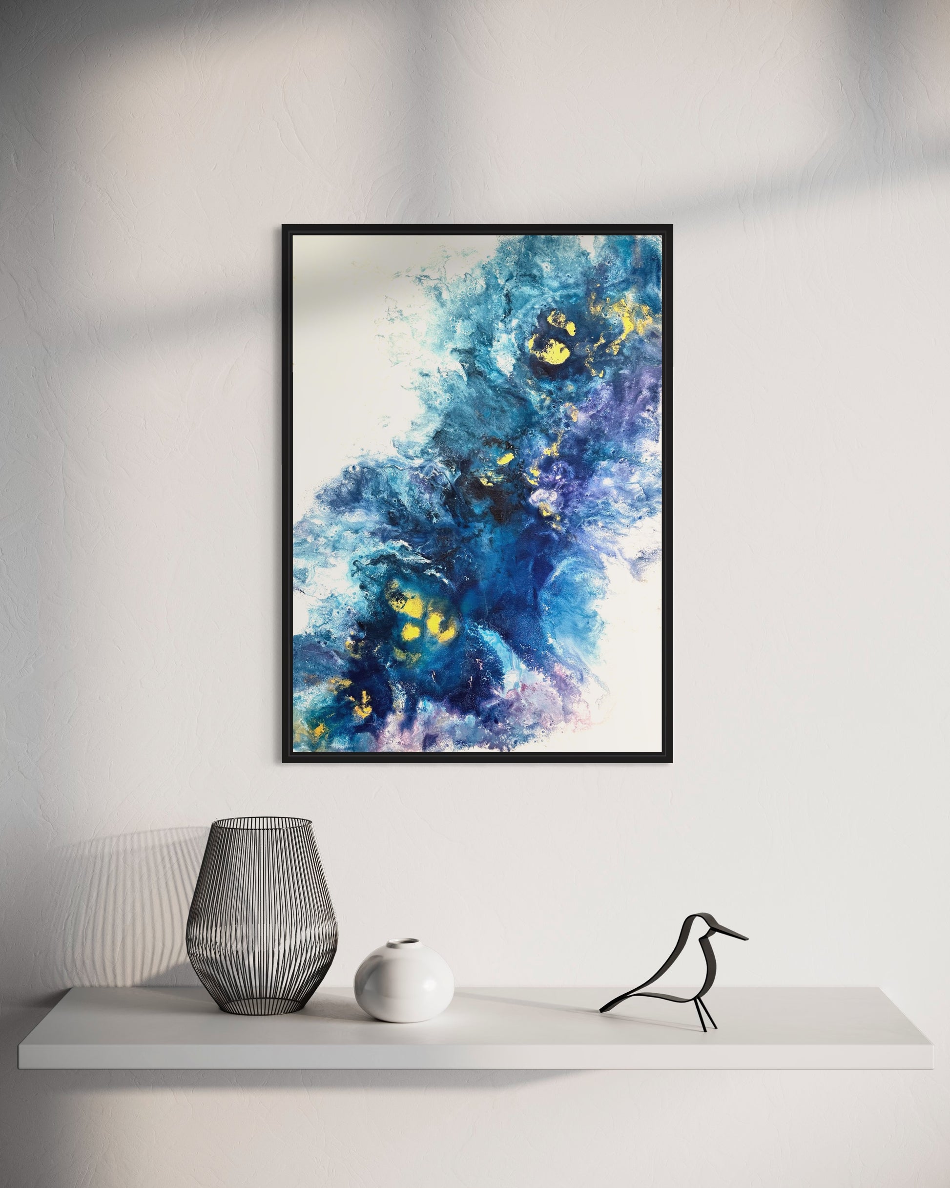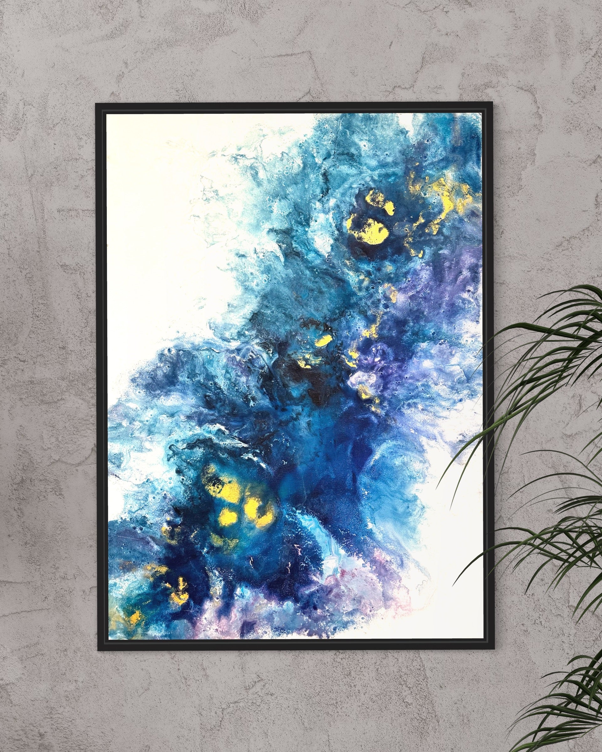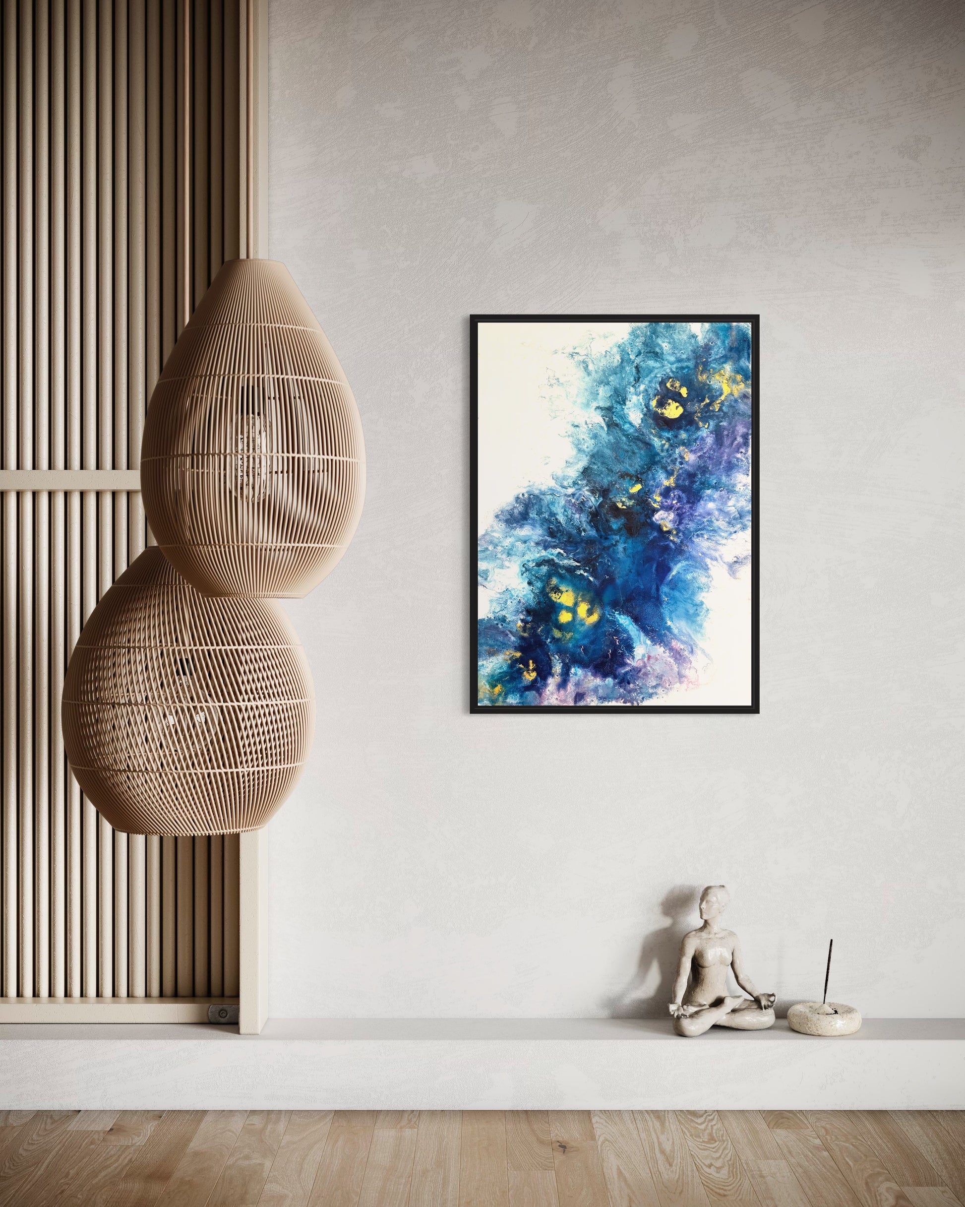 Tauche ein in die ätherische Atmosphäre, die dieses Gemälde schafft, und lass dich von seinem beruhigenden Fluss inspirieren. Die sanften Bewegungen des Blaus und das schimmernde Gold erwecken ein Gefühl von Ruhe und Harmonie, das deinen Raum bereichert.