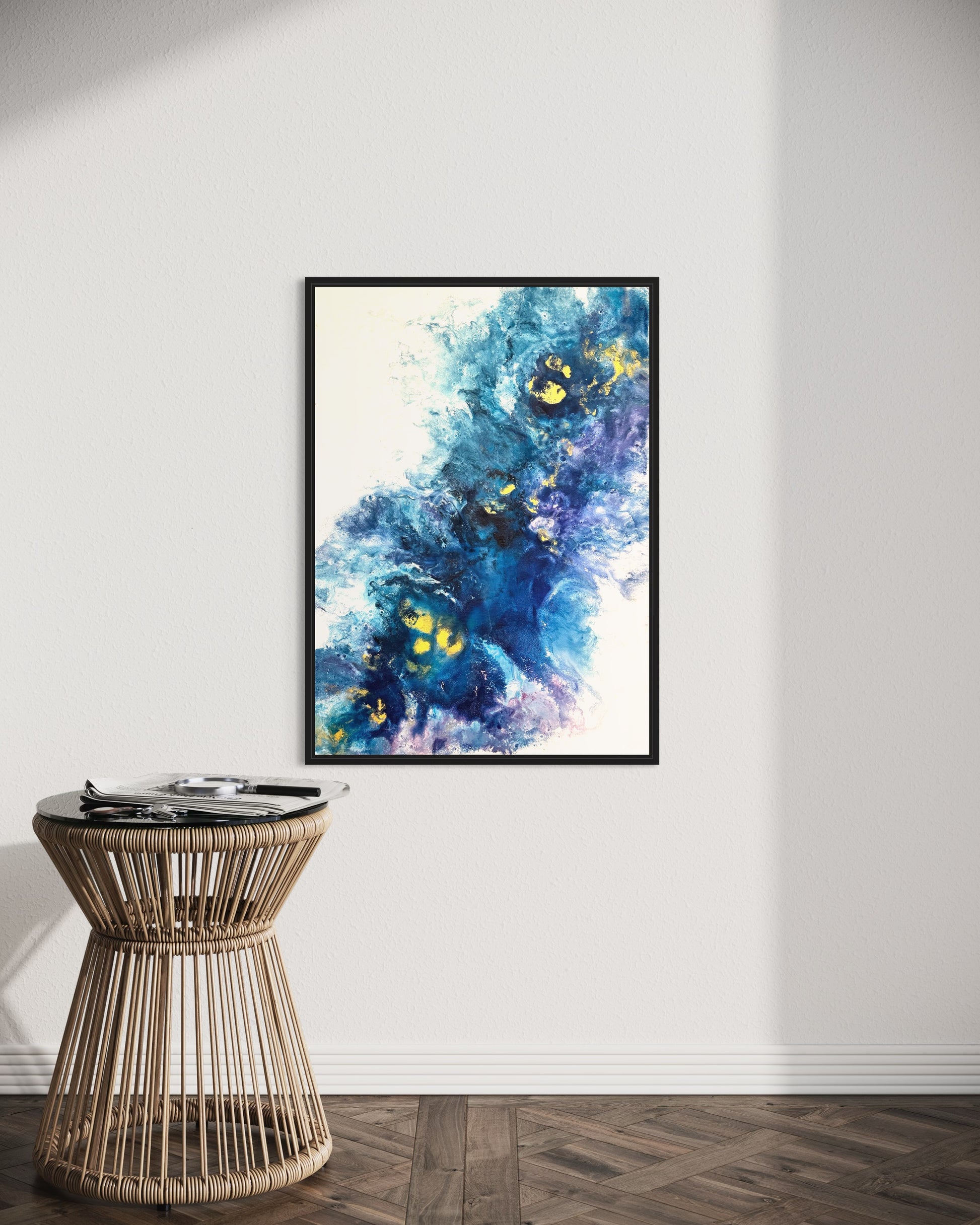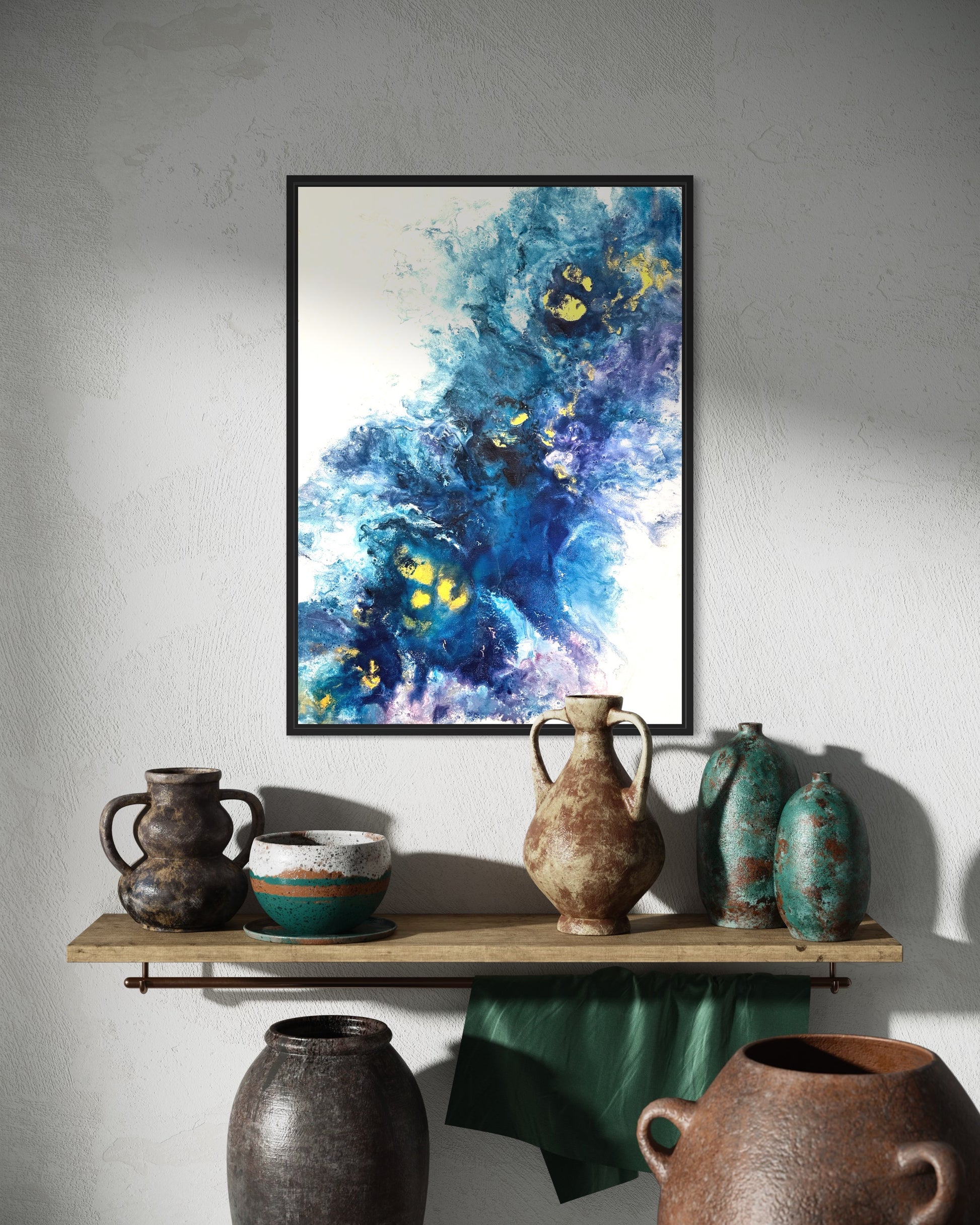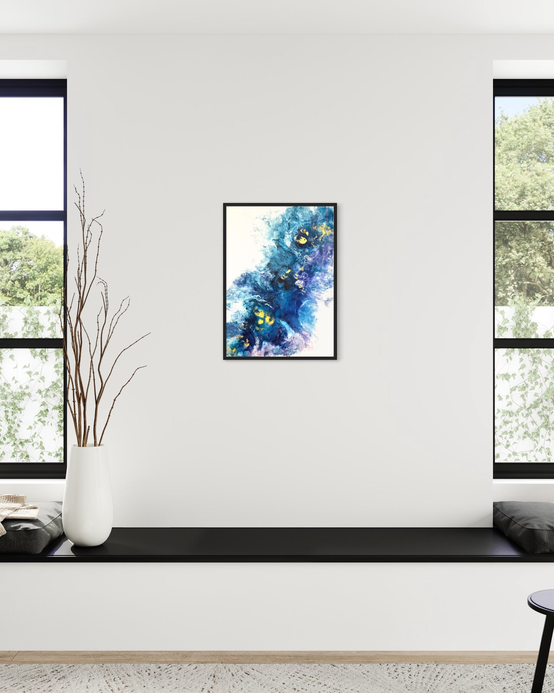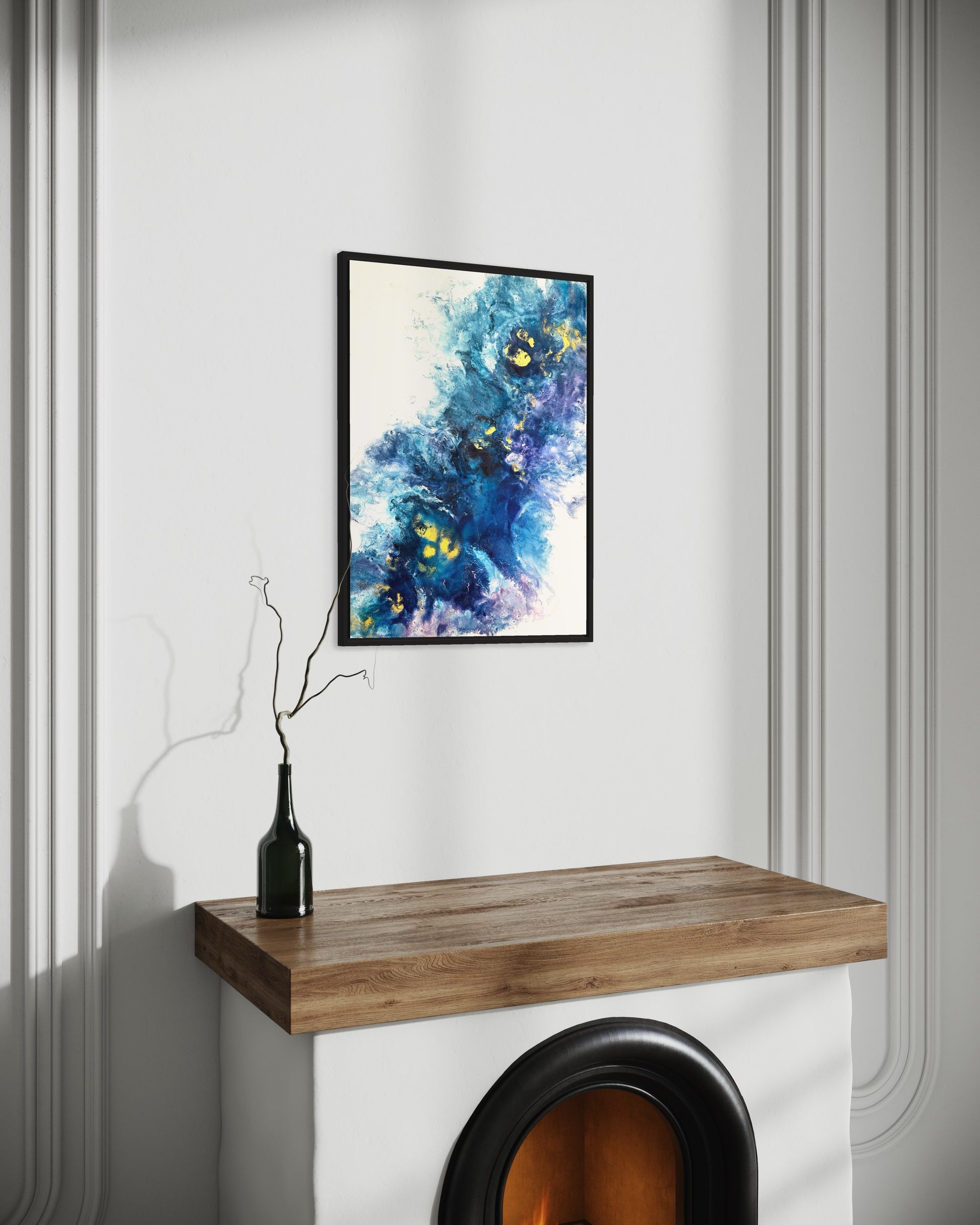 Tauche ein in die ätherische Atmosphäre, die dieses Gemälde schafft, und lass dich von seinem beruhigenden Fluss inspirieren. Die sanften Bewegungen des Blaus und das schimmernde Gold erwecken ein Gefühl von Ruhe und Harmonie, das deinen Raum bereichert.