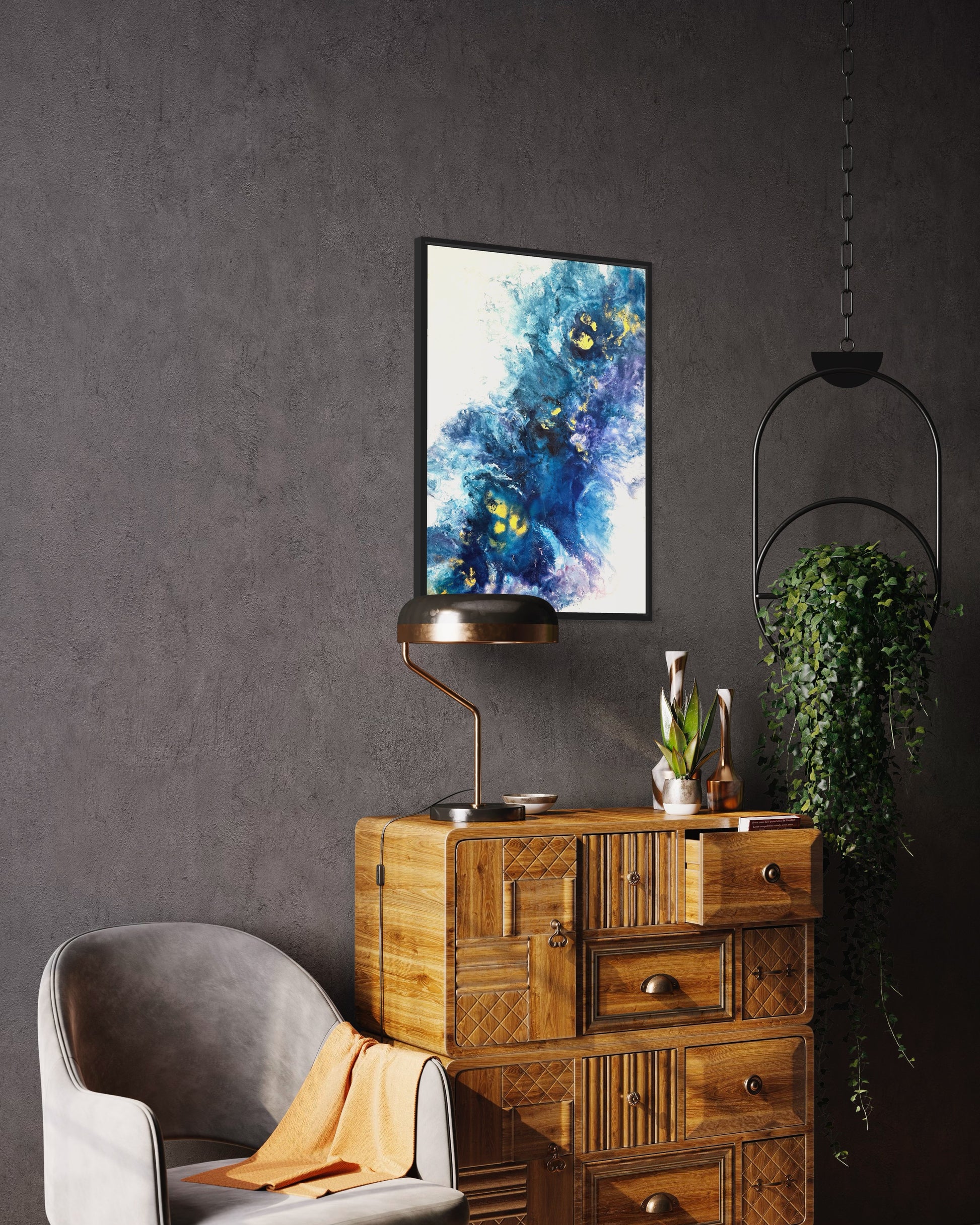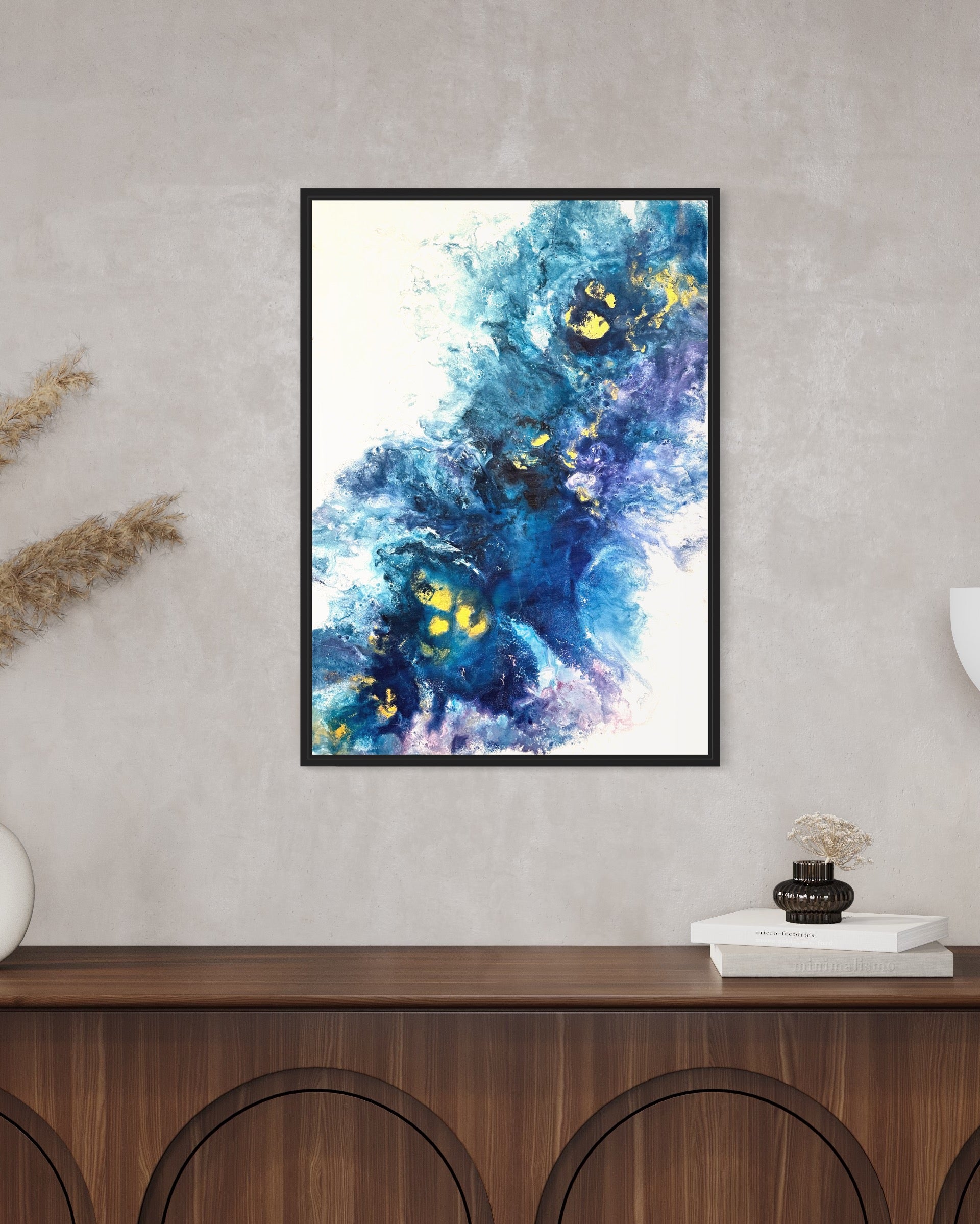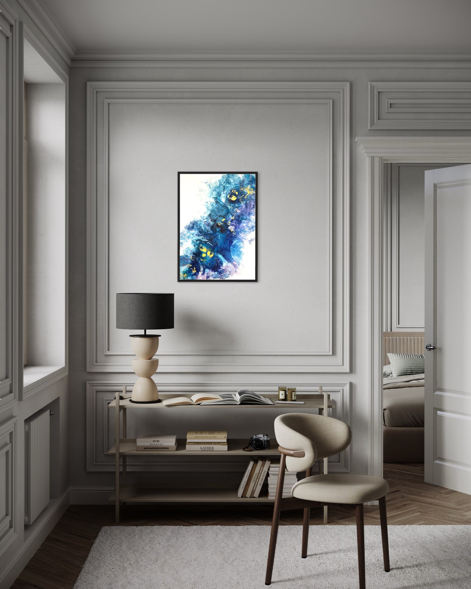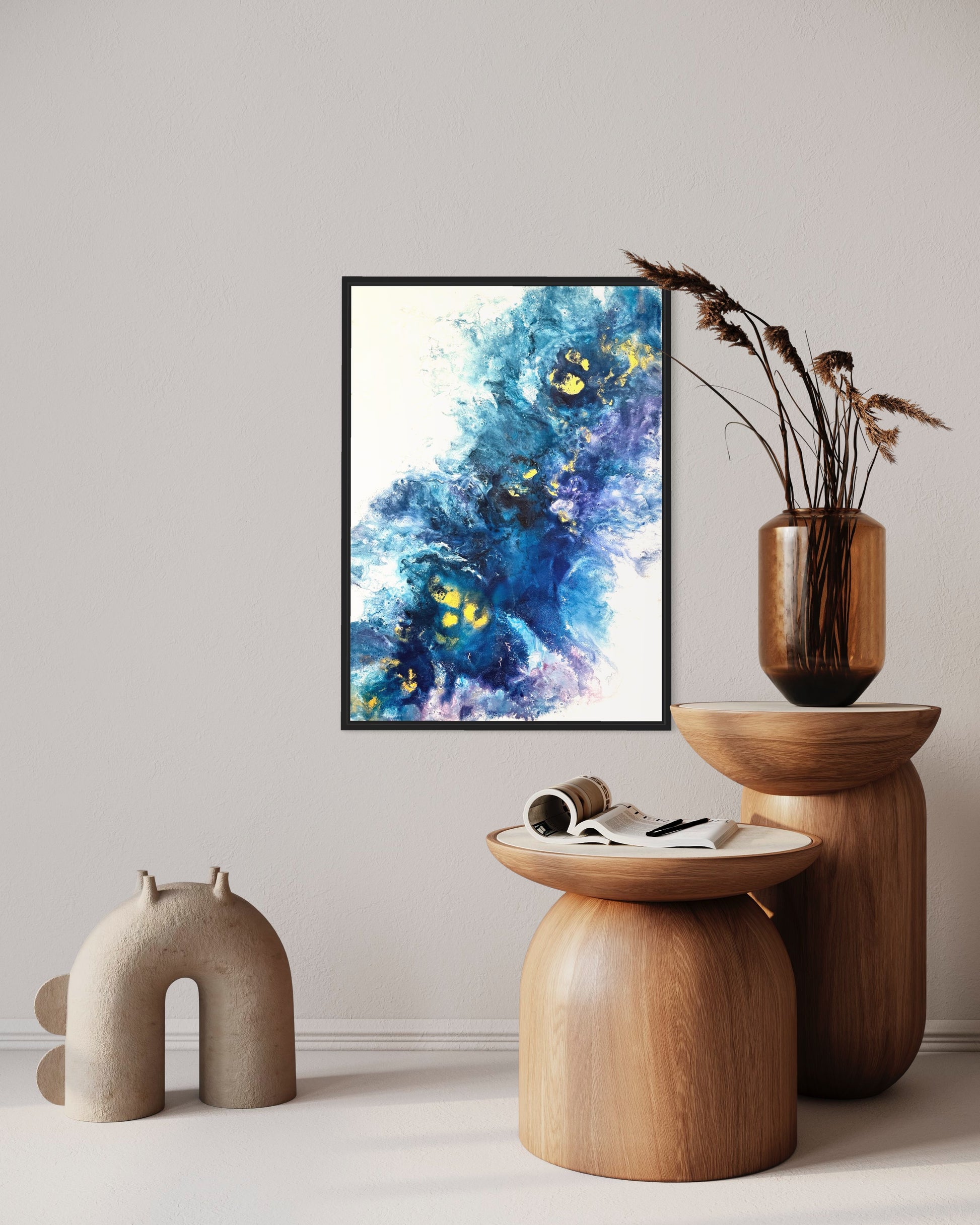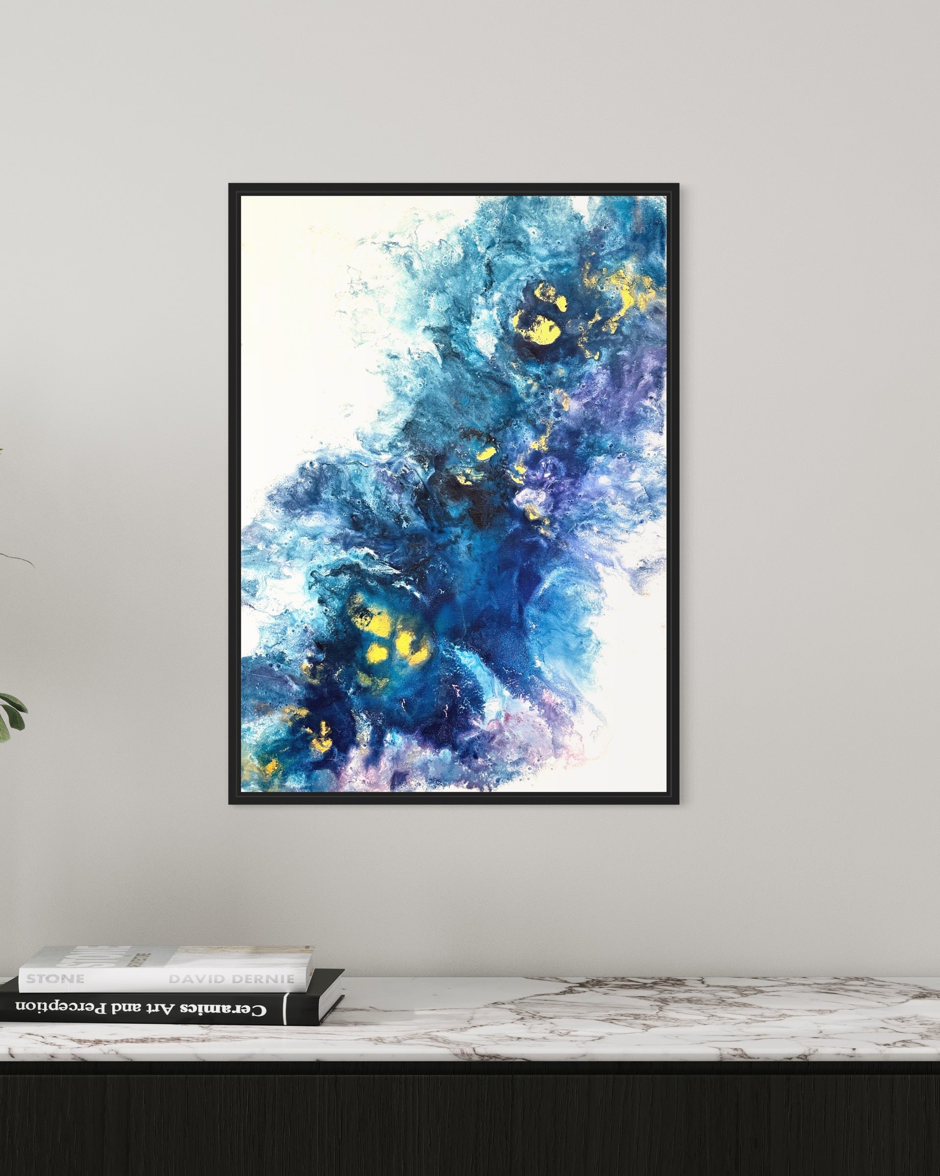 Tauche ein in die ätherische Atmosphäre, die dieses Gemälde schafft, und lass dich von seinem beruhigenden Fluss inspirieren. Die sanften Bewegungen des Blaus und das schimmernde Gold erwecken ein Gefühl von Ruhe und Harmonie, das deinen Raum bereichert.