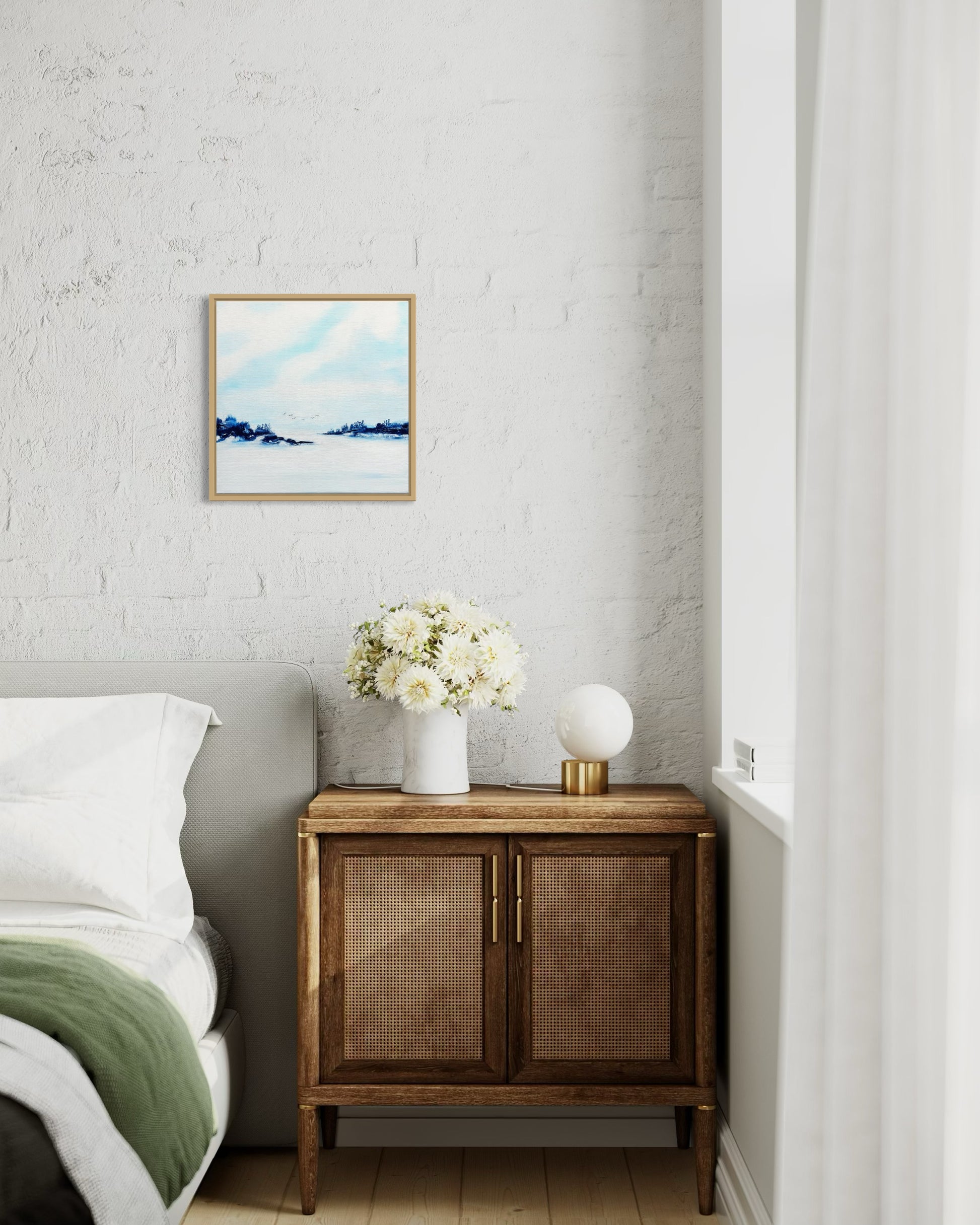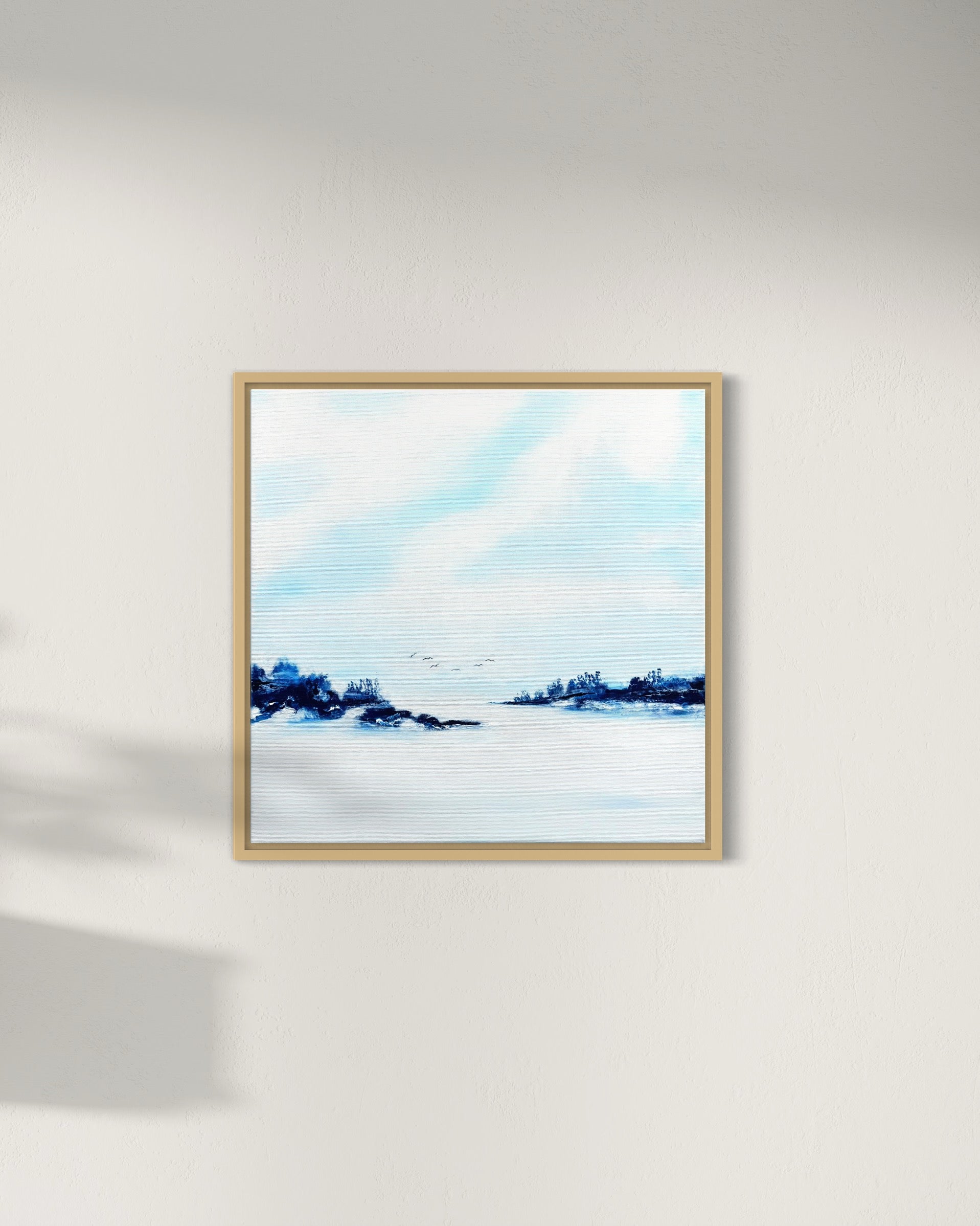 Peaceful Tide zeigt einen stillen Moment am Meer – dort, wo Himmel und Wasser in sanfter Harmonie aufeinandertreffen. Die weichen Blautöne und ruhigen Kontraste vermitteln Klarheit, Frieden und Weite. Die ausgewogene Komposition schafft Raum für Ruhe und einen Moment des Innehaltens.