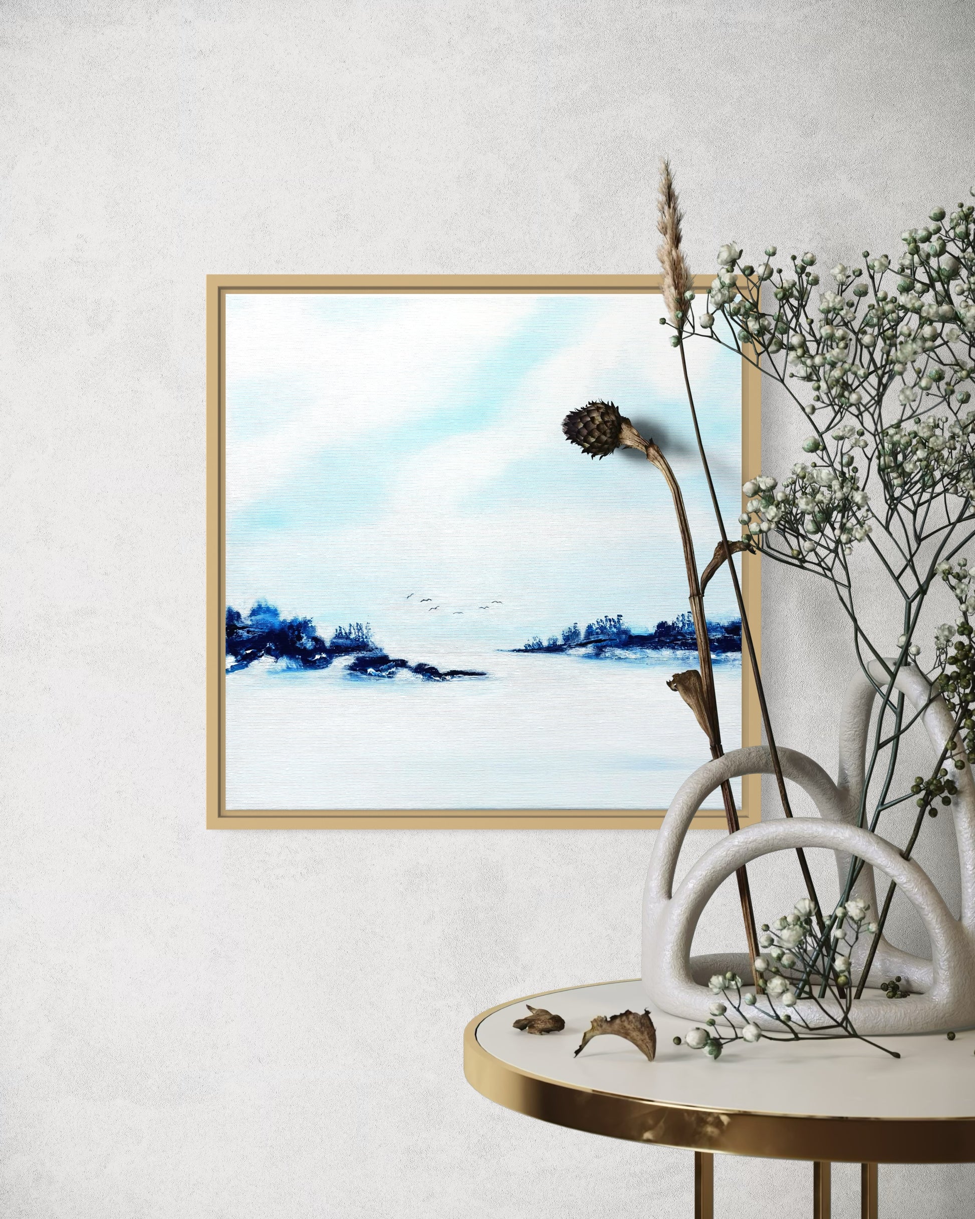 Mit hochwertigen Acrylfarben auf Leinwand gemalt, professionell gerahmt und bereit, direkt aufgehängt zu werden. Ein zeitloses Werk, das deinem Raum Ruhe und Eleganz verleiht.