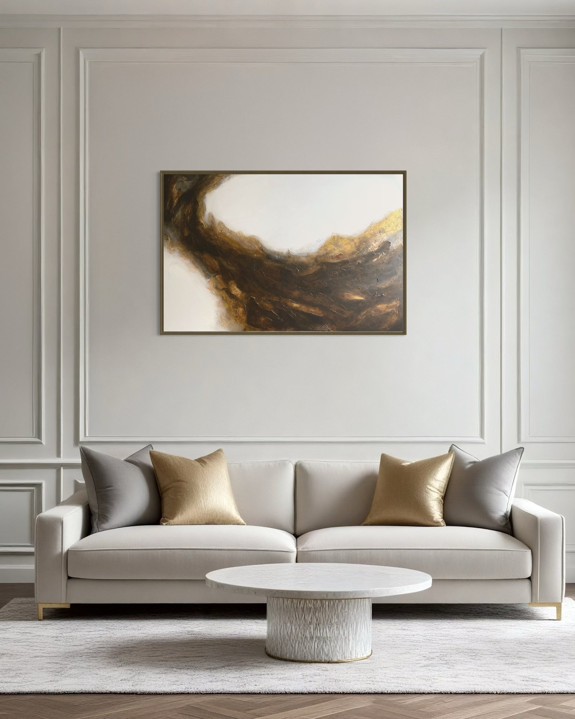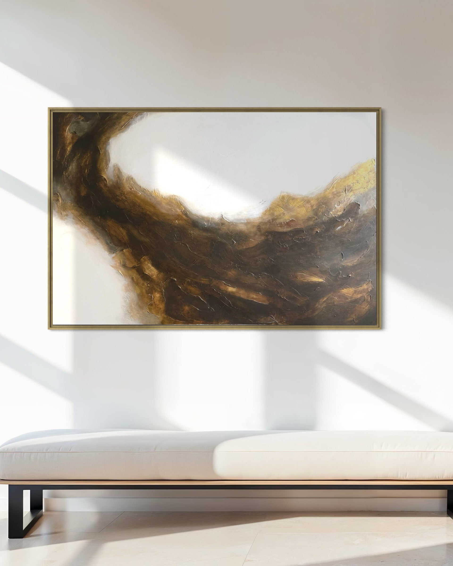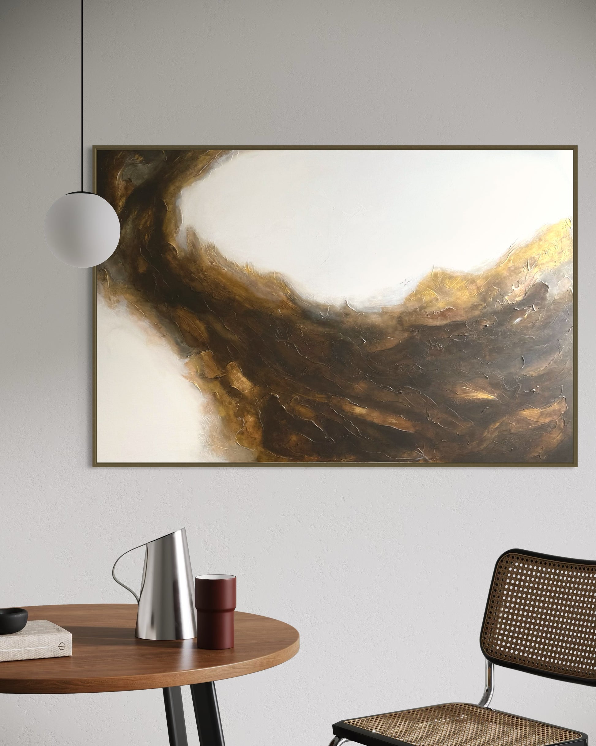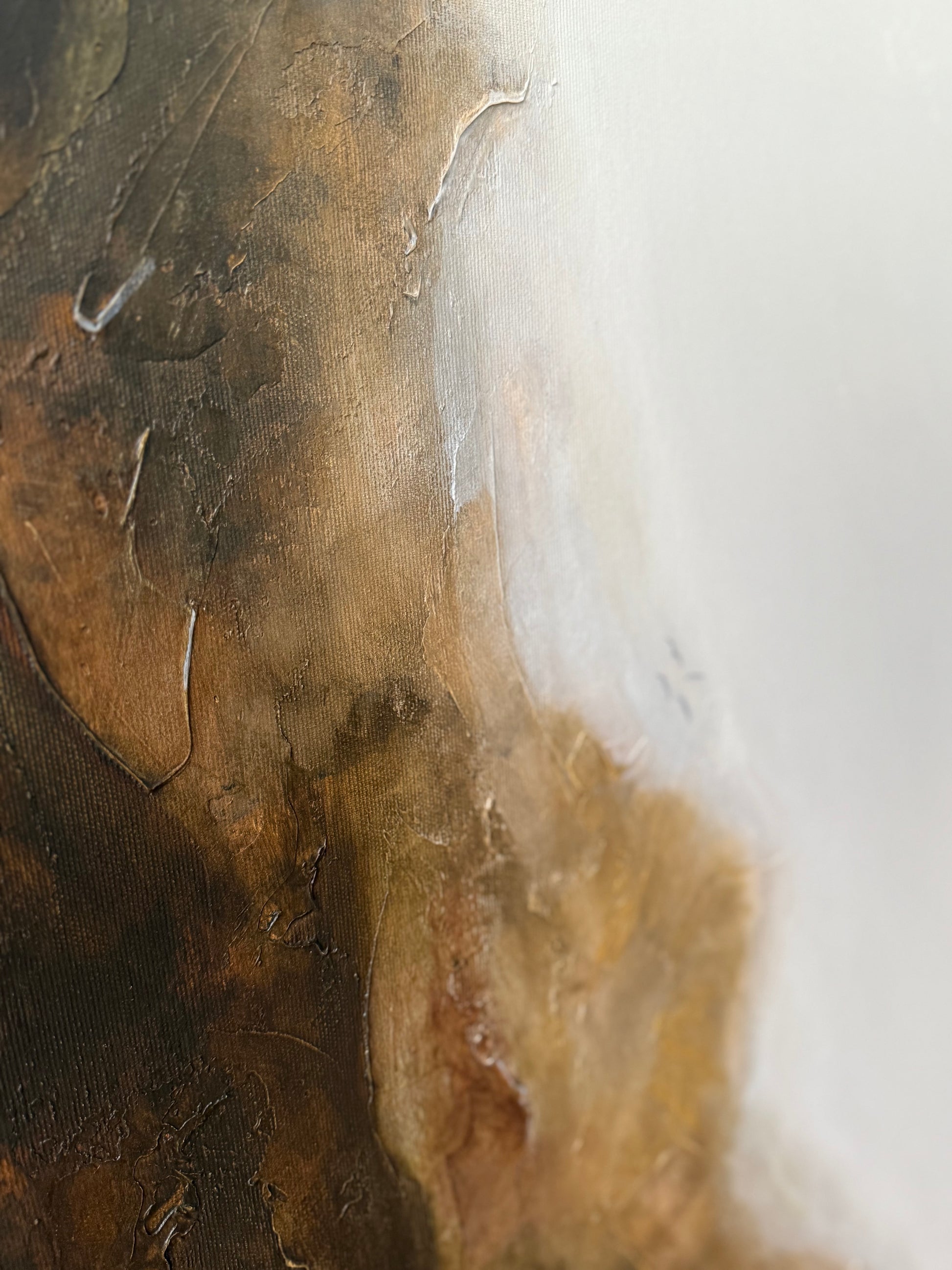 Mit erdigen Tönen, rauer Oberfläche und einem freien, organischen Verlauf bringt dieses Bild Ruhe in den Raum – ohne sich in den Vordergrund zu drängen. Die Struktur ist sichtbar und spürbar. Ein Werk, das geerdet wirkt – und offen bleibt.