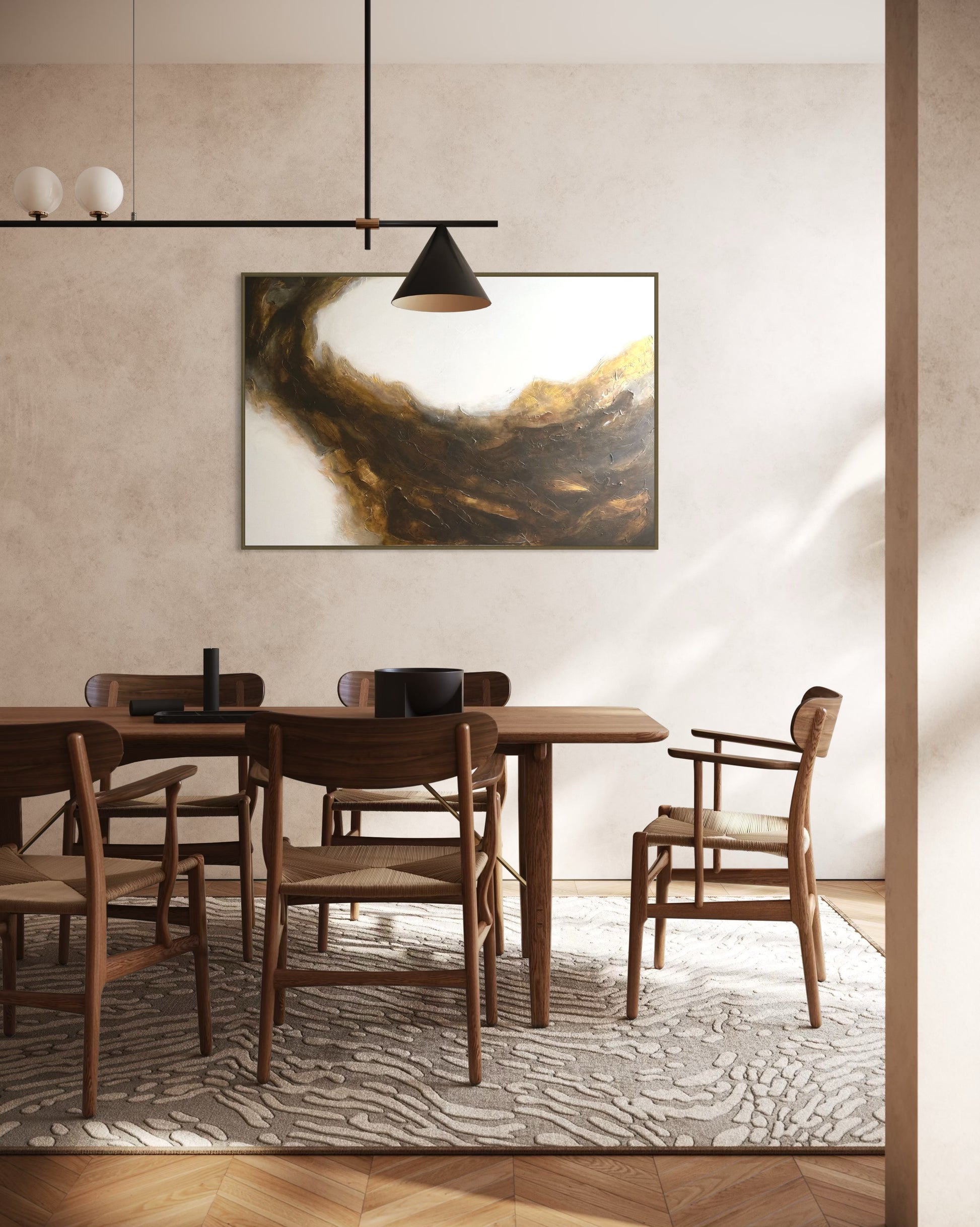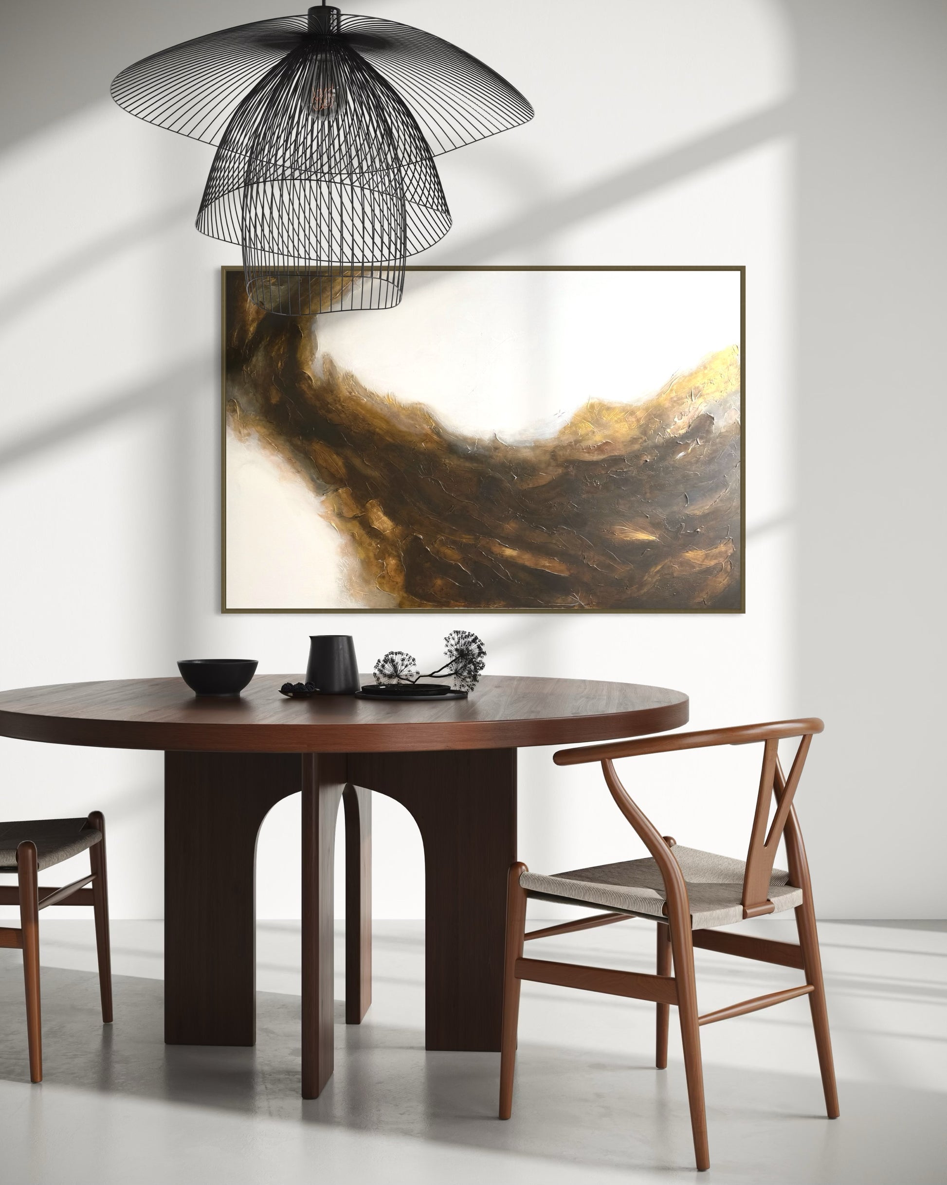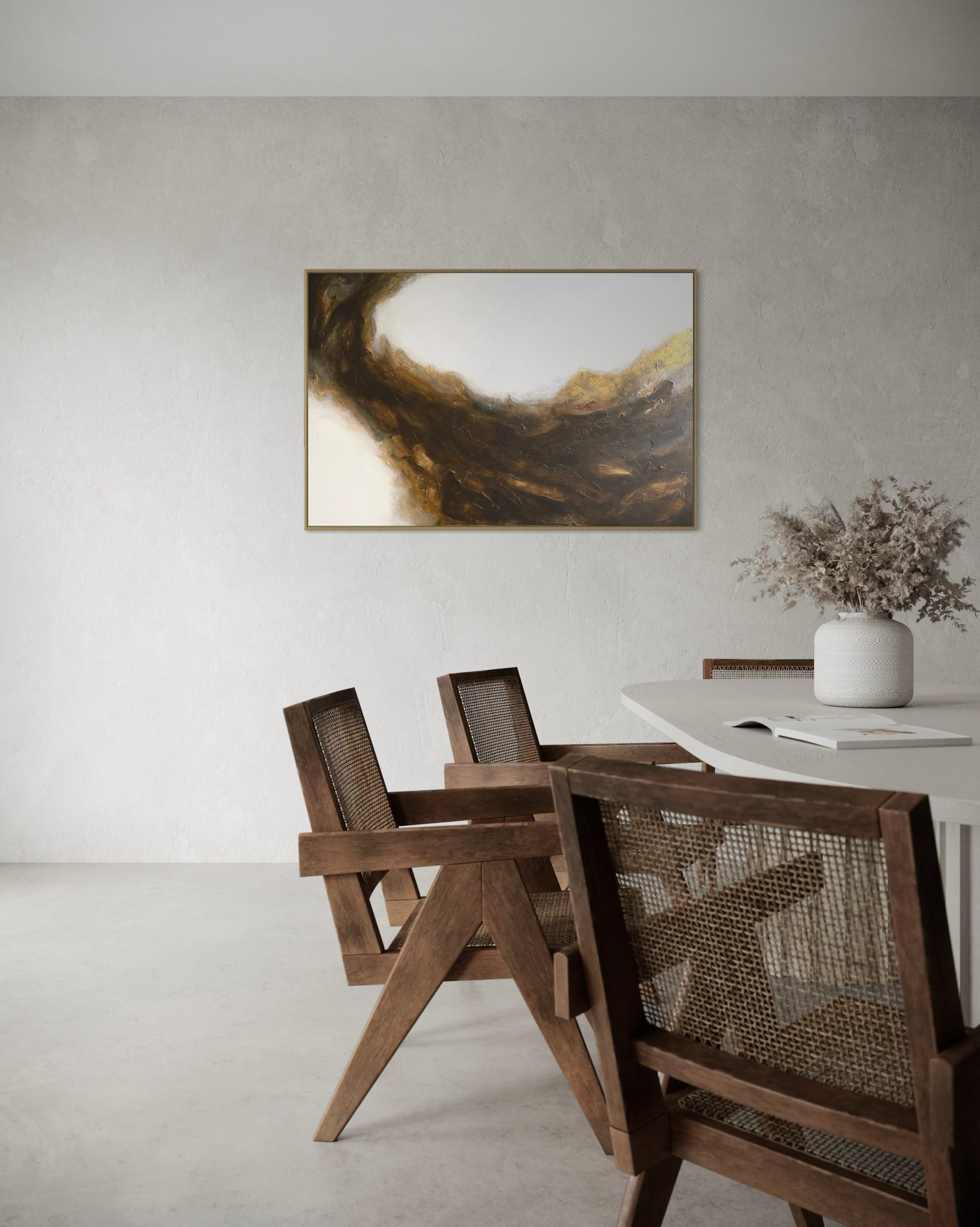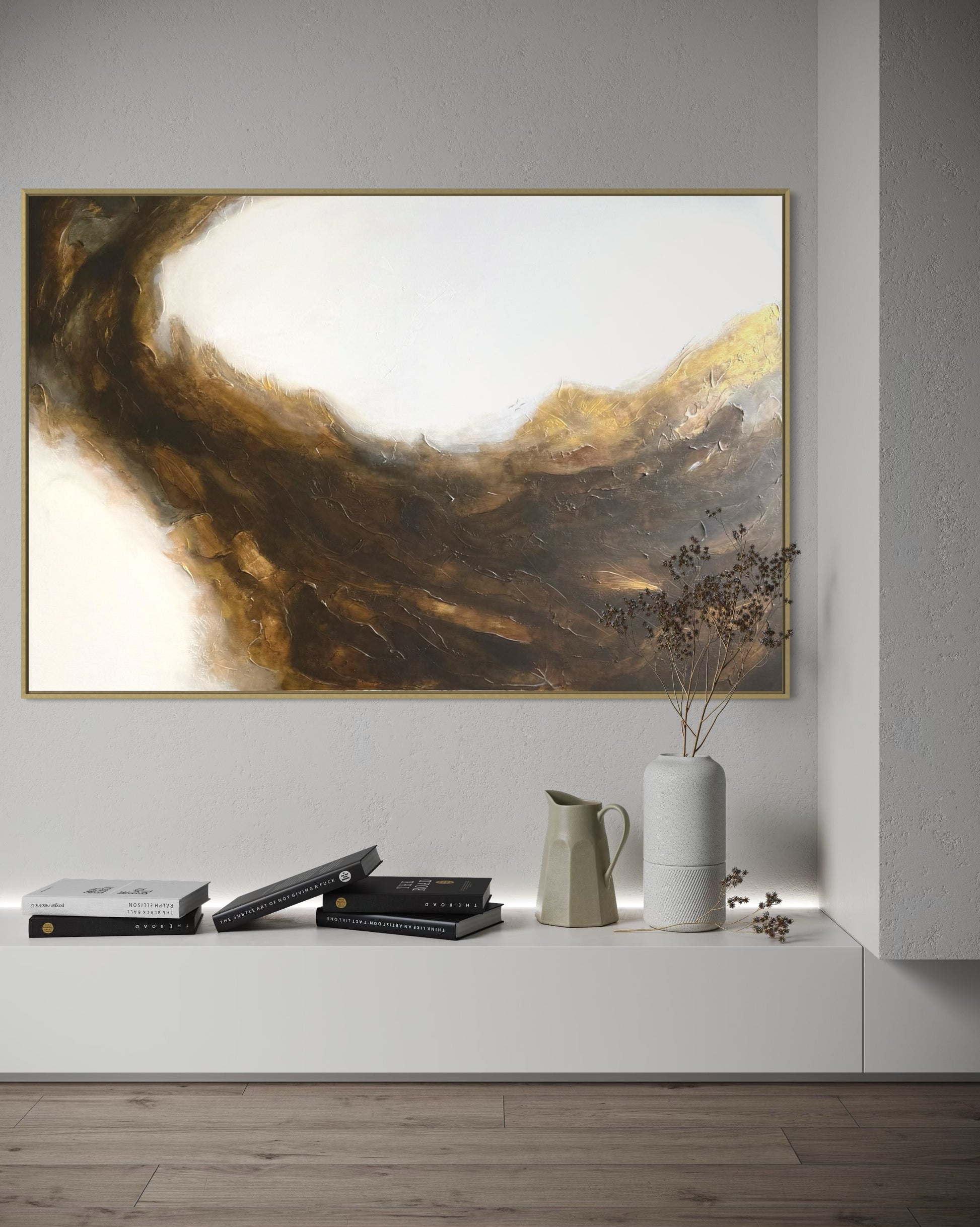 Mit erdigen Tönen, rauer Oberfläche und einem freien, organischen Verlauf bringt dieses Bild Ruhe in den Raum – ohne sich in den Vordergrund zu drängen. Die Struktur ist sichtbar und spürbar. Ein Werk, das geerdet wirkt – und offen bleibt.