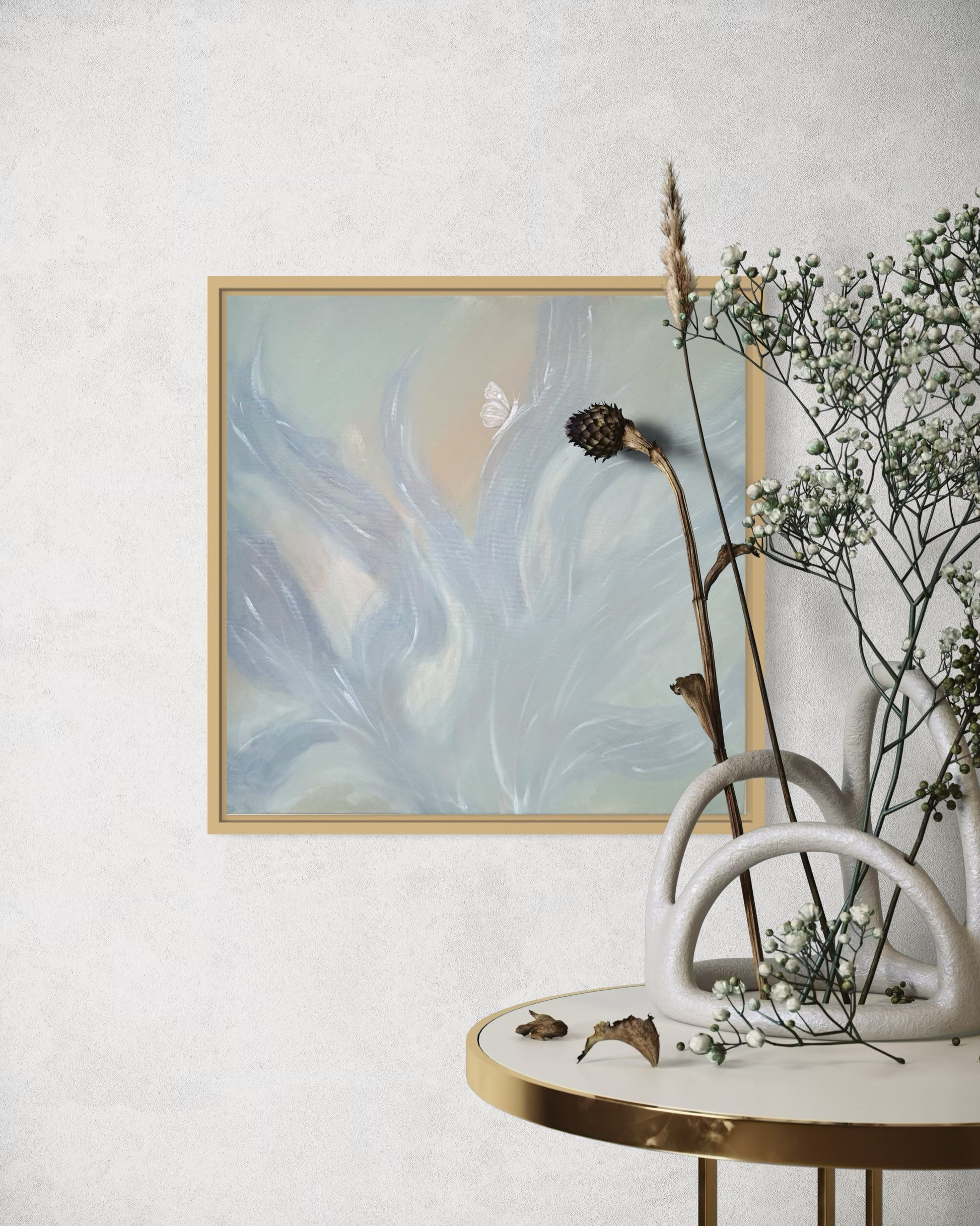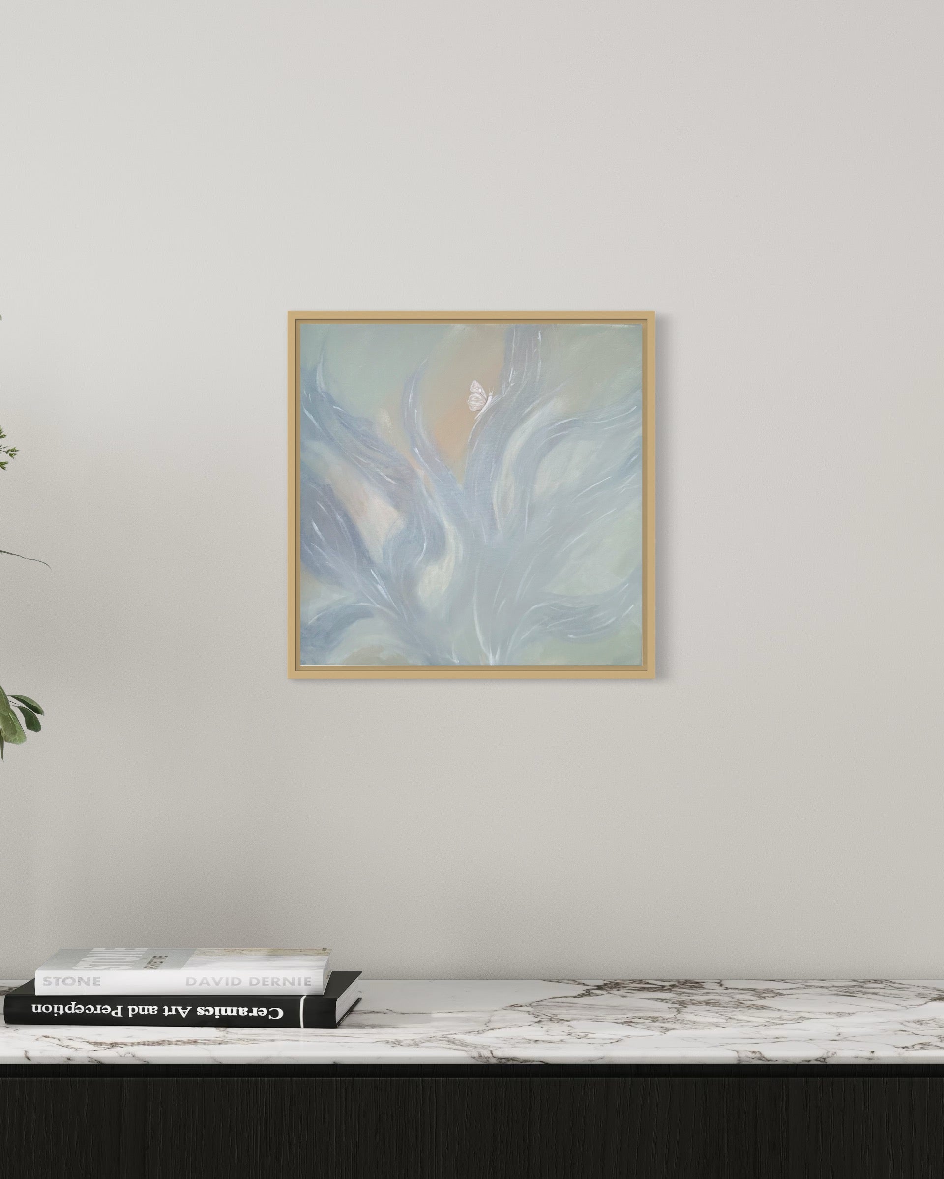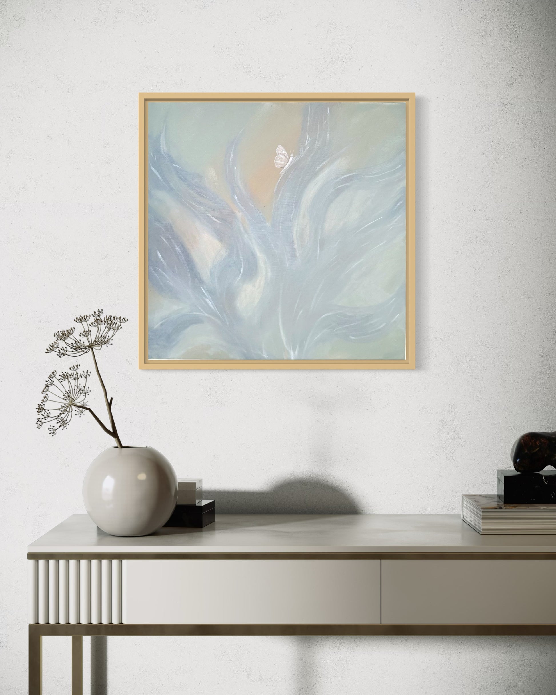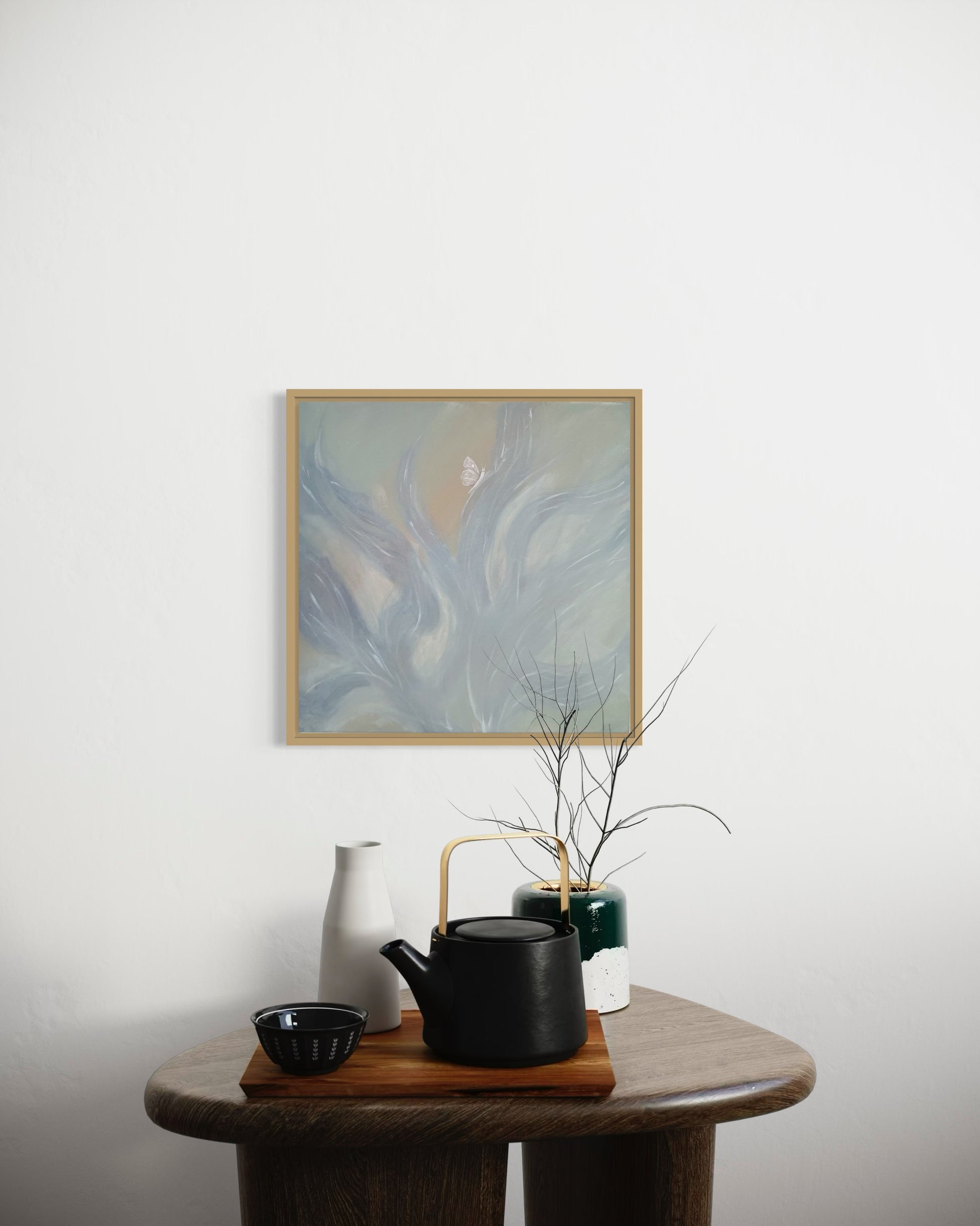Mit seiner Größe von 40x40 cm fügt sich das Bild wunderbar in verschiedene Wohnkonzepte ein. Ob im Wohnzimmer, Schlafzimmer oder einem ruhigen Arbeitsbereich – "Silent Wings" schafft eine harmonische Atmosphäre und lädt dazu ein, für einen Moment innezuhalten.
