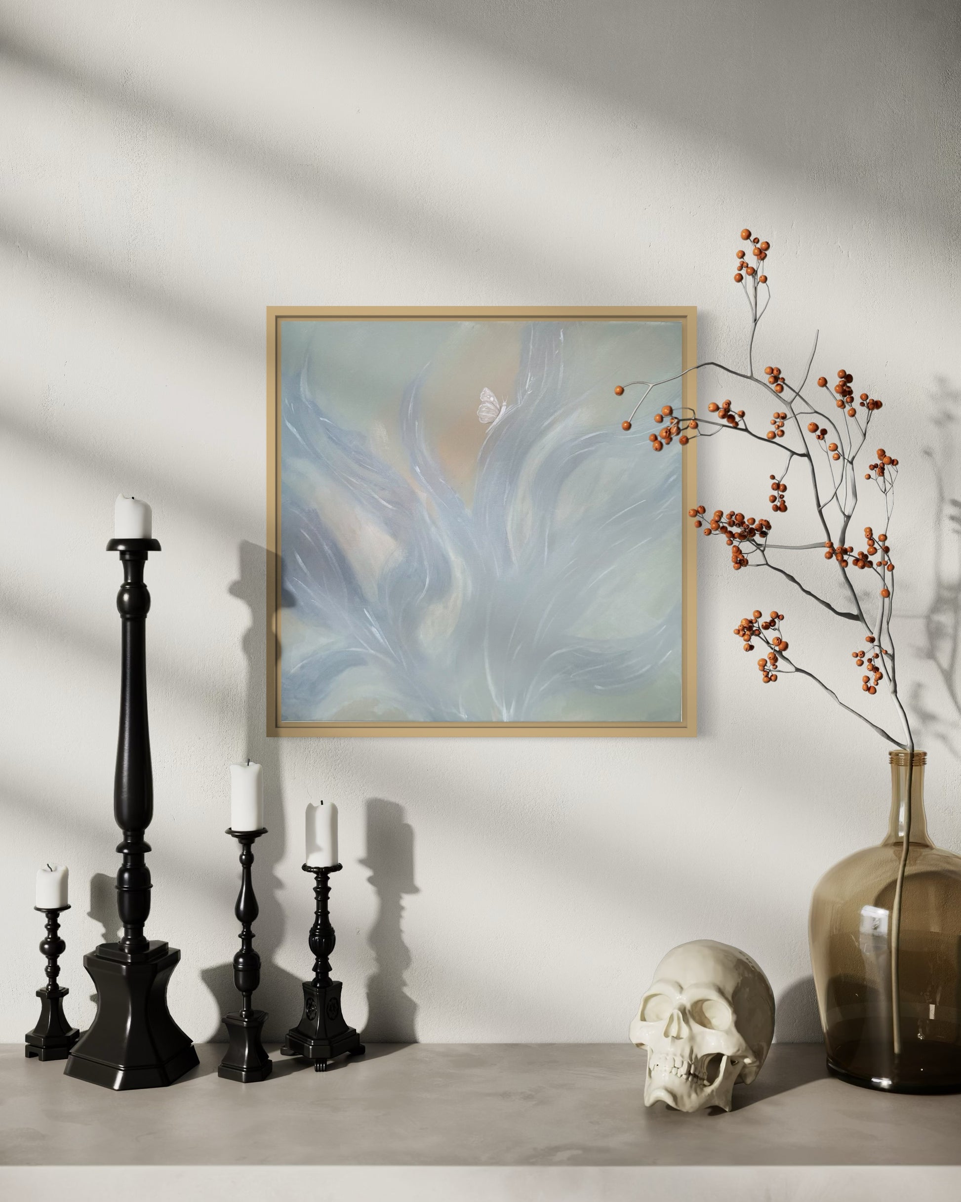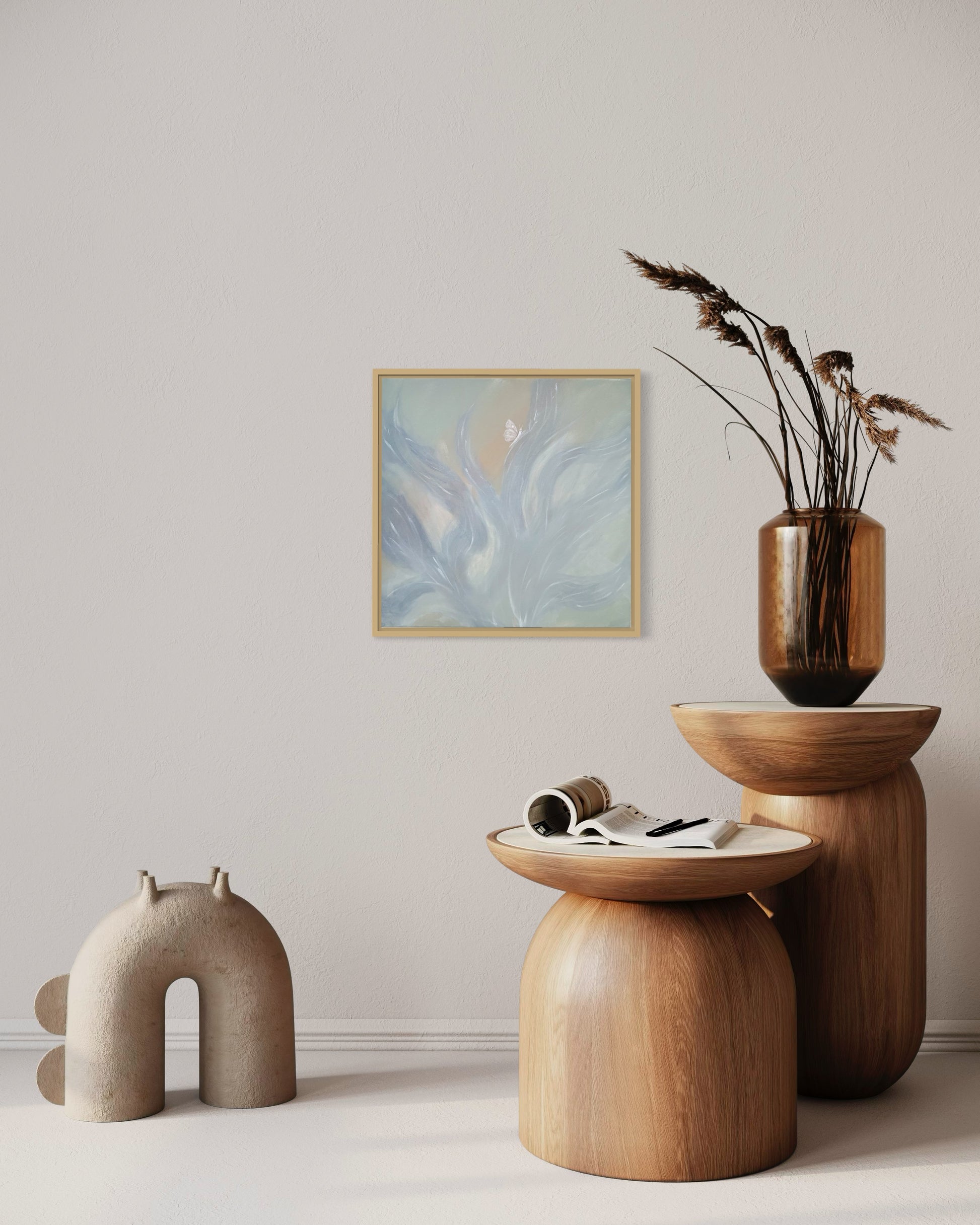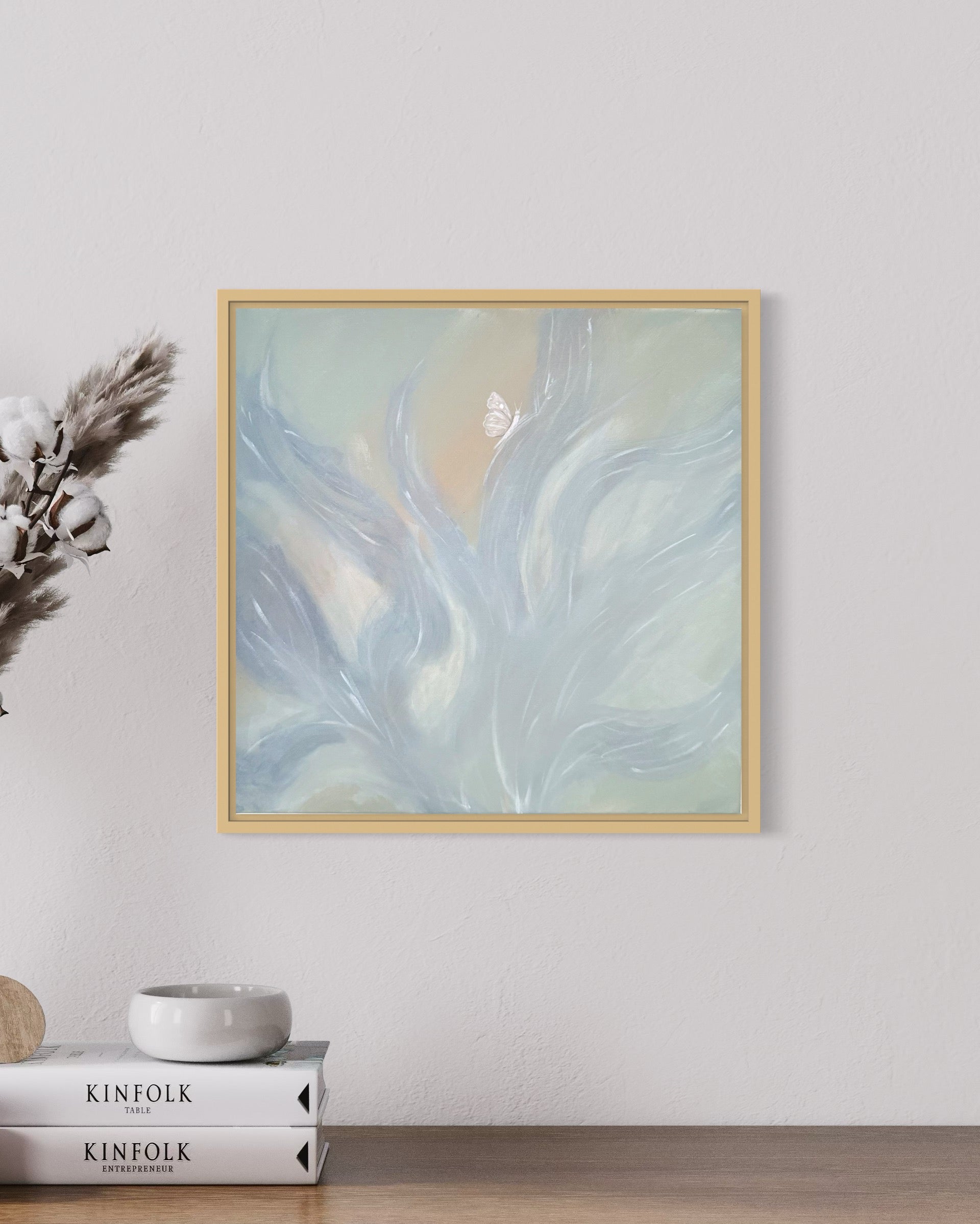 Mit seiner Größe von 40x40 cm fügt sich das Bild wunderbar in verschiedene Wohnkonzepte ein. Ob im Wohnzimmer, Schlafzimmer oder einem ruhigen Arbeitsbereich – "Silent Wings" schafft eine harmonische Atmosphäre und lädt dazu ein, für einen Moment innezuhalten.