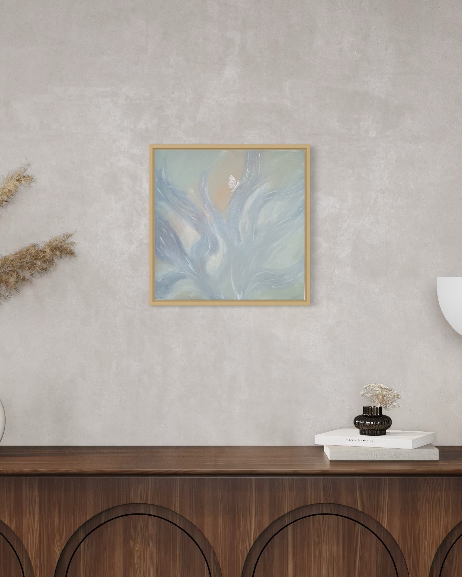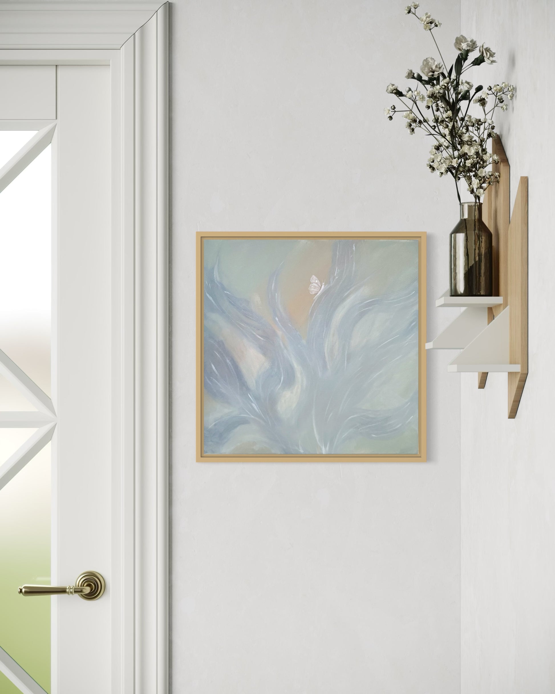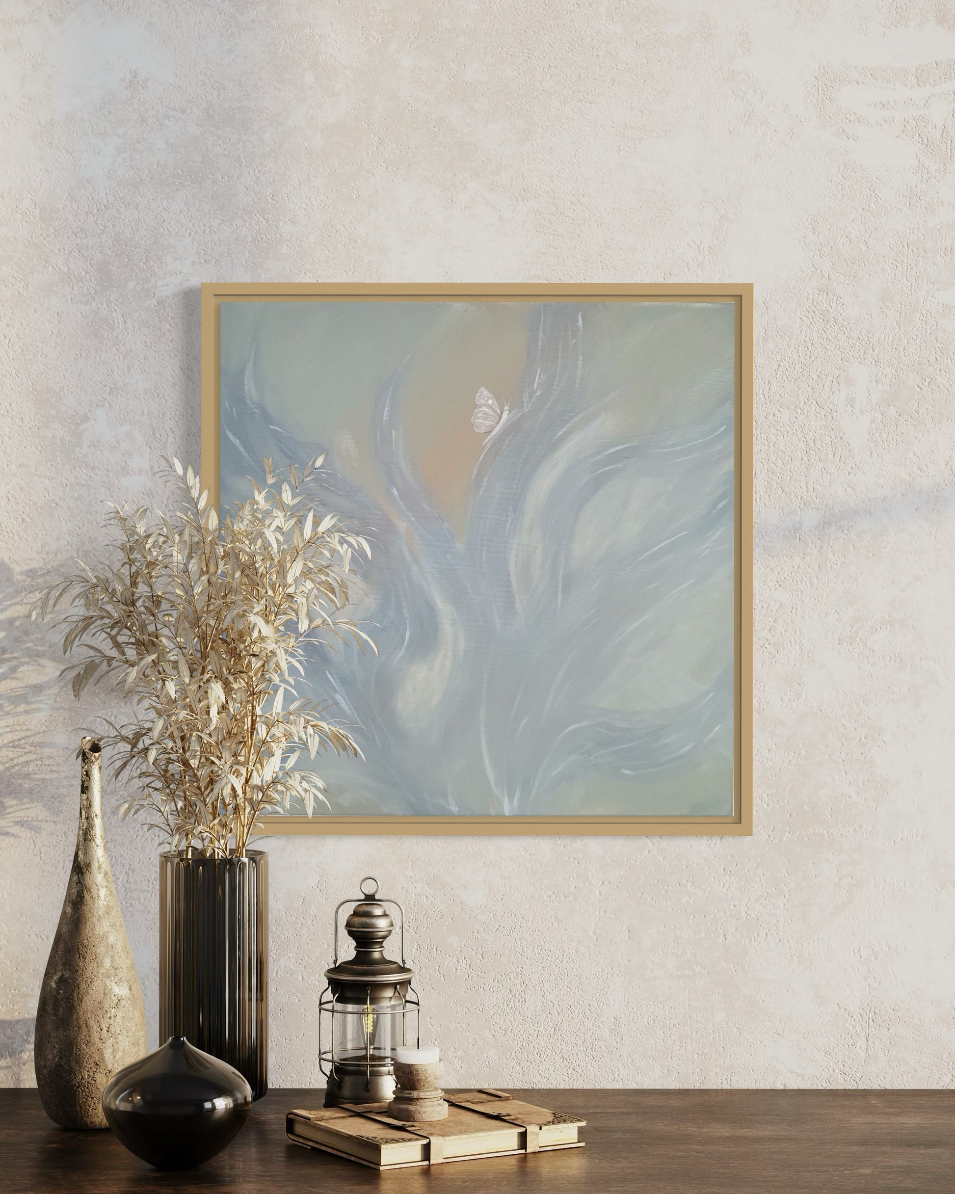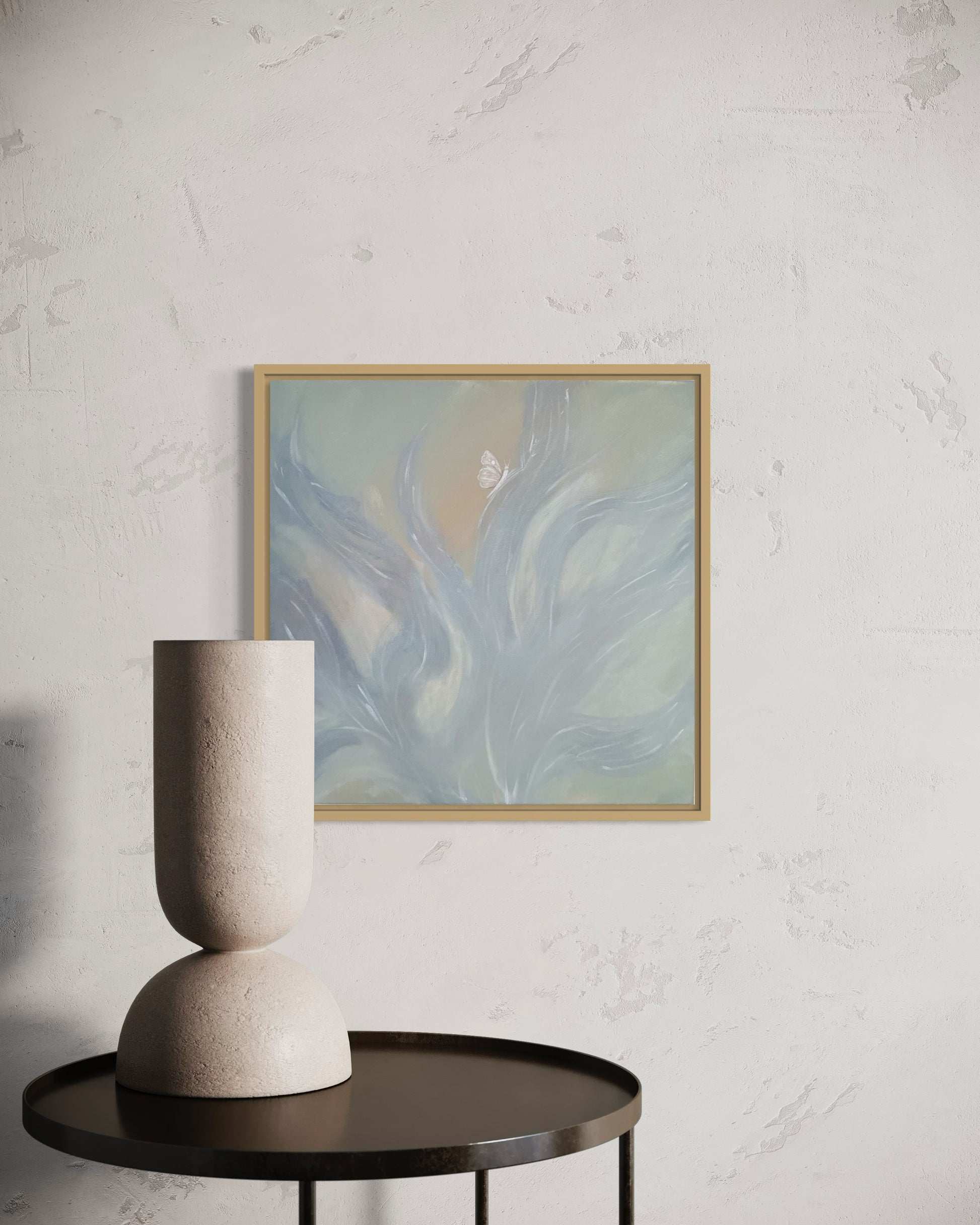 Mit seiner Größe von 40x40 cm fügt sich das Bild wunderbar in verschiedene Wohnkonzepte ein. Ob im Wohnzimmer, Schlafzimmer oder einem ruhigen Arbeitsbereich – "Silent Wings" schafft eine harmonische Atmosphäre und lädt dazu ein, für einen Moment innezuhalten.