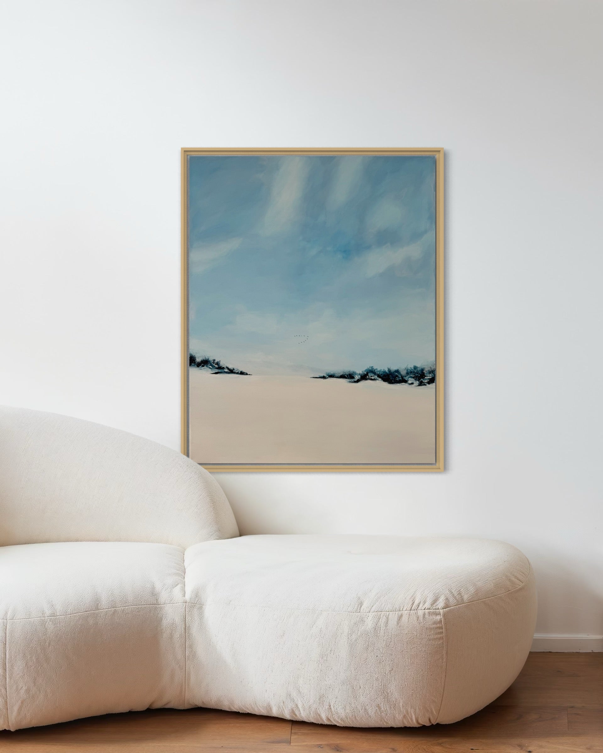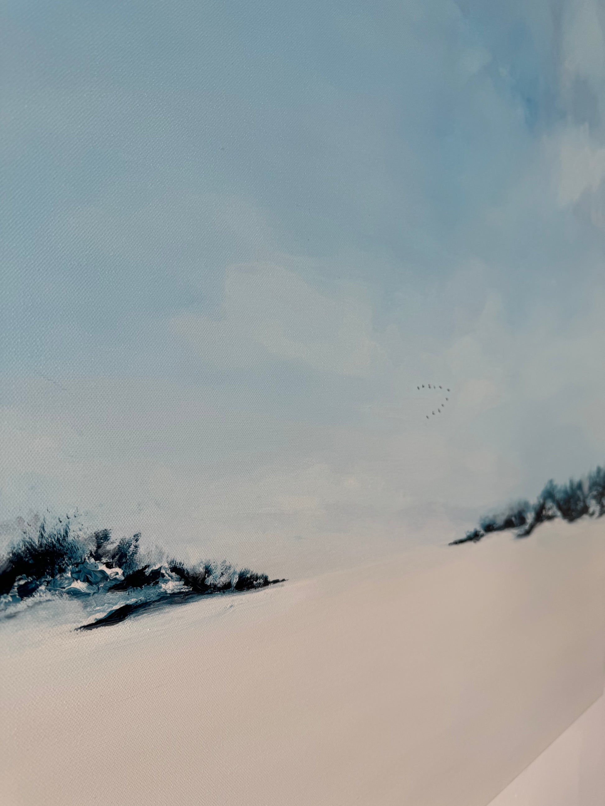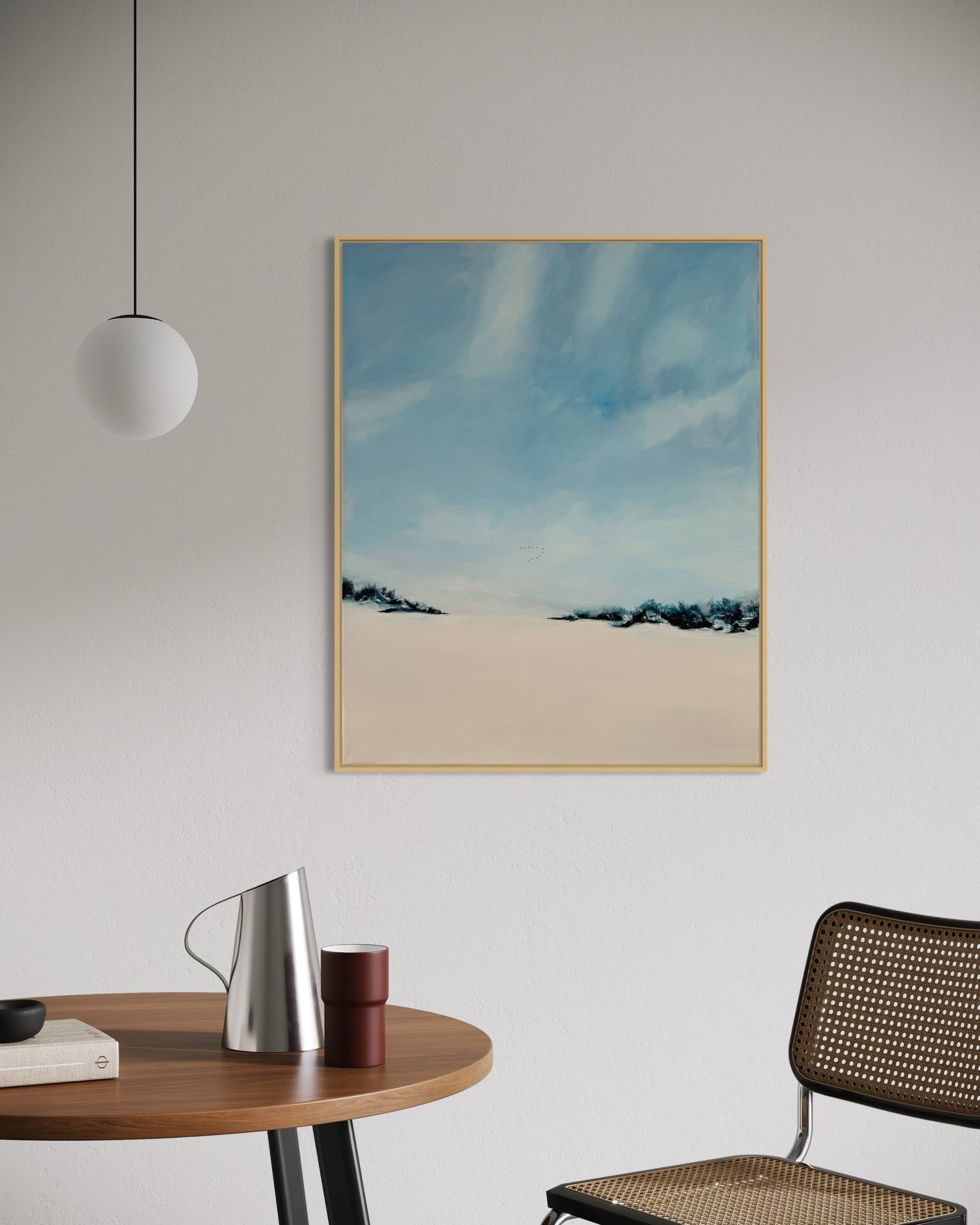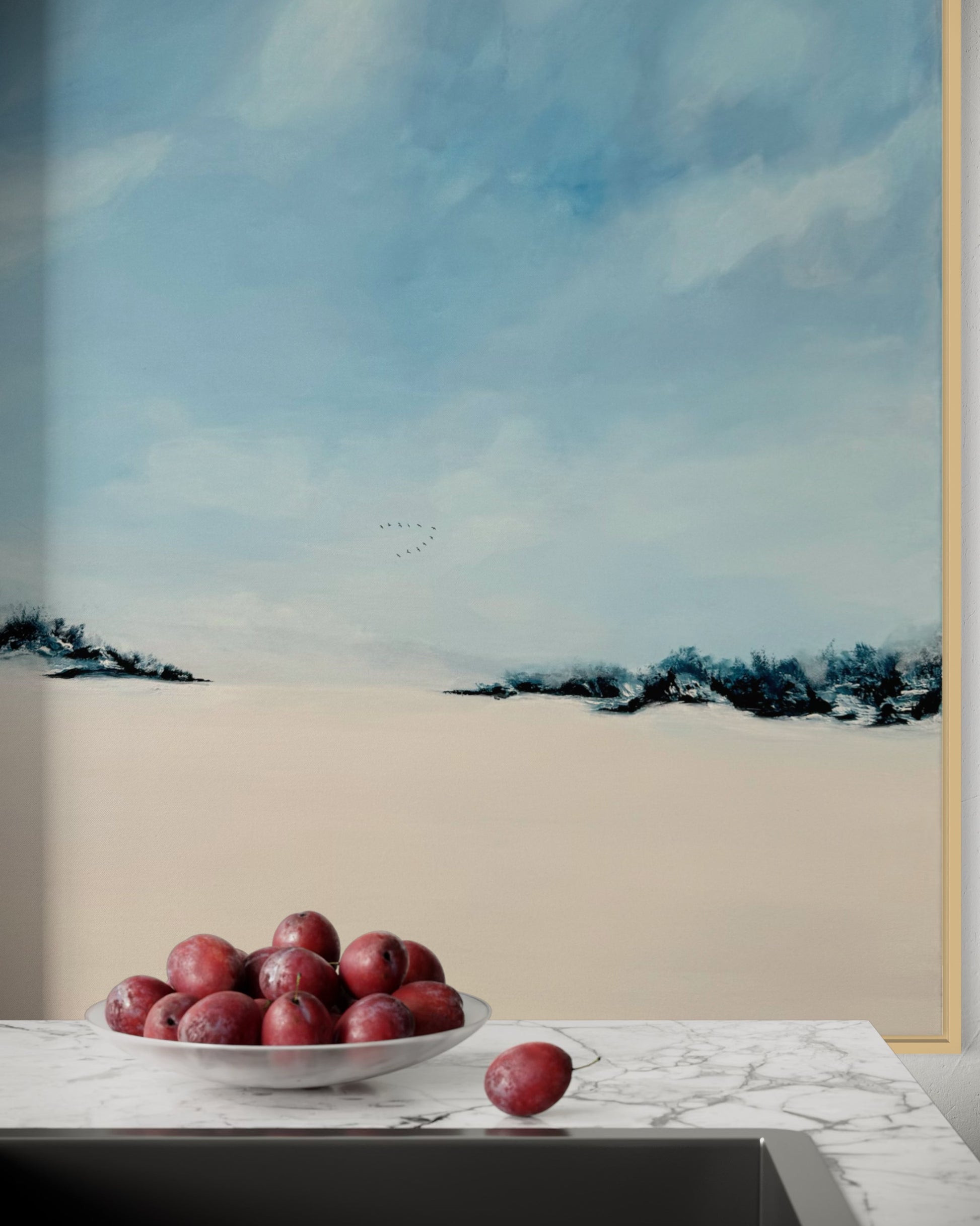 Ich liebe die Einfachheit dieses Bildes – seine Zurückhaltung, seine Tiefe. Es ist reduziert, und doch erzählt es viel. Die sanften Töne, die weite Landschaft und der stille Flug der Vögel laden ein, durchzuatmen. Genau das, was wir heute oft brauchen.