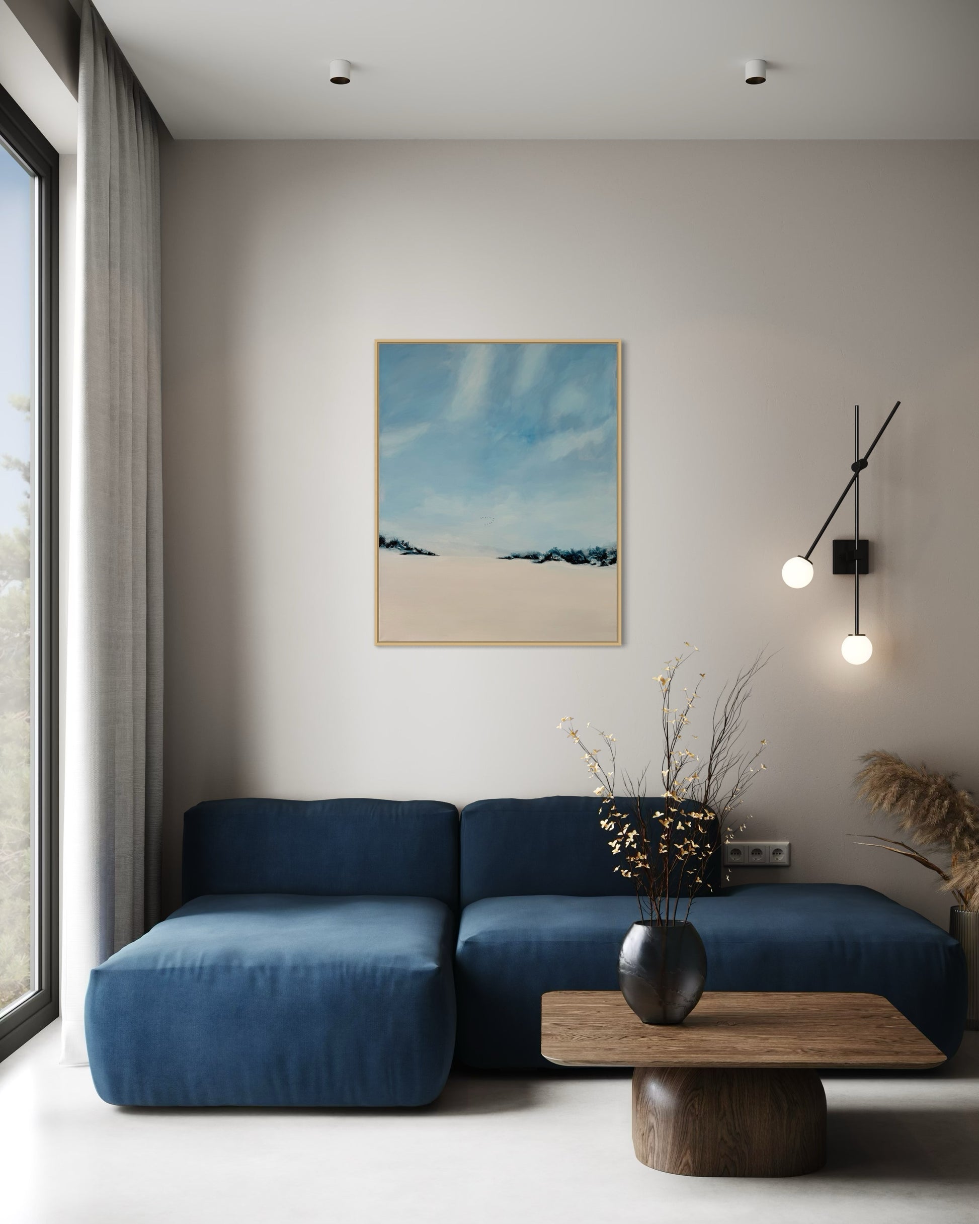 Das Gemälde ist mit Acrylfarben auf Leinwand gemalt und misst 100 x 80 cm. Es wird gerahmt geliefert – bereit, Räume mit Ruhe und Eleganz zu füllen. Ob im privaten Zuhause oder in stilvollen Empfangsbereichen, Praxen, Anwaltskanzleien, Hotels oder Meetingräumen: Dieses Werk bringt Leichtigkeit an die Wand – und in den Alltag.