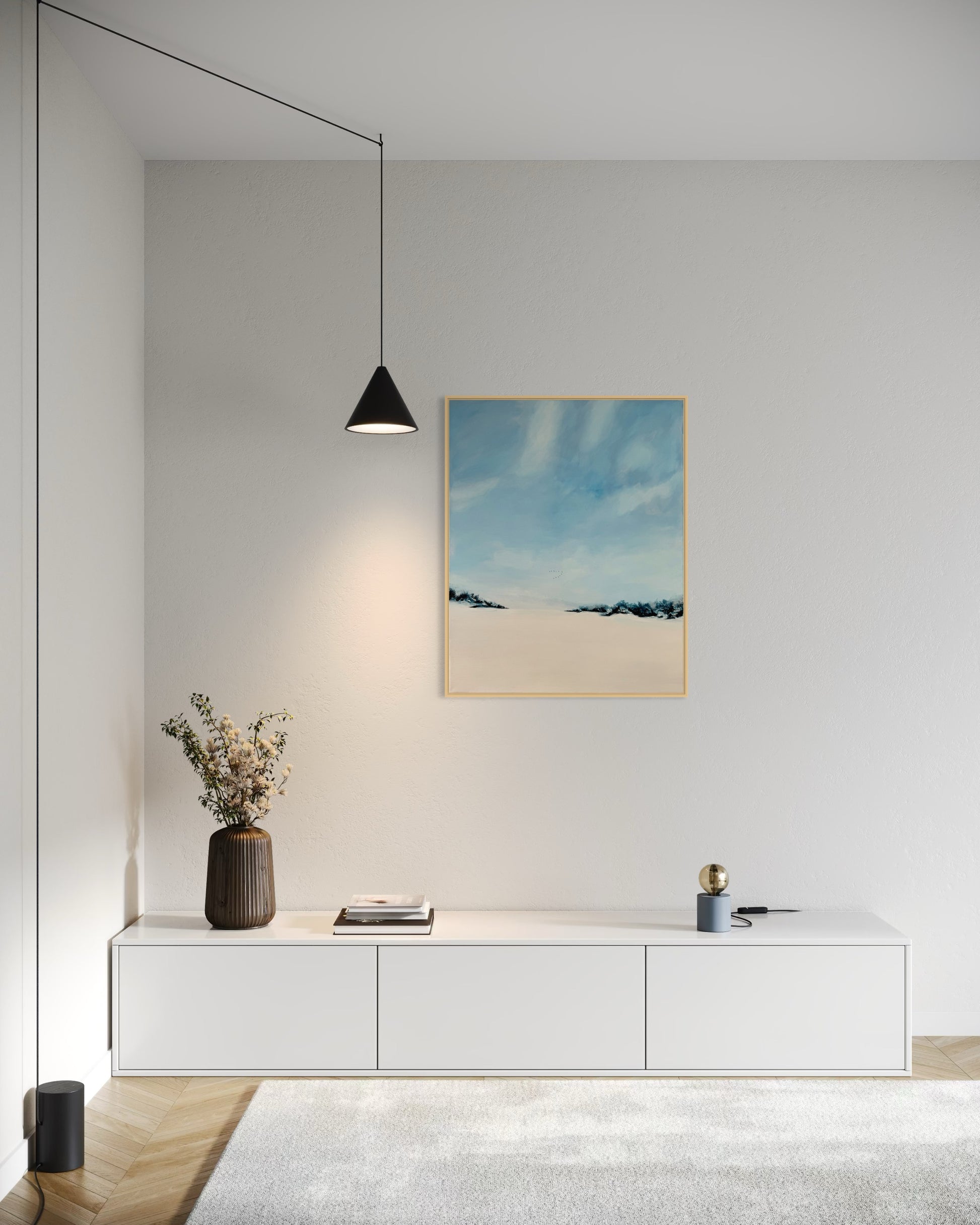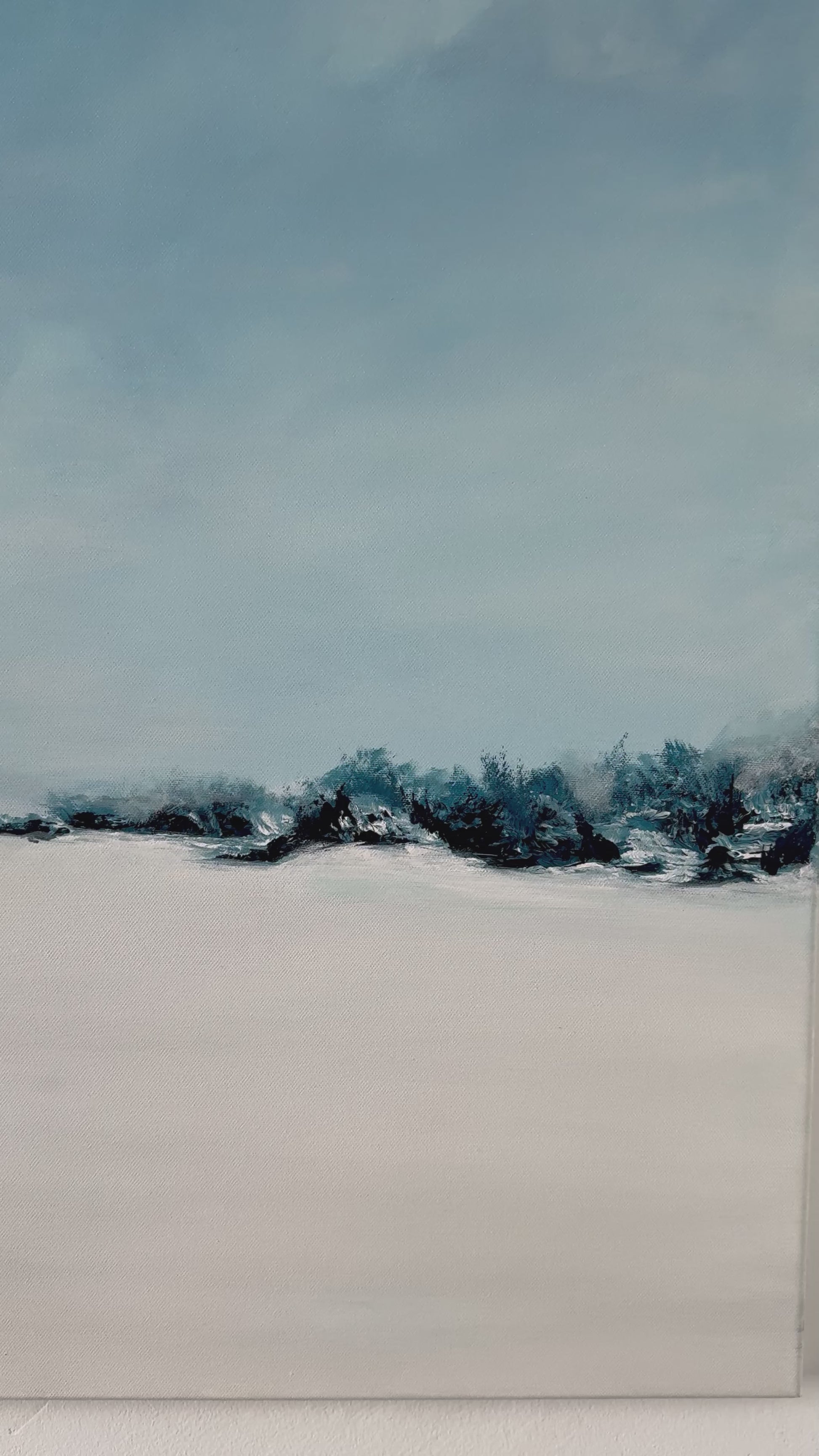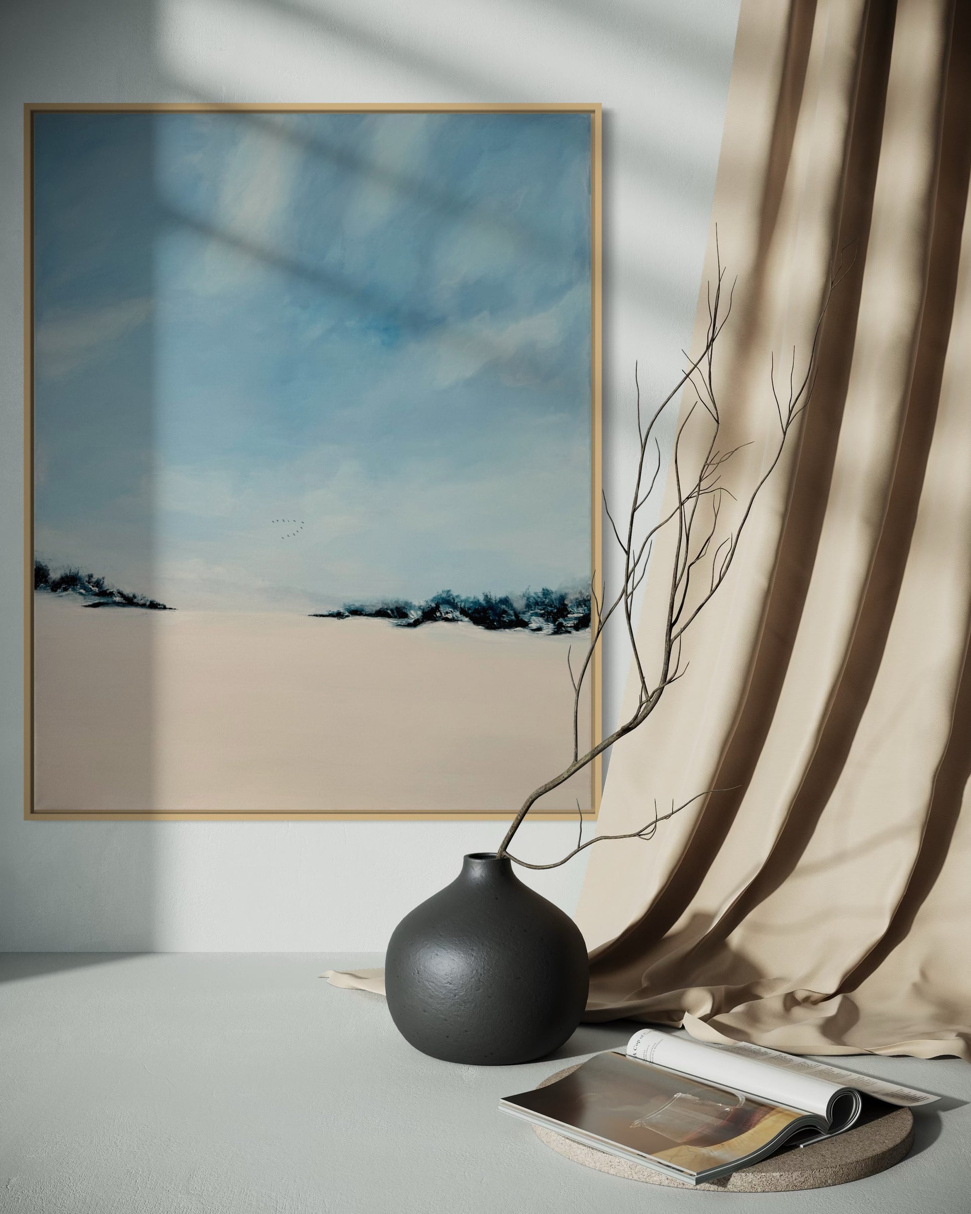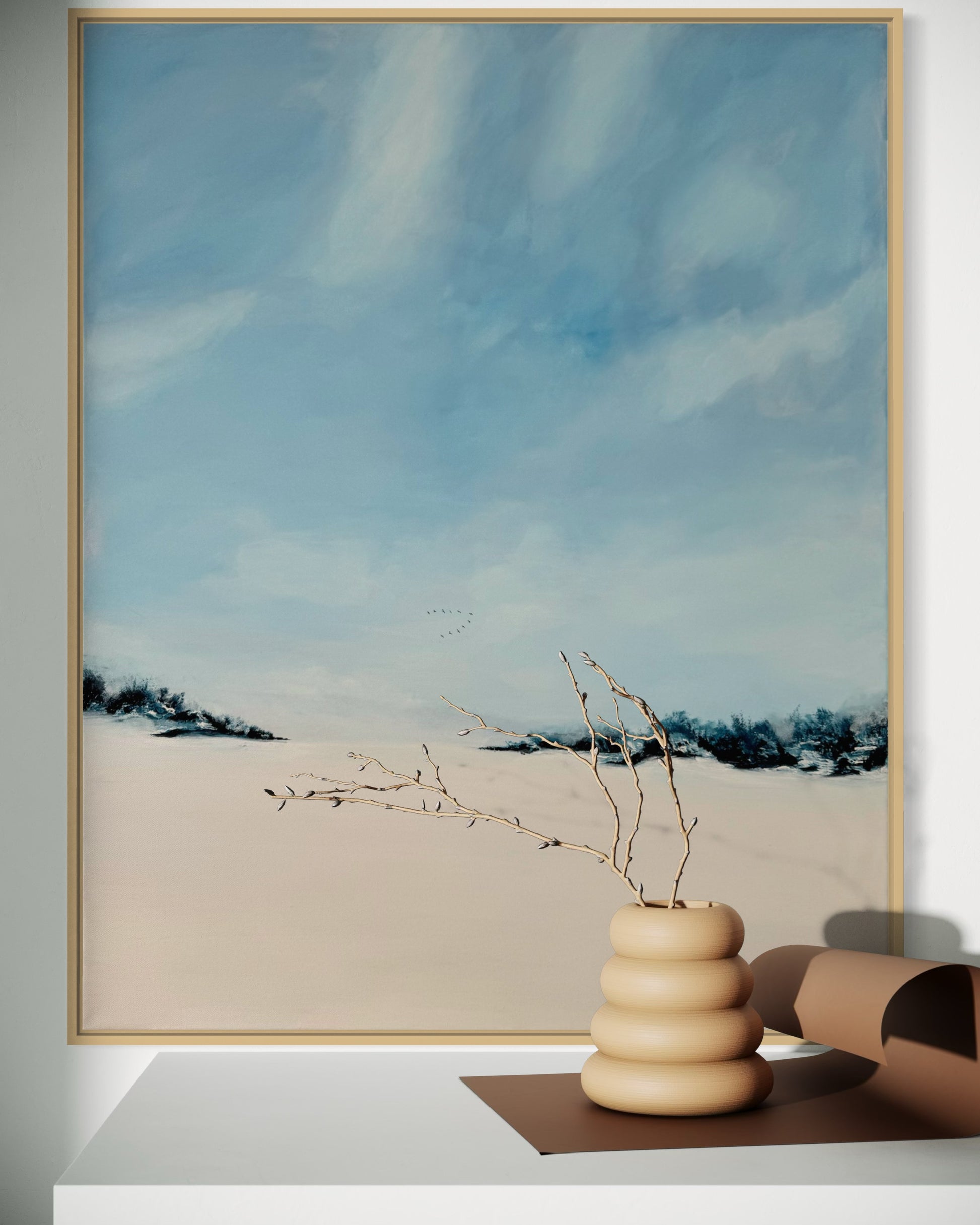 „A Breath“ ist Teil meiner Serie Balance – eine Sammlung ruhiger, klarer Werke, die der Stille und Weite Raum geben. Dieses Gemälde steht für Leichtigkeit, für das Innehalten, für diesen einen Atemzug, der alles entschleunigt.