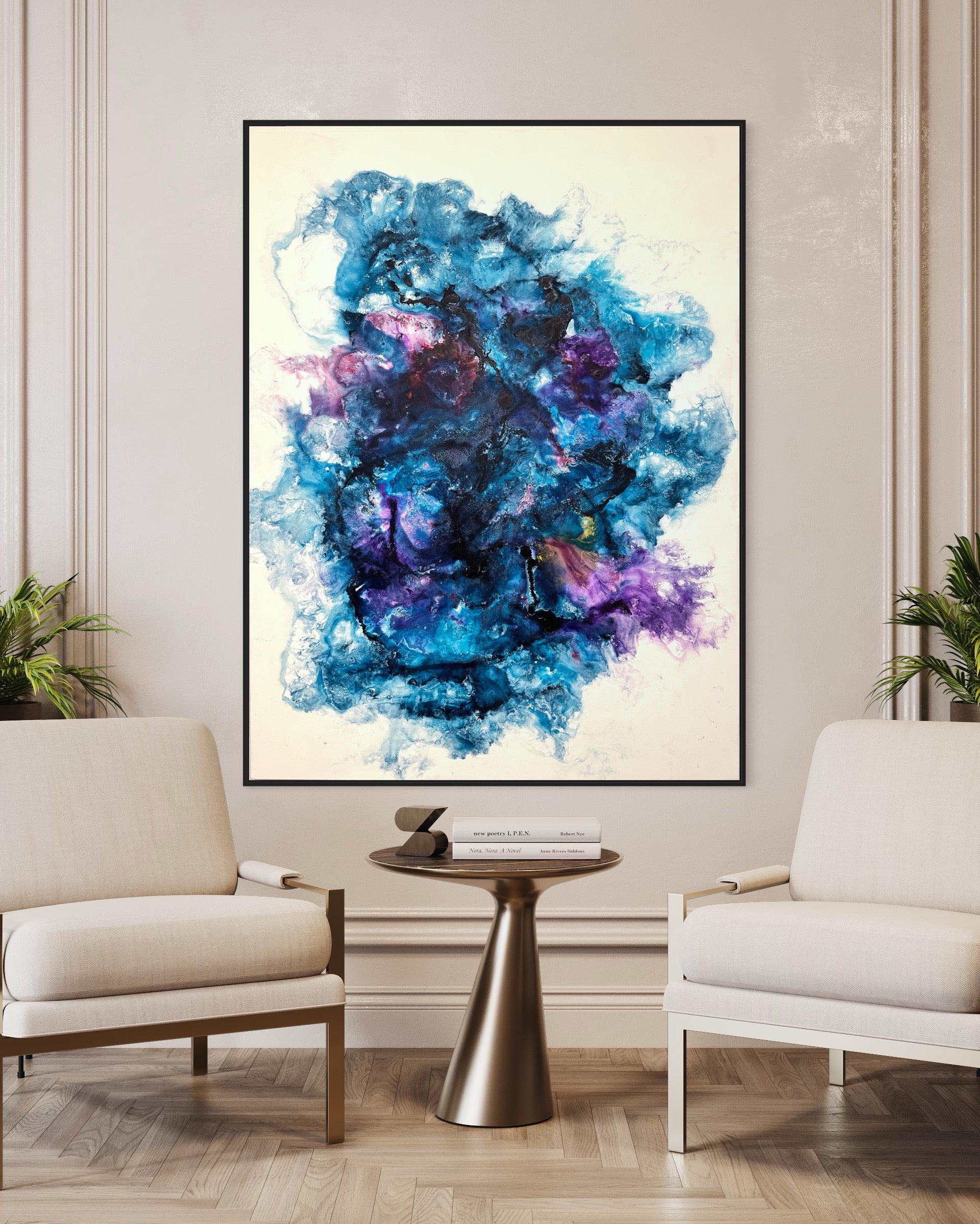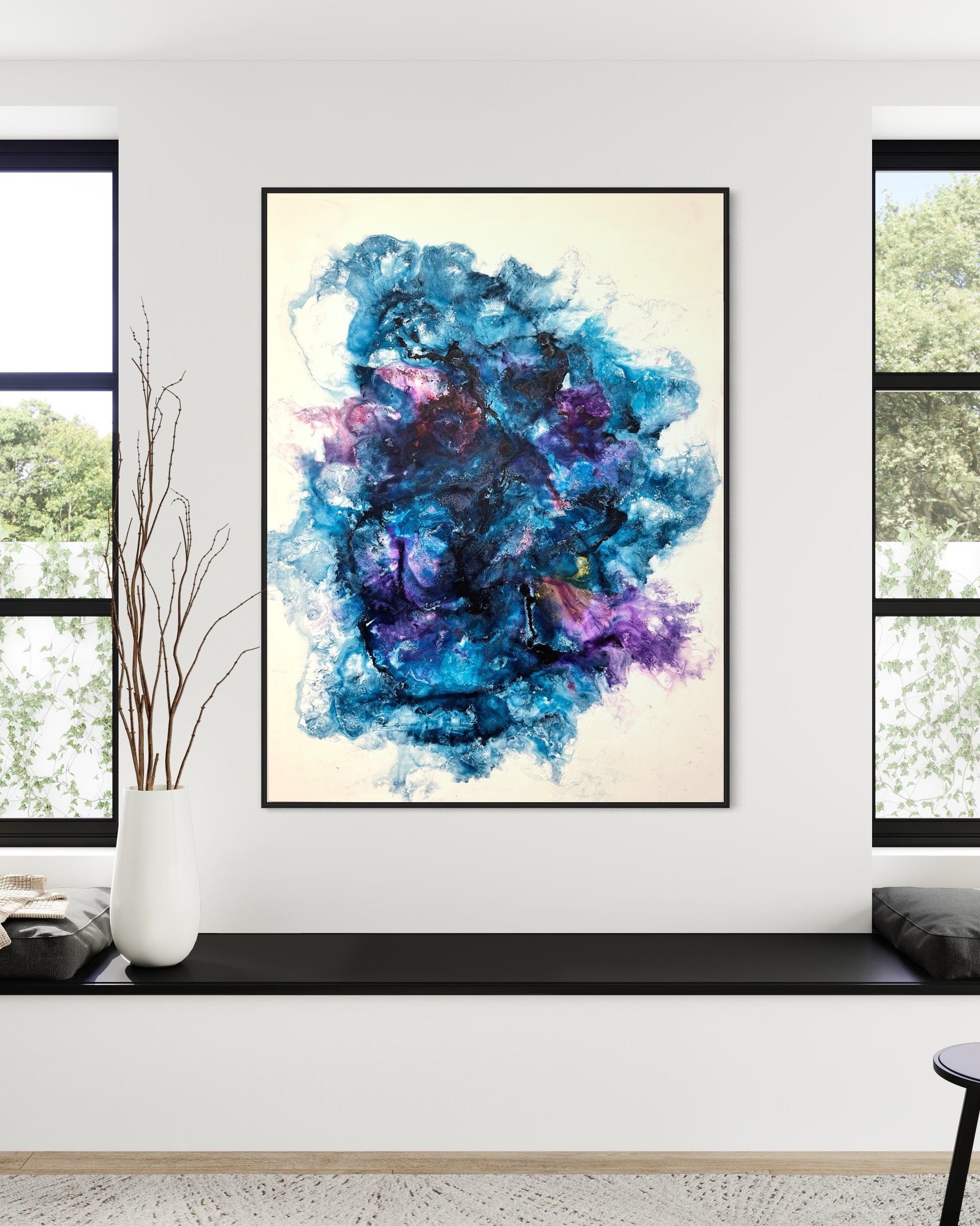 "Aura" besticht durch eine dynamische und zugleich harmonische Komposition, die eine tiefgreifende emotionale Resonanz erzeugt. Die satten, lebendigen Farben in Blau- und Violetttönen verschmelzen zu einem faszinierenden Spektrum, das die Blicke auf sich zieht und die Fantasie beflügelt. Die abstrakten Formen und fließenden Übergänge schaffen eine visuelle Tiefe, die dich in eine Welt voller Geheimnisse und Möglichkeiten entführt.