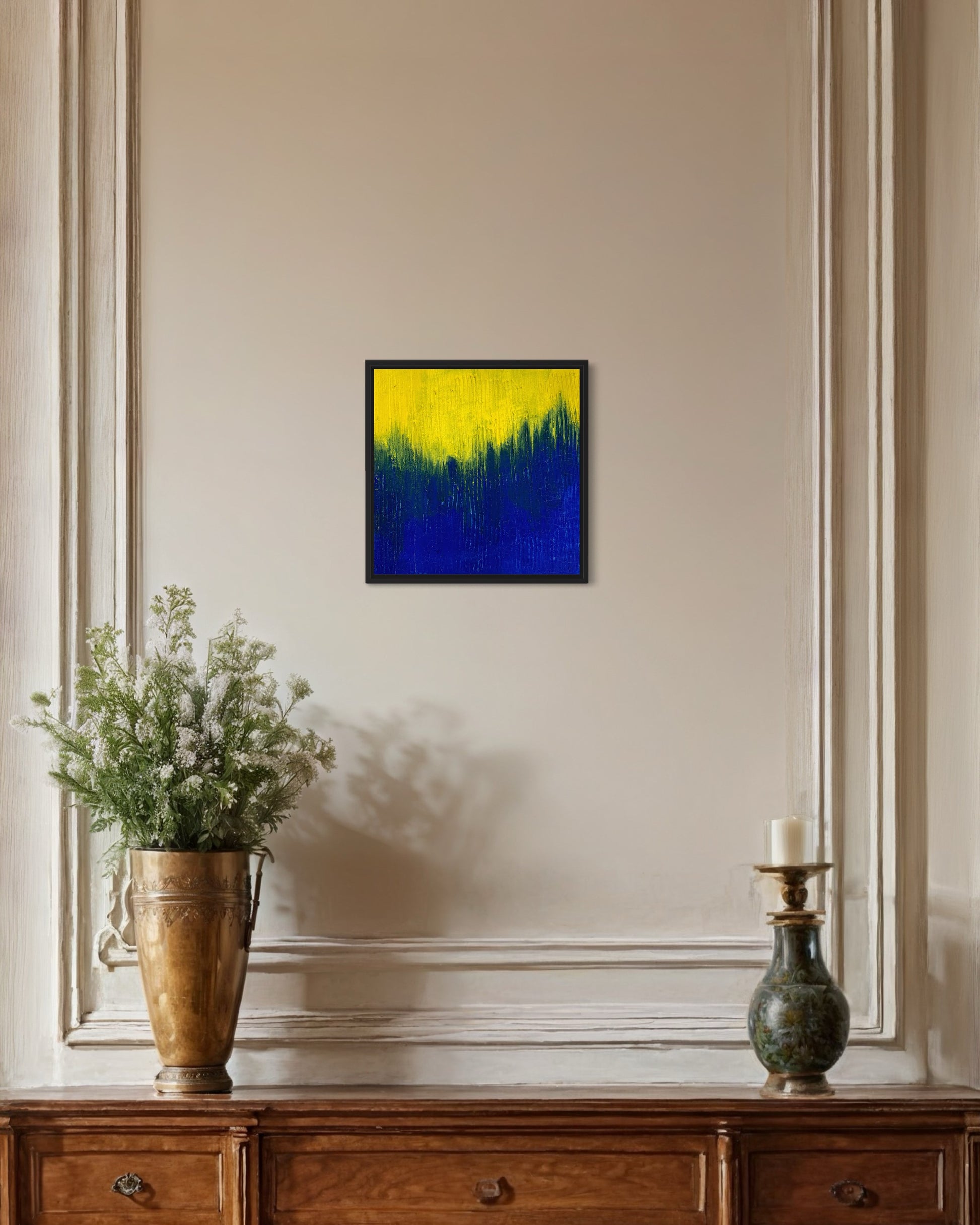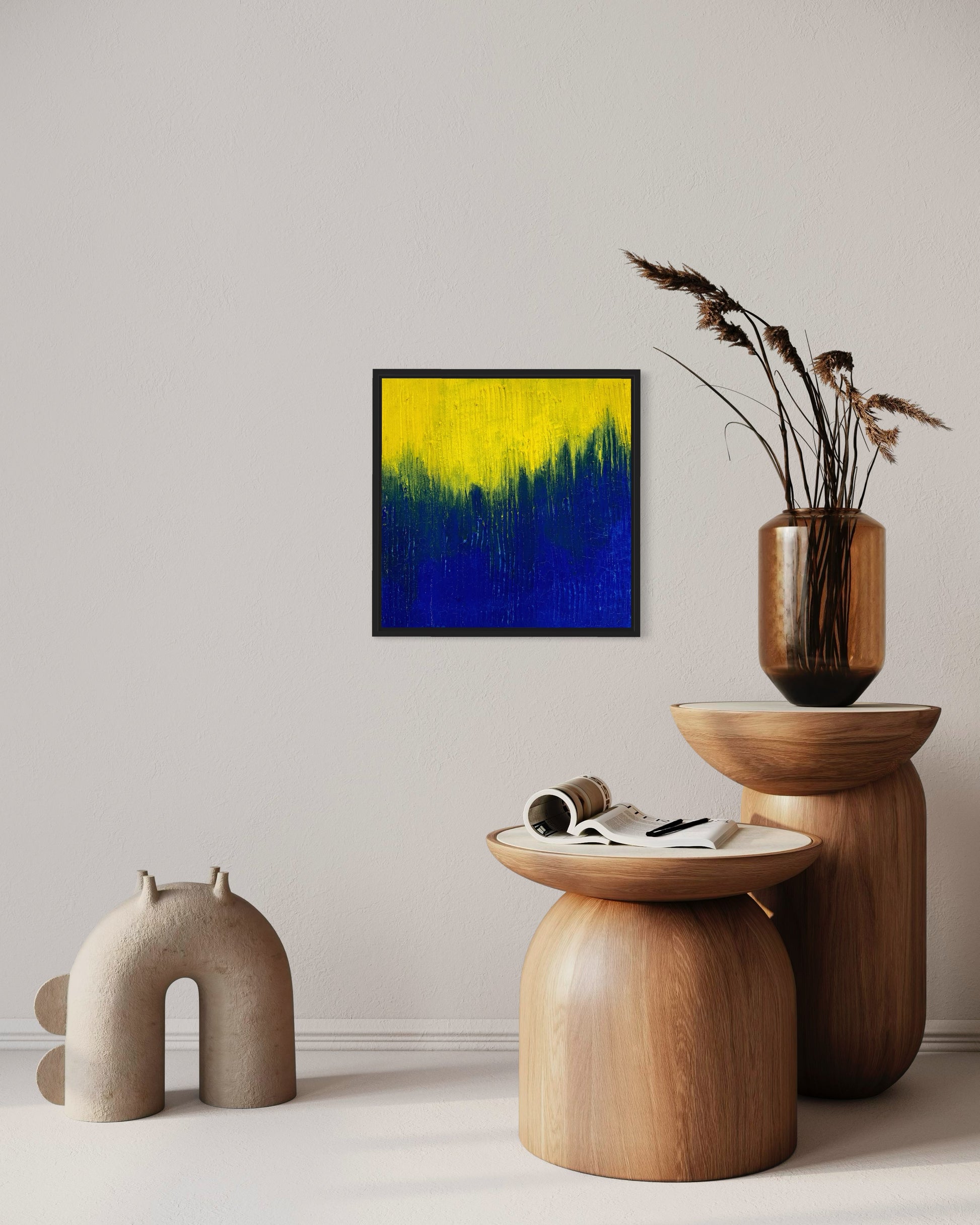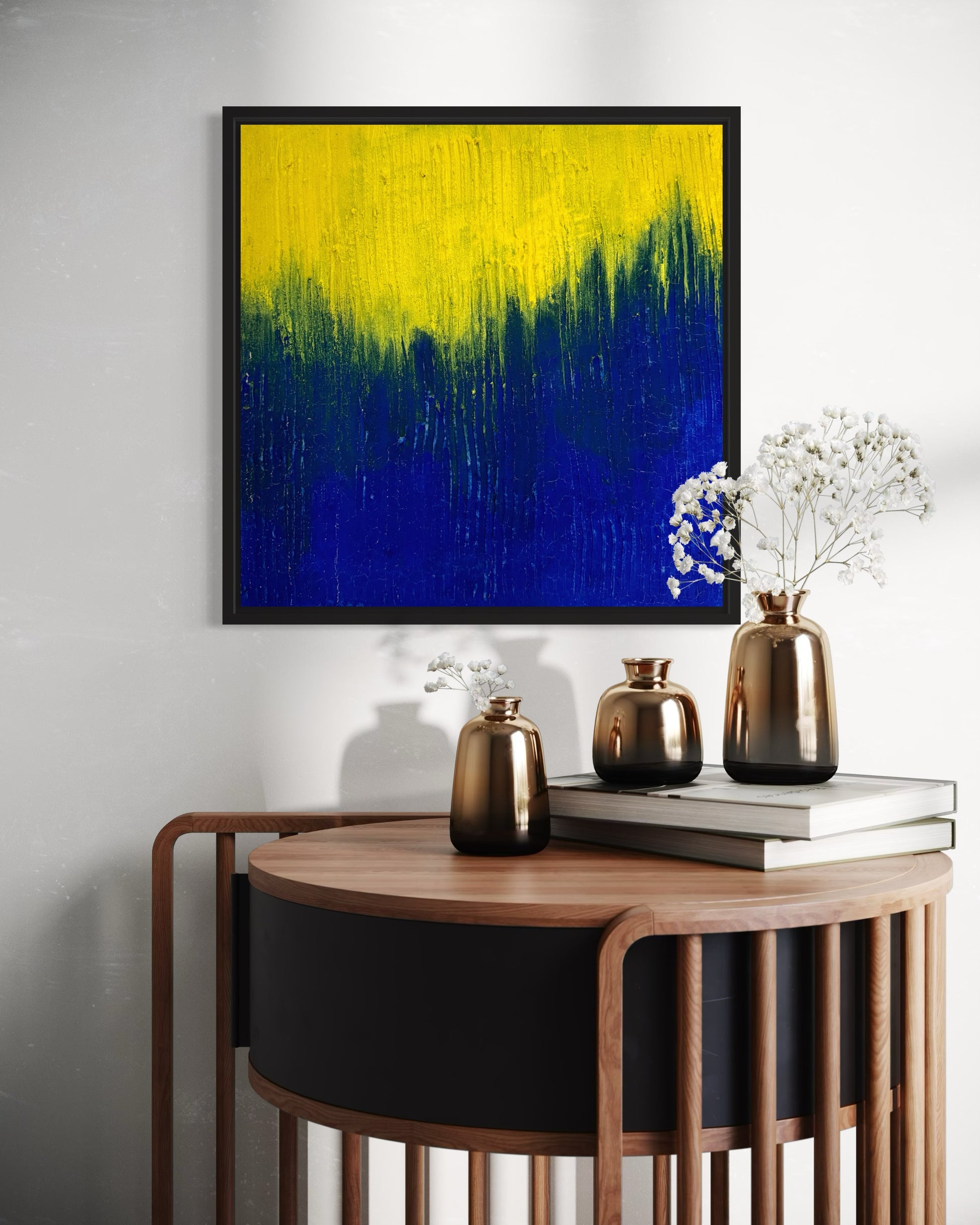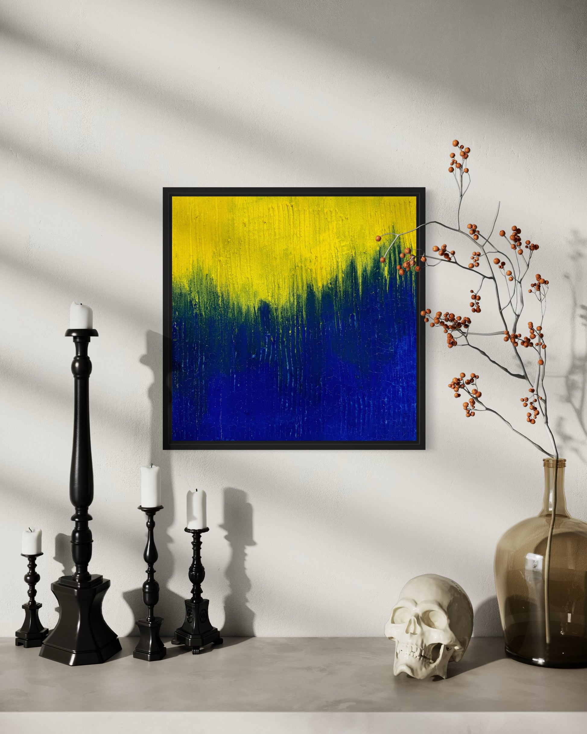 Hol dir frische Energie und zeitlose Eleganz in dein Zuhause mit "Rise", einem originalen Kunstwerk aus meiner Wabi-Sabi-Serie. Dieses handgemalte Bild in 40 x 40 cm wurde mit hochwertiger Acrylfarbe auf Leinwand gestaltet und verbindet kraftvolle Blautöne mit leuchtendem Gelb zu einer harmonischen Komposition.