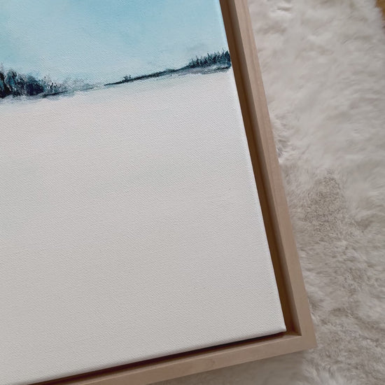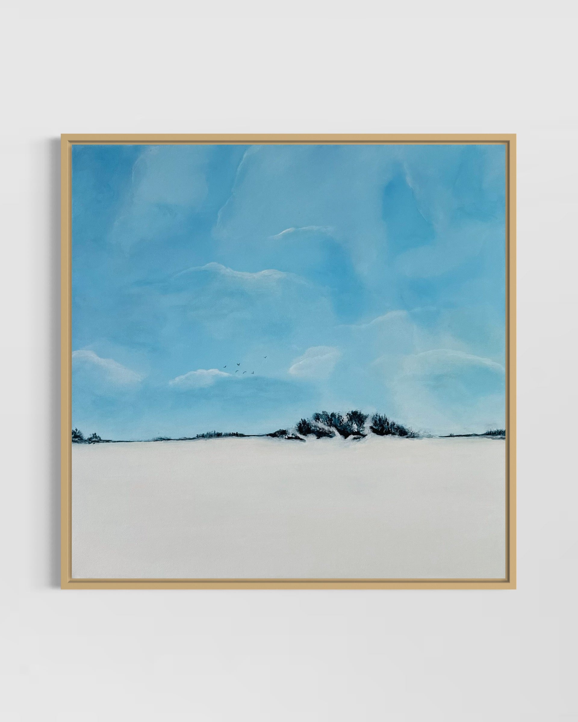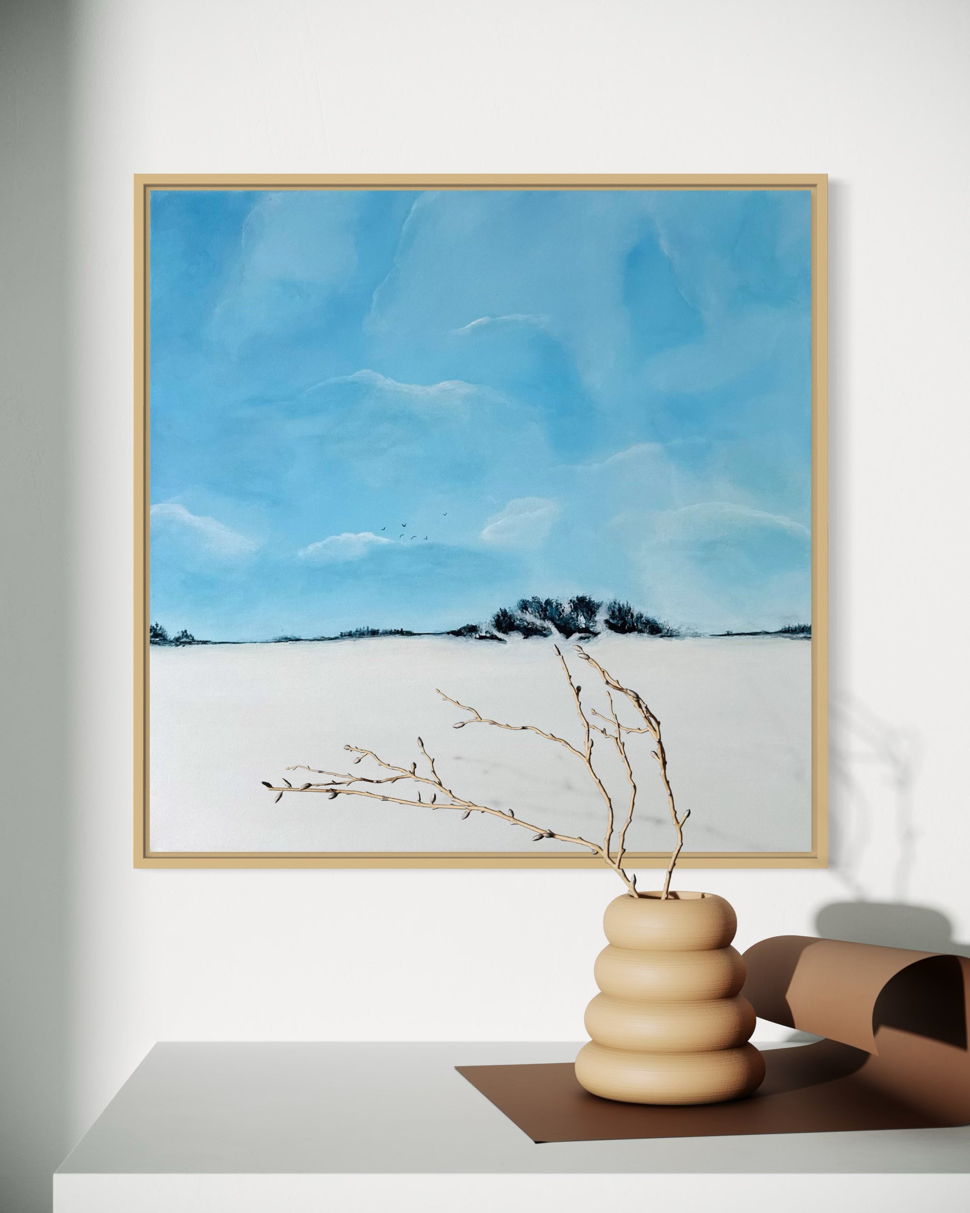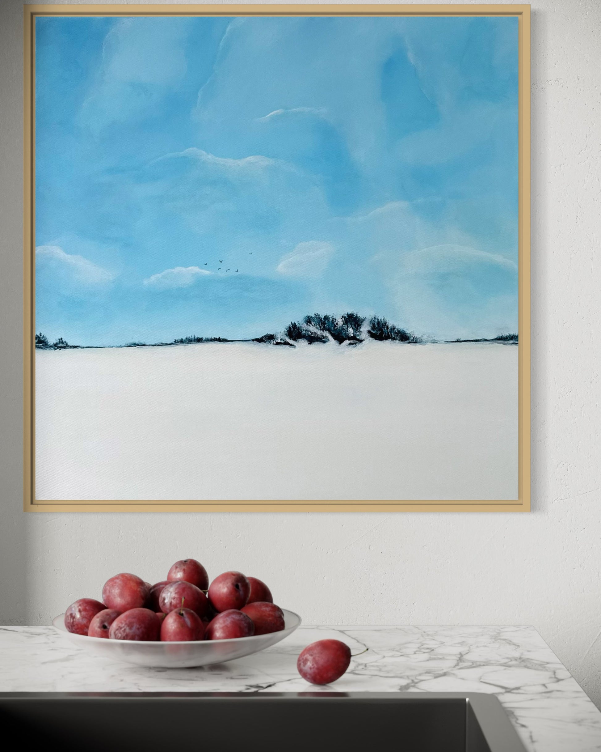 Here, Now ist ein meditatives Acrylgemälde, das durch seine reduzierte Farbpalette und die ruhige Komposition eine Atmosphäre von Klarheit und innerer Balance schafft. Die weite Meereslandschaft trifft auf einen sanften, wolkigen Himmel, durchzogen von einer feinen Linie fliegender Vögel – ein Moment der Stille und Präsenz.