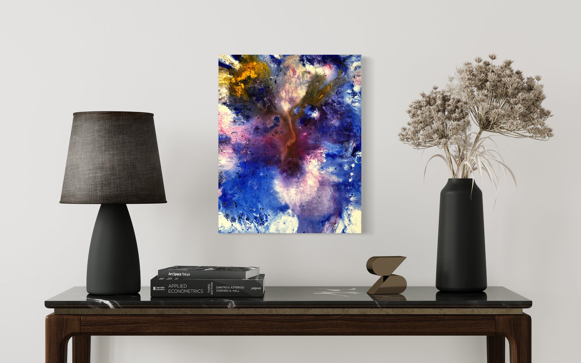 Das Gemälde "Universum" spiegelt die grenzenlose Schönheit des Universums wider, ohne sich an konkrete Formen zu binden. Die harmonische Kombination von Blau, Weiß, Lila und Gelb erzeugt eine beruhigende, dennoch kraftvolle Aura. Das abstrakte Design fügt sich mühelos in verschiedene Innenräume ein und verleiht jedem Raum eine zeitlose Eleganz.