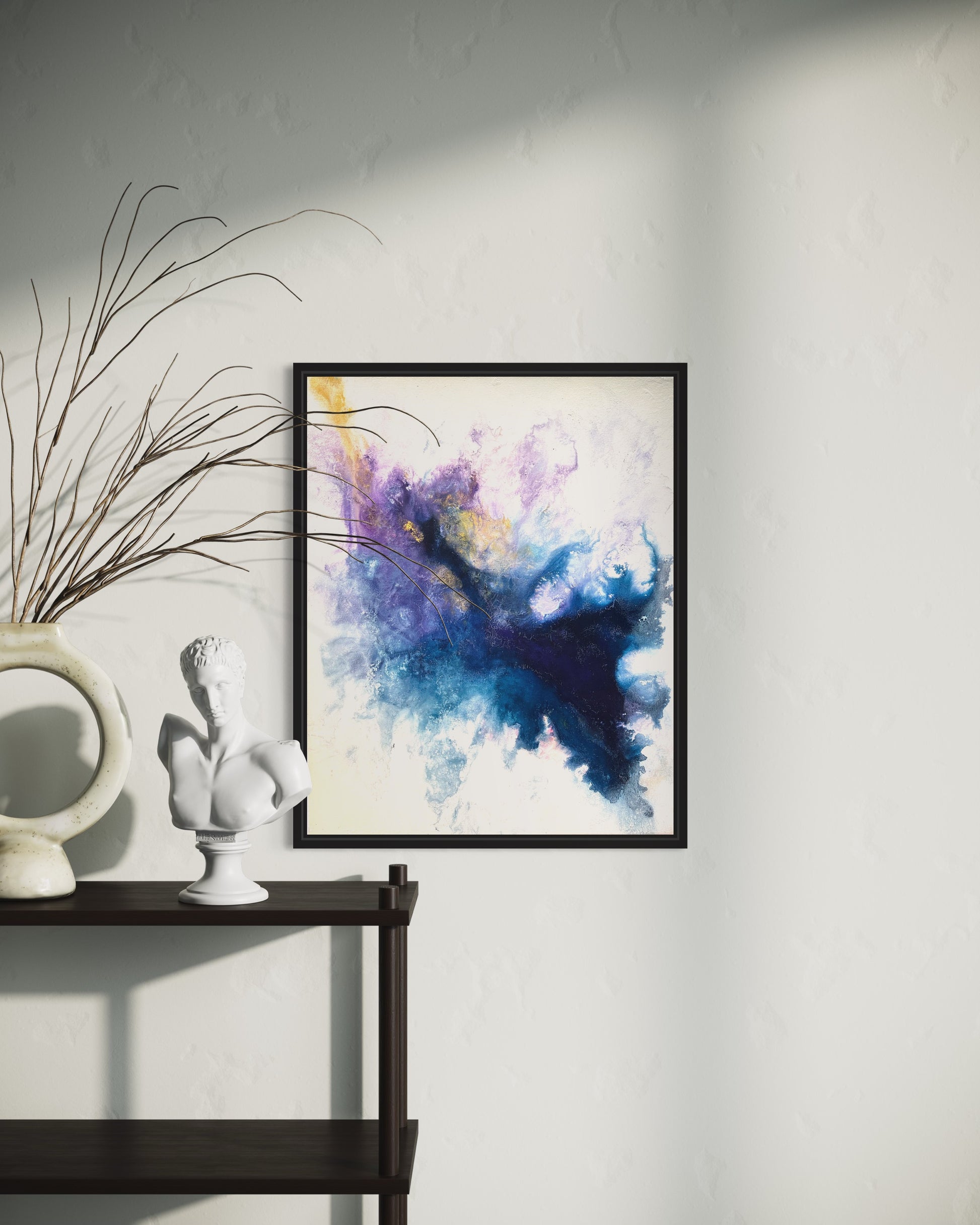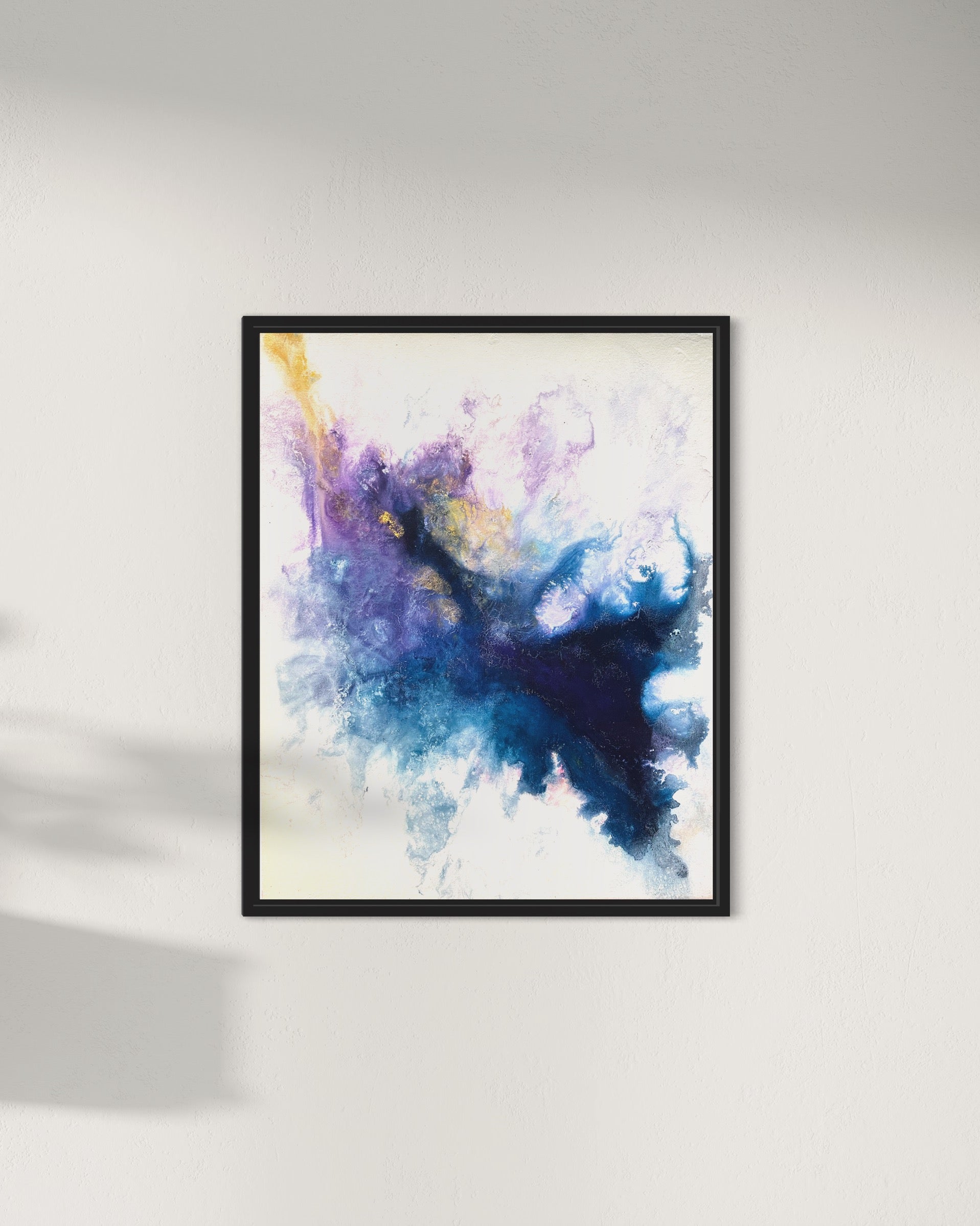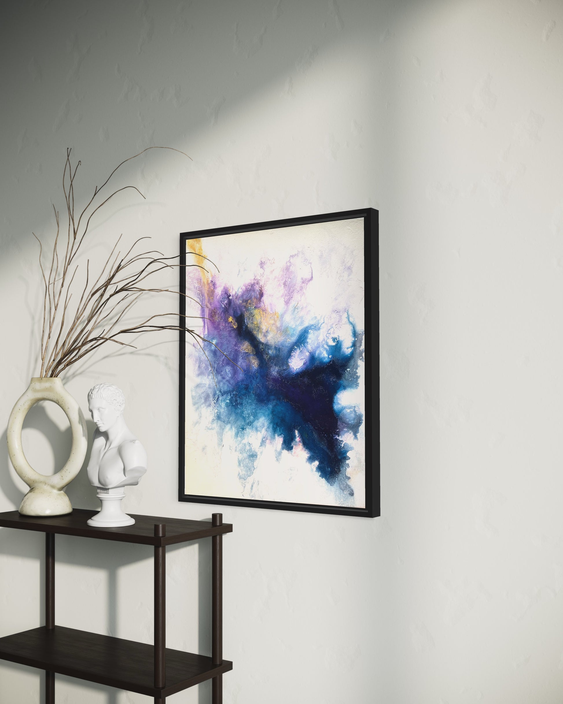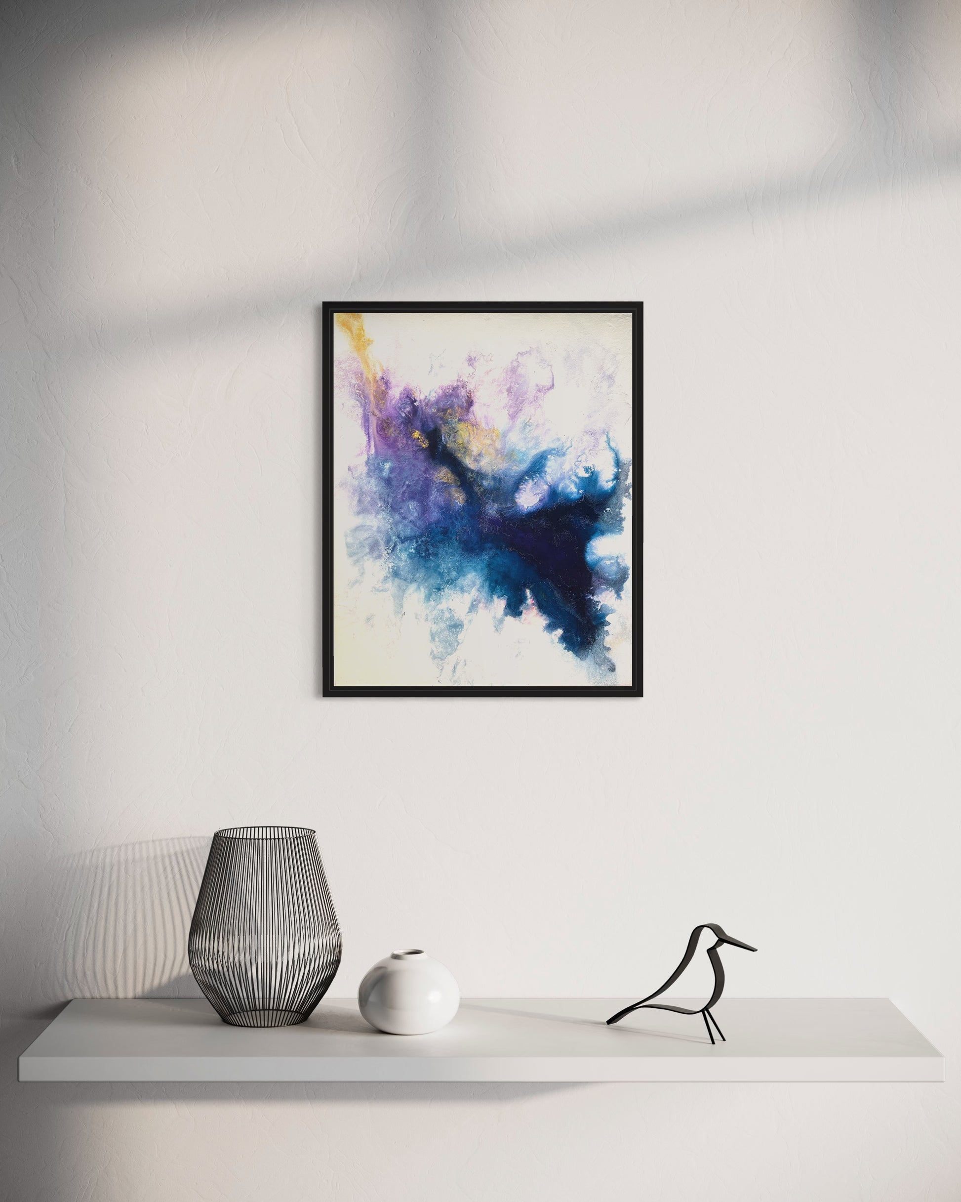 Tauche ein in die faszinierende Anziehungskraft von "Spiel von Licht in der Dunkelheit", einem mitreißenden abstrakten Kunstwerk im Format 60x50. Dieses Kunstwerk, präzise und mit Leidenschaft gefertigt, kombiniert eine reiche Farbpalette aus Blau, Lila, Gold und Weiß, um eine Symphonie von Emotionen zu erzeugen.