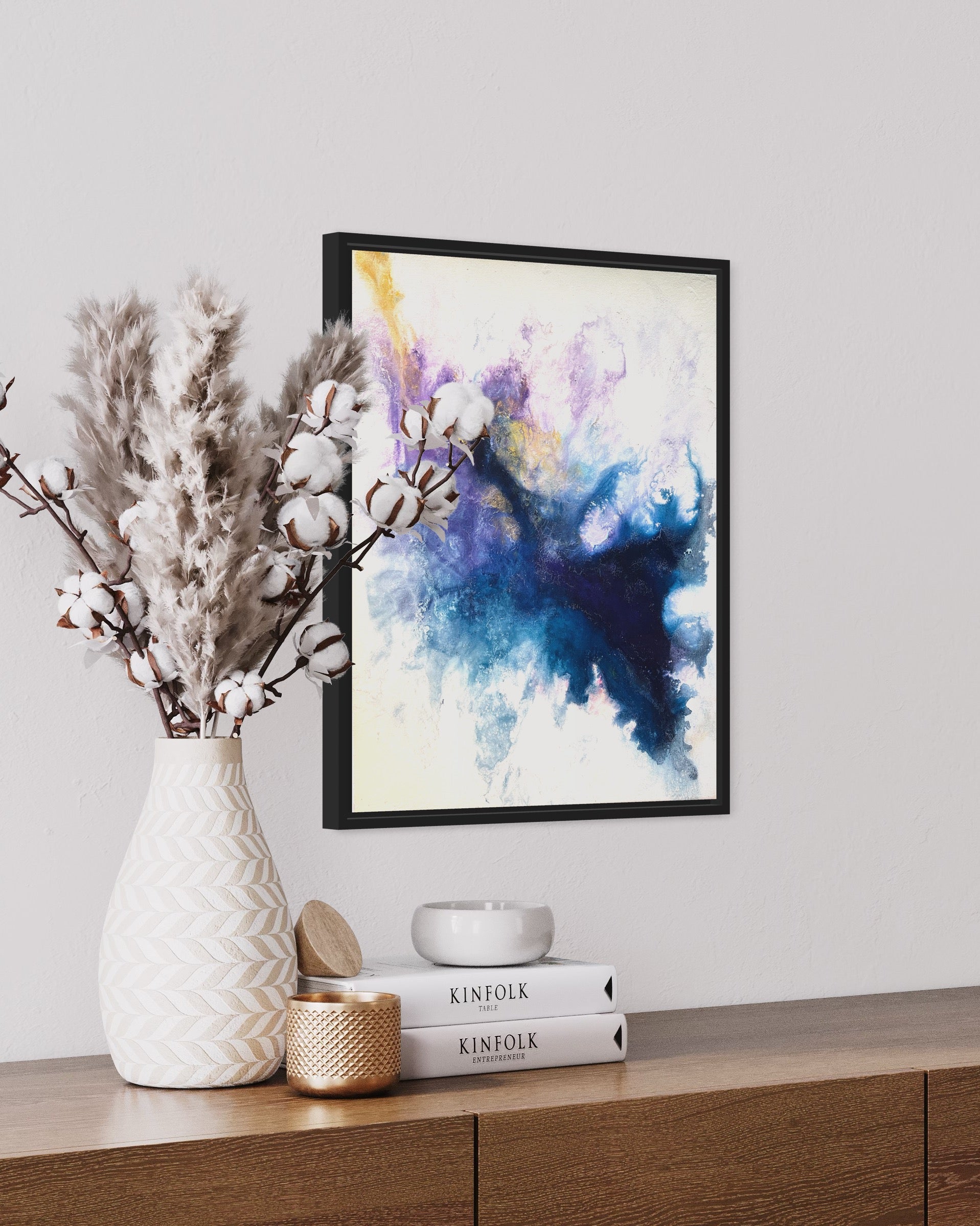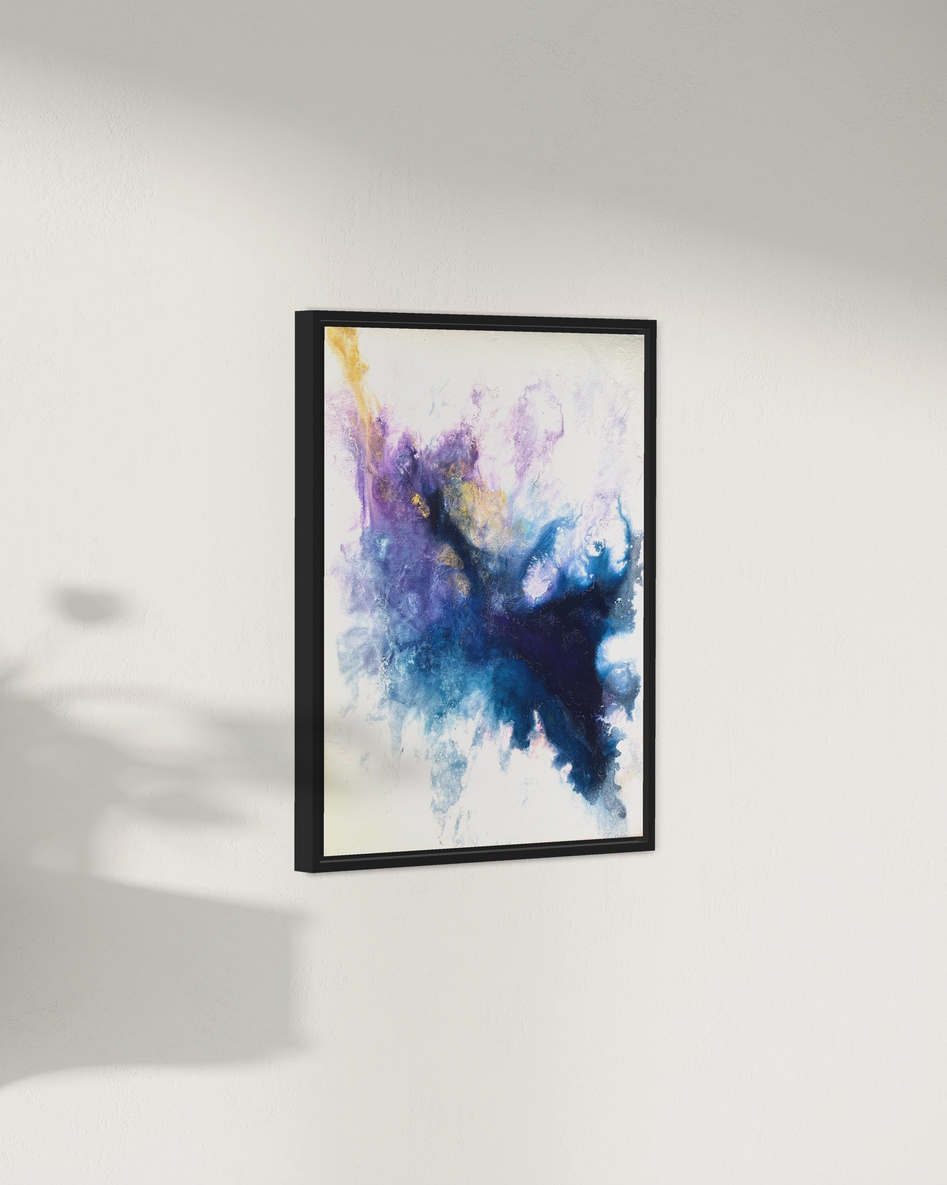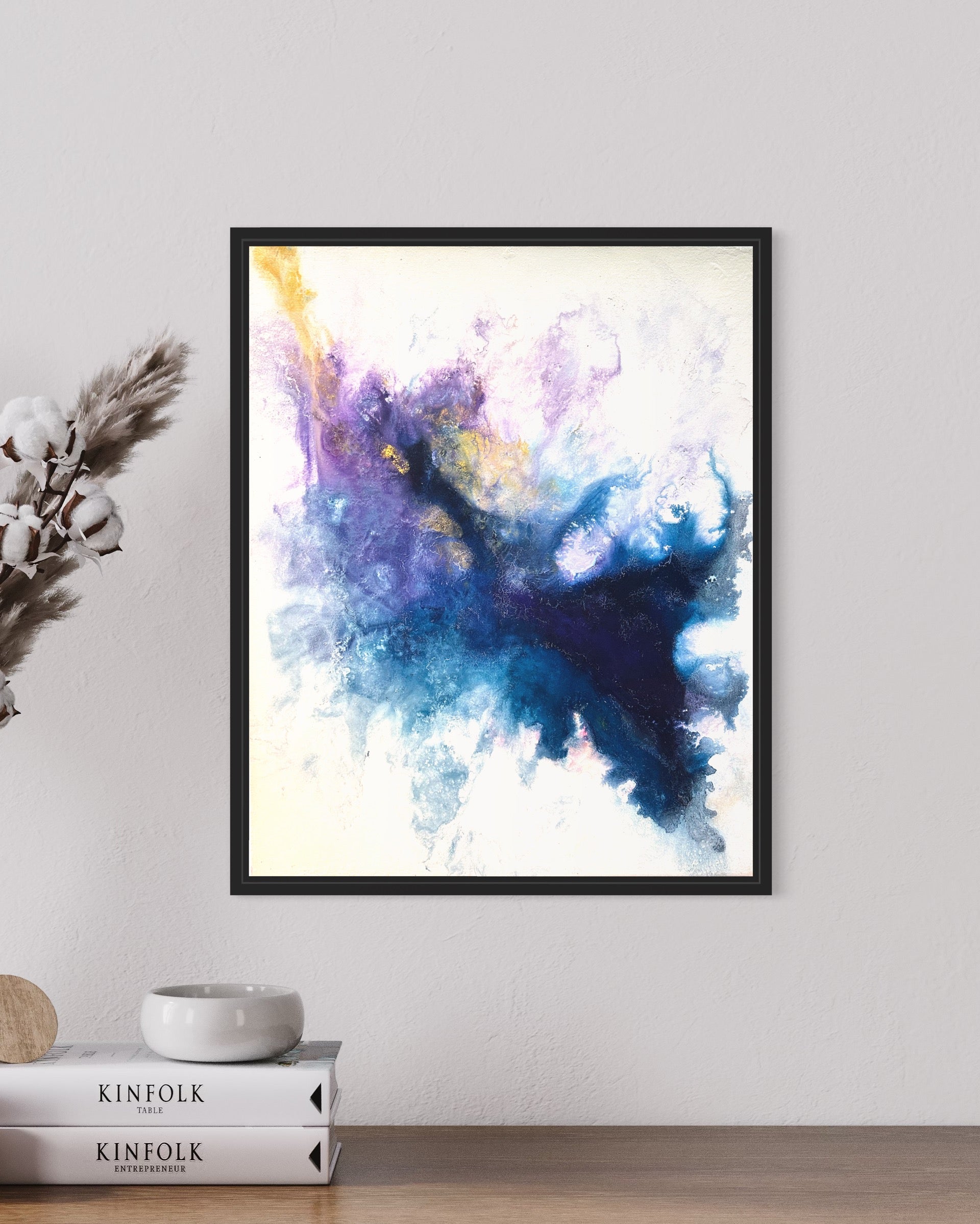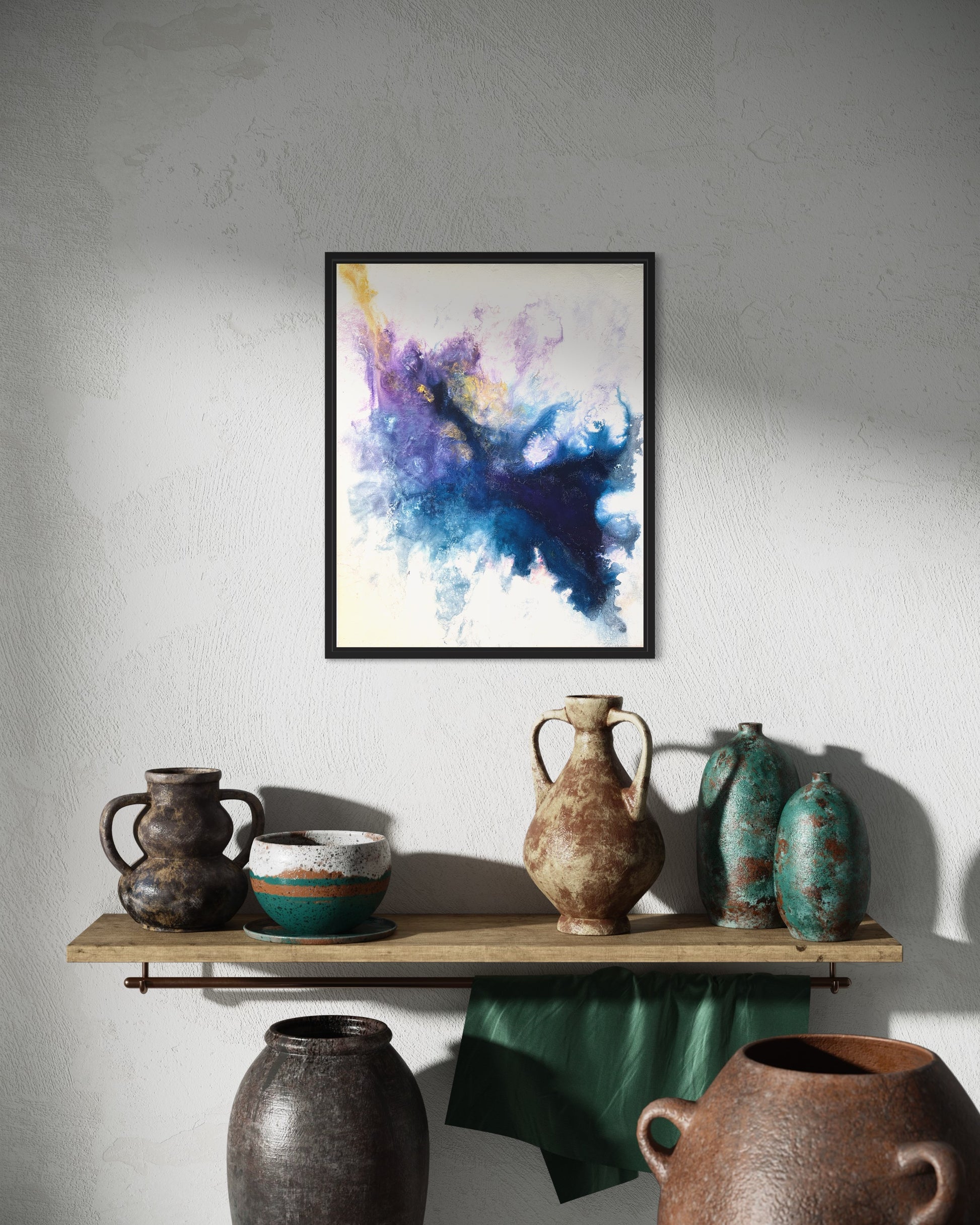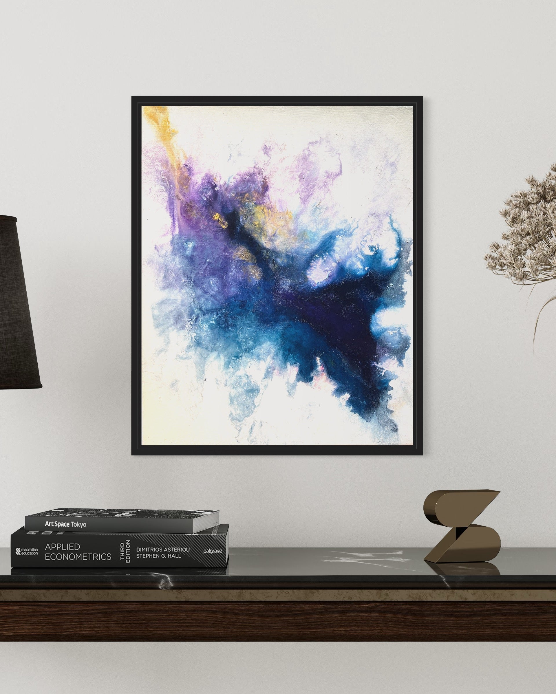 Tauche ein in die faszinierende Anziehungskraft von "Spiel von Licht in der Dunkelheit", einem mitreißenden abstrakten Kunstwerk im Format 60x50. Dieses Kunstwerk, präzise und mit Leidenschaft gefertigt, kombiniert eine reiche Farbpalette aus Blau, Lila, Gold und Weiß, um eine Symphonie von Emotionen zu erzeugen.
